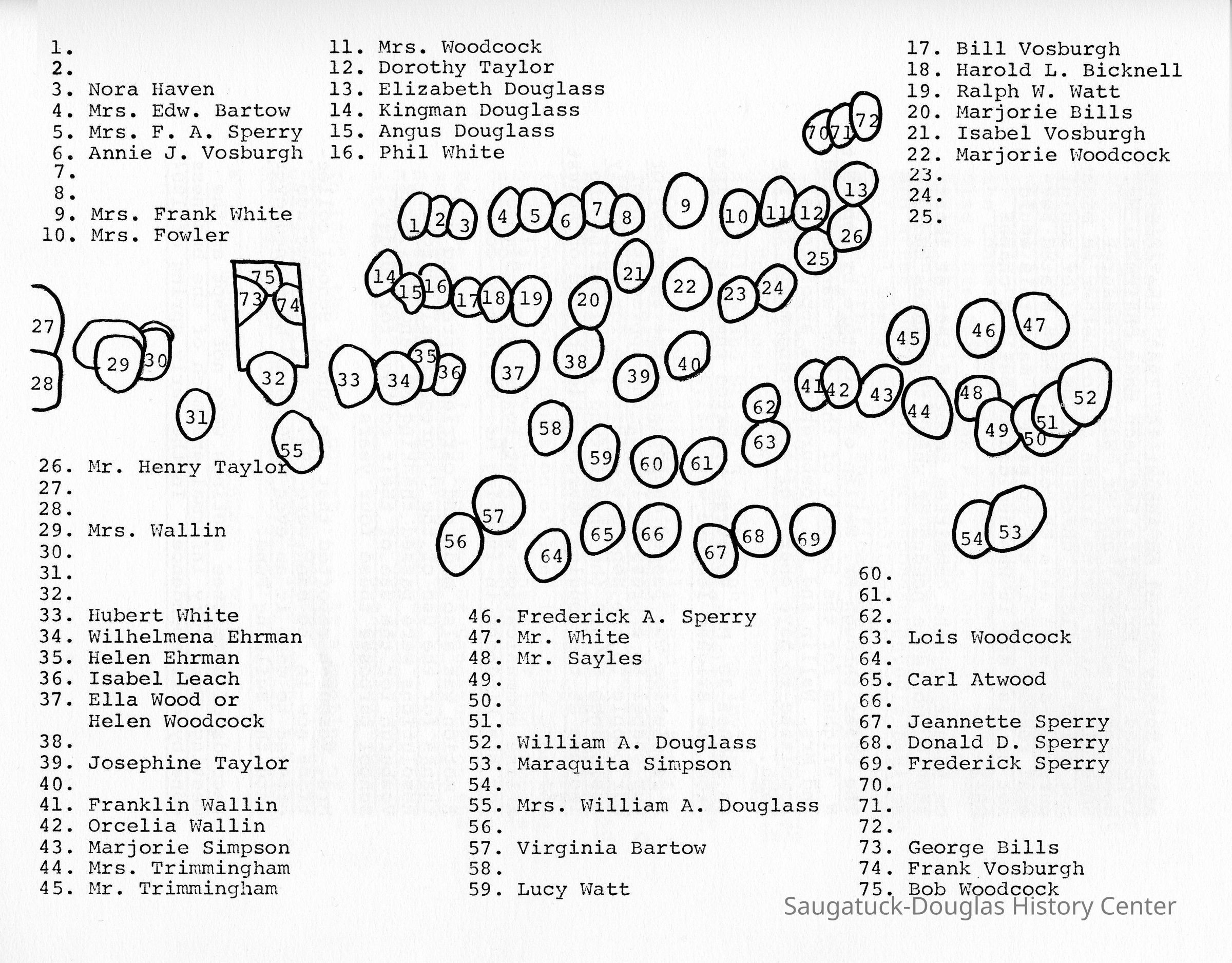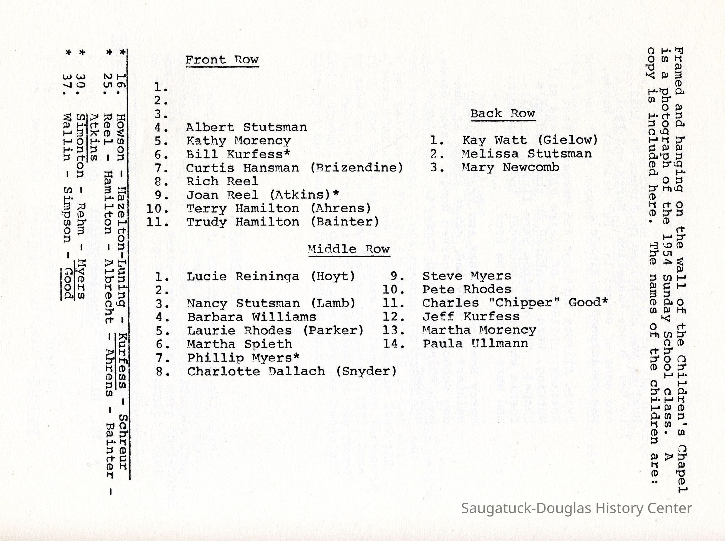 Two scans of photos of the Lakeshore Chapel Sunday School classes of 1903 and 1954. Each photo includes a diagram that names some of the people pictured.Photograph Details