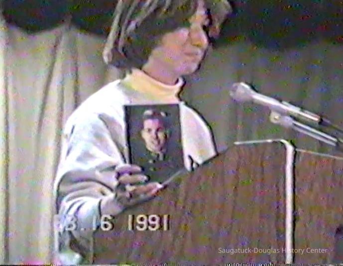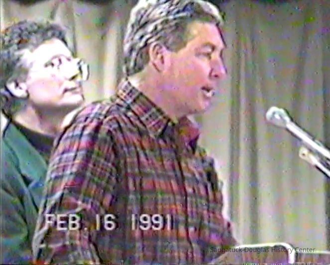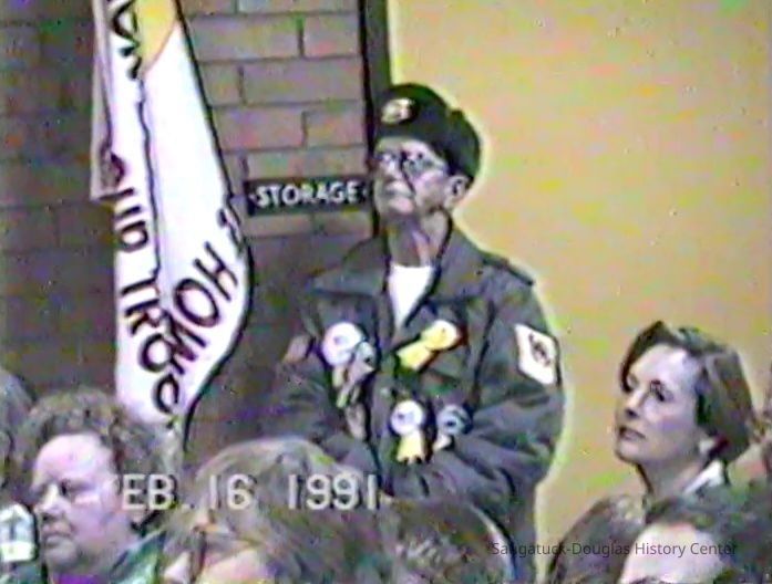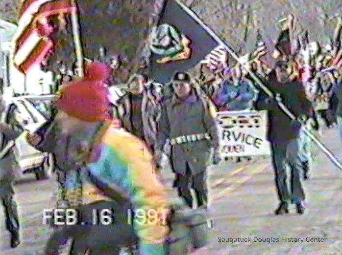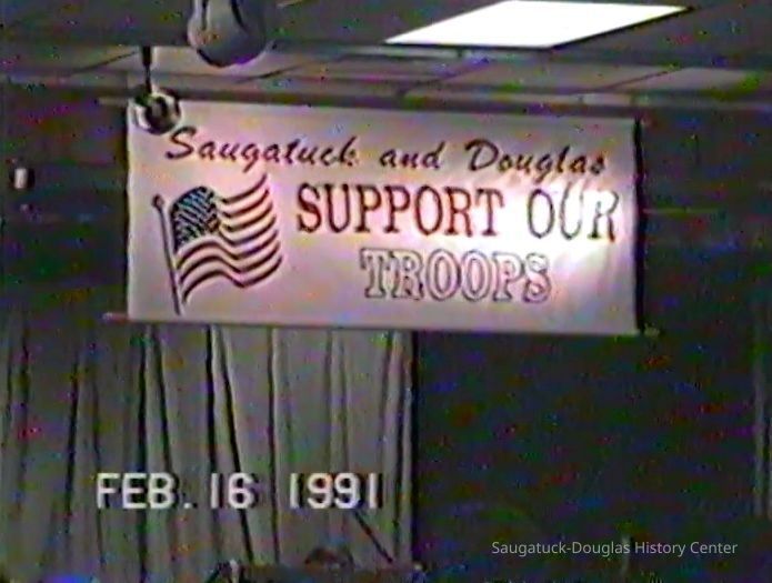The Warren DeJonge recording of the rally at Saugatuck High School opens with a preamble of yellow ribbons and flags along slushy Center Street, driving to Saugatuck with the parade marchers, cars and fire trucks, and the rally from the left side of the stage.