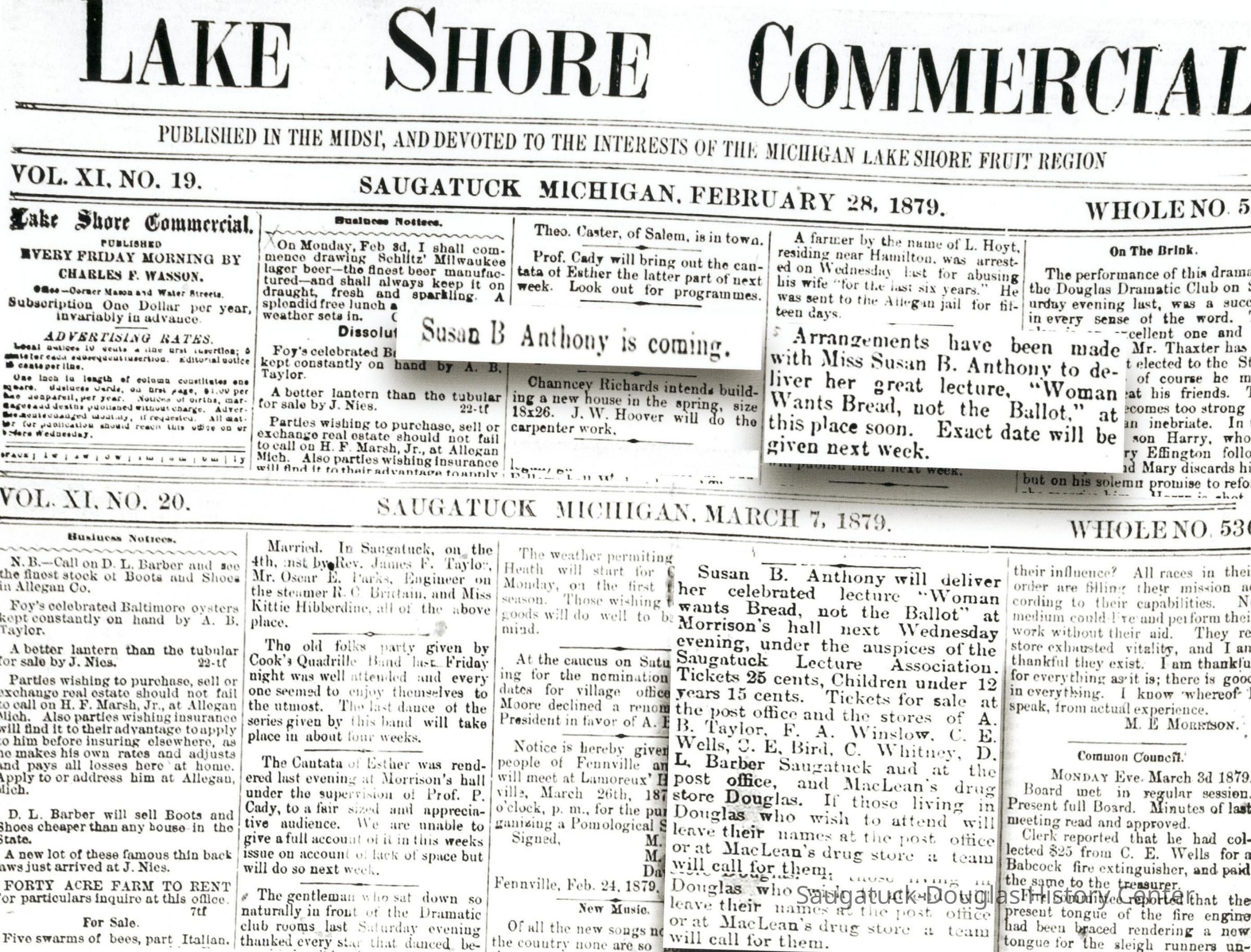 Massachusetts born Susan Brownell Anthony was an early advocate of giving the women the vote, and in l869 had organized the National Woman' s Suffrage Association. Then set out stumping the country for the case. In March of 1879 she had a scheduled lecture at the Powers Opera House in Grand Rapids, and at some point of her stay in the state was approached by Mrs. Tamara Phillips Moore, the wife of Horace Moore, an early saw mill owner, who asked Miss Anthony to come to Saugatuck. The event was announced in the February 28, 1879 issue of the Lake Shore Commercial.
