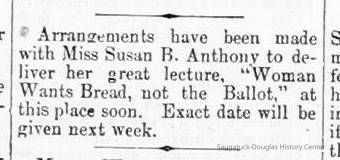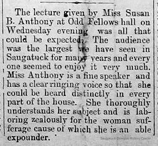 Text and images from SDHS newsletter insert, pages 406-408, about Susan B. Anthony's 1879 visit to Saugatuck.Context