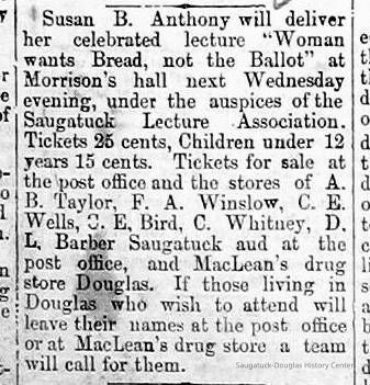 In Saugatuck there was a real attempt at cracking down on saloons - for a while. Susan B. Anthony died in 1906 at the age of 86 without seeing her dream come true. The vote was finally extended to women, nationwide, with the ratification of the 19th amendment in 1920.Collection