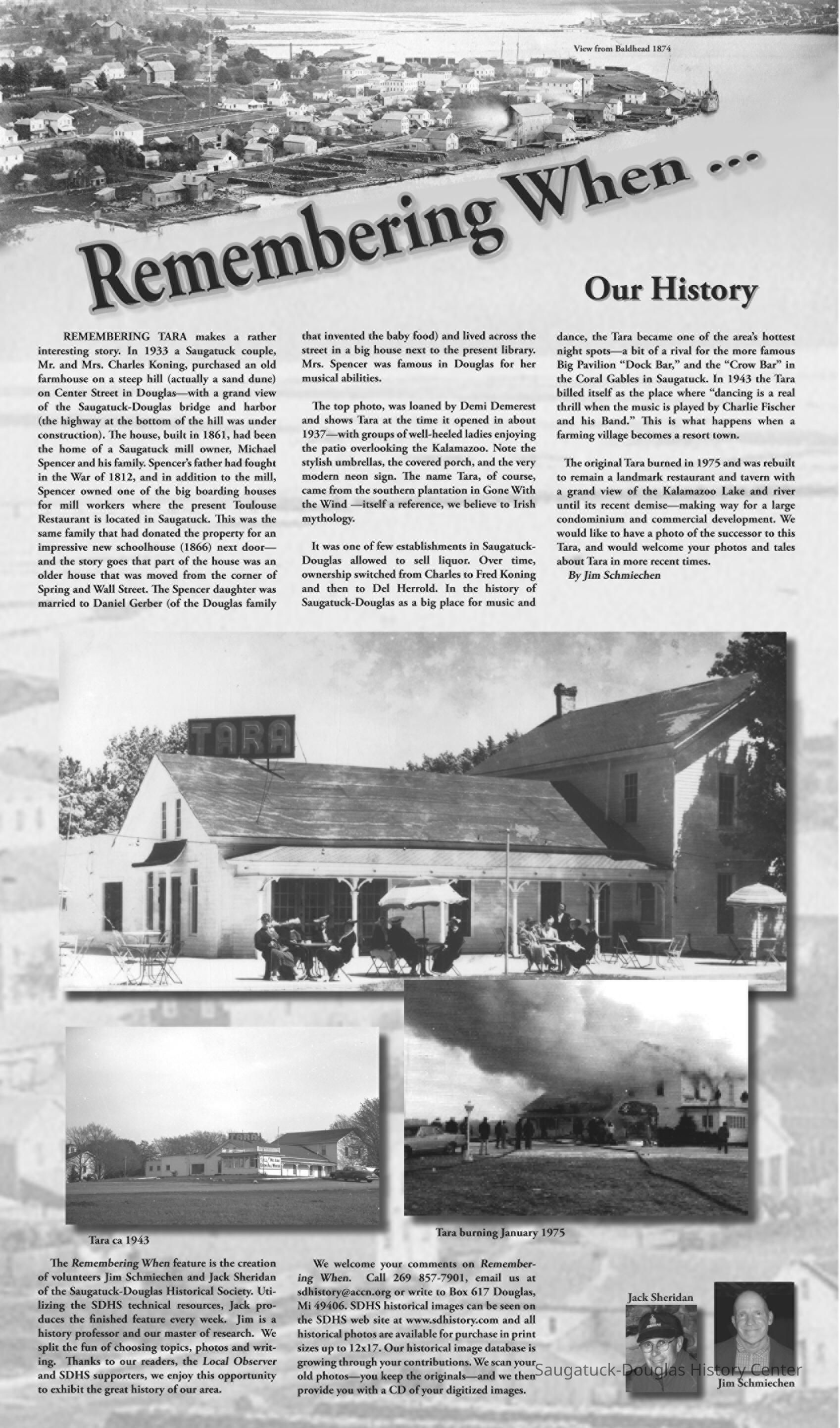 REMEMBERING TARA makes a rather interesting story. In 1933 a Saugatuck couple, Mr. and Mrs. Charles Koning, purchased an old farmhouse on a steep hill (actually a sand dune) on Center Street in Douglas—with a grand view of the Saugatuck-Douglas bridge and harbor (the highway at the bottom of the hill was under construction). The house, built in 1861, had been the home of a Saugatuck mill owner, Michael Spencer and his family. Spencer’s father had fought in the War of 1812, and in addition to the mill, Spencer owned one of the big boarding houses for mill workers where the present Toulouse Restaurant is located in Saugatuck. This was the same family that had donated the property for an impressive new schoolhouse (1866) next door—and the story goes that part of the house was an older house that was moved from the corner of Spring and Wall Street. The Spencer daughter was married to Daniel Gerber (of the Douglas family that invented the baby food) and lived across the street in a big house next to the present library. Mrs. Spencer was famous in Douglas for her musical abilities.