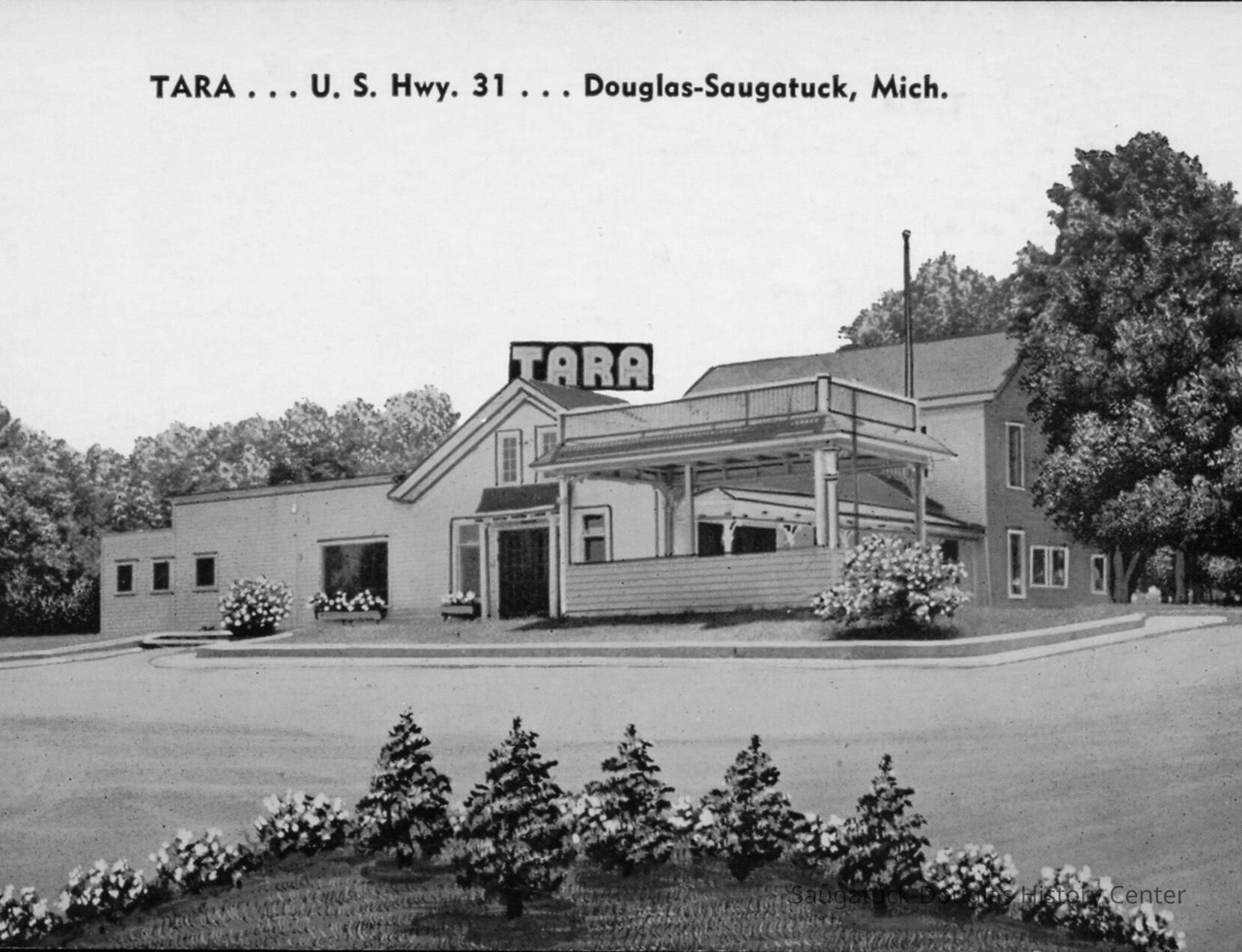 The top photo, was loaned by Demi Demerest and shows Tara at the time it opened in about 1937—with groups of well-heeled ladies enjoying the patio overlooking the Kalamazoo. Note the stylish umbrellas, the covered porch, and the very modern neon sign. The name Tara, of course, came from the southern plantation in Gone With the Wind —itself a reference, we believe to Irish mythology.