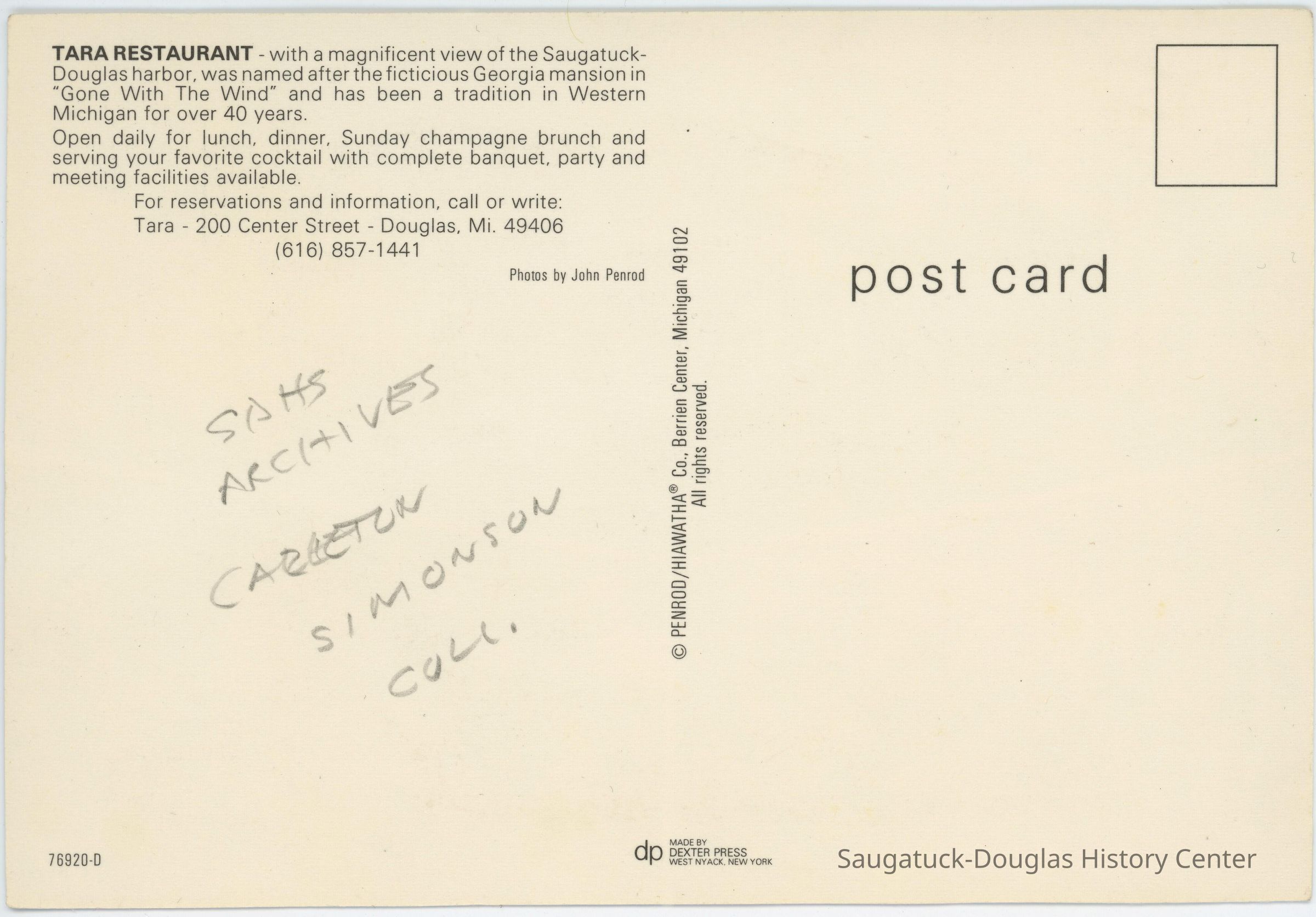 Tara Restaurant - with a magnificent view of the Saugatuck-Douglas harbor, was named after the ficticious Georgia mansion in "Gone With The Wind" and has been a tradition in Western Michigan for over 40 years.