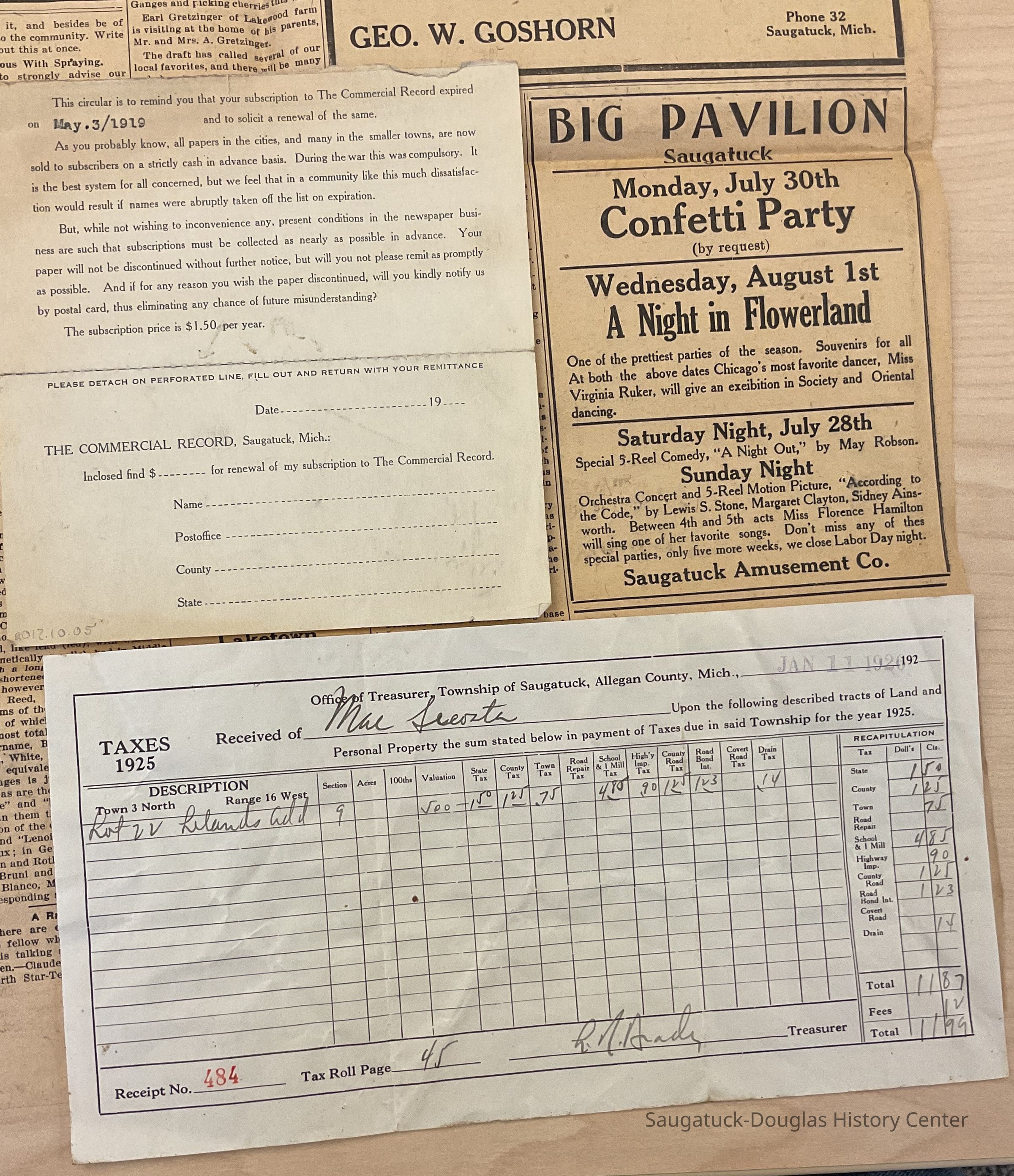 1926 Saugatuck Township Tax receipt Section 9, Lot 22 Lelands Addition for $11.99.