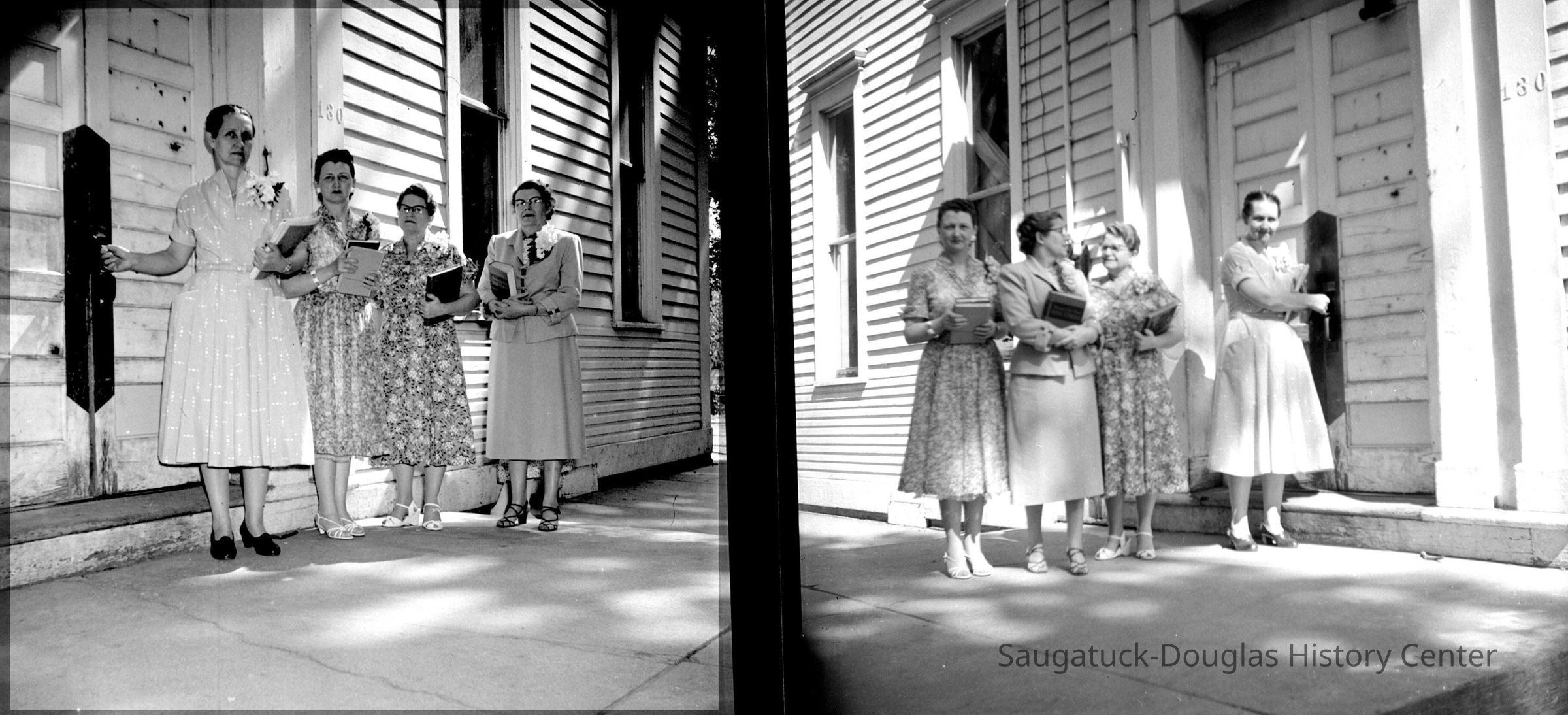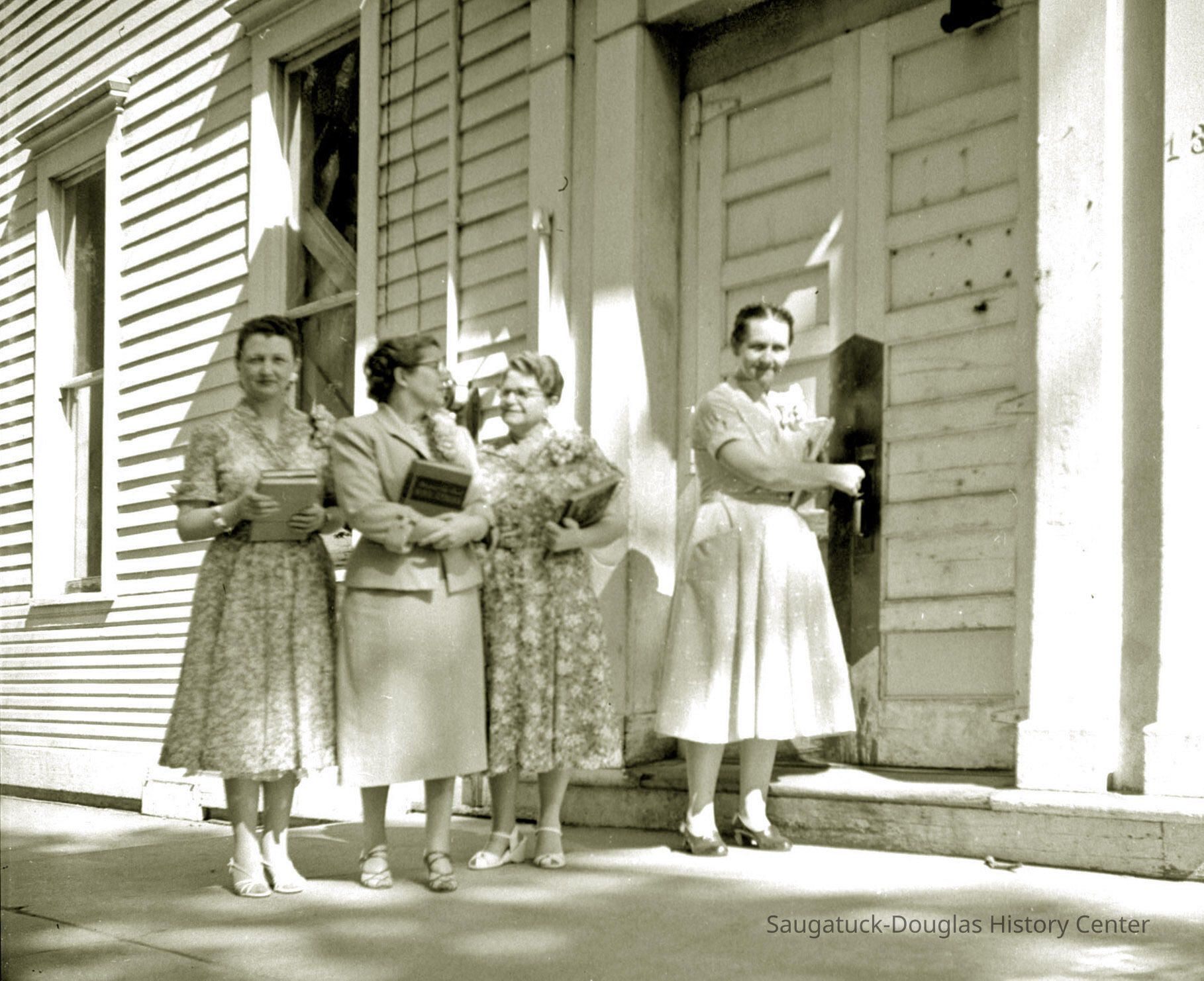 1st woman, Mrs. Wilma Ramp, on the far left with hand on door hand. Natalie Wicks second from left, Gladys Hadaway, third from left, elementary teacher at Douglas grade school.