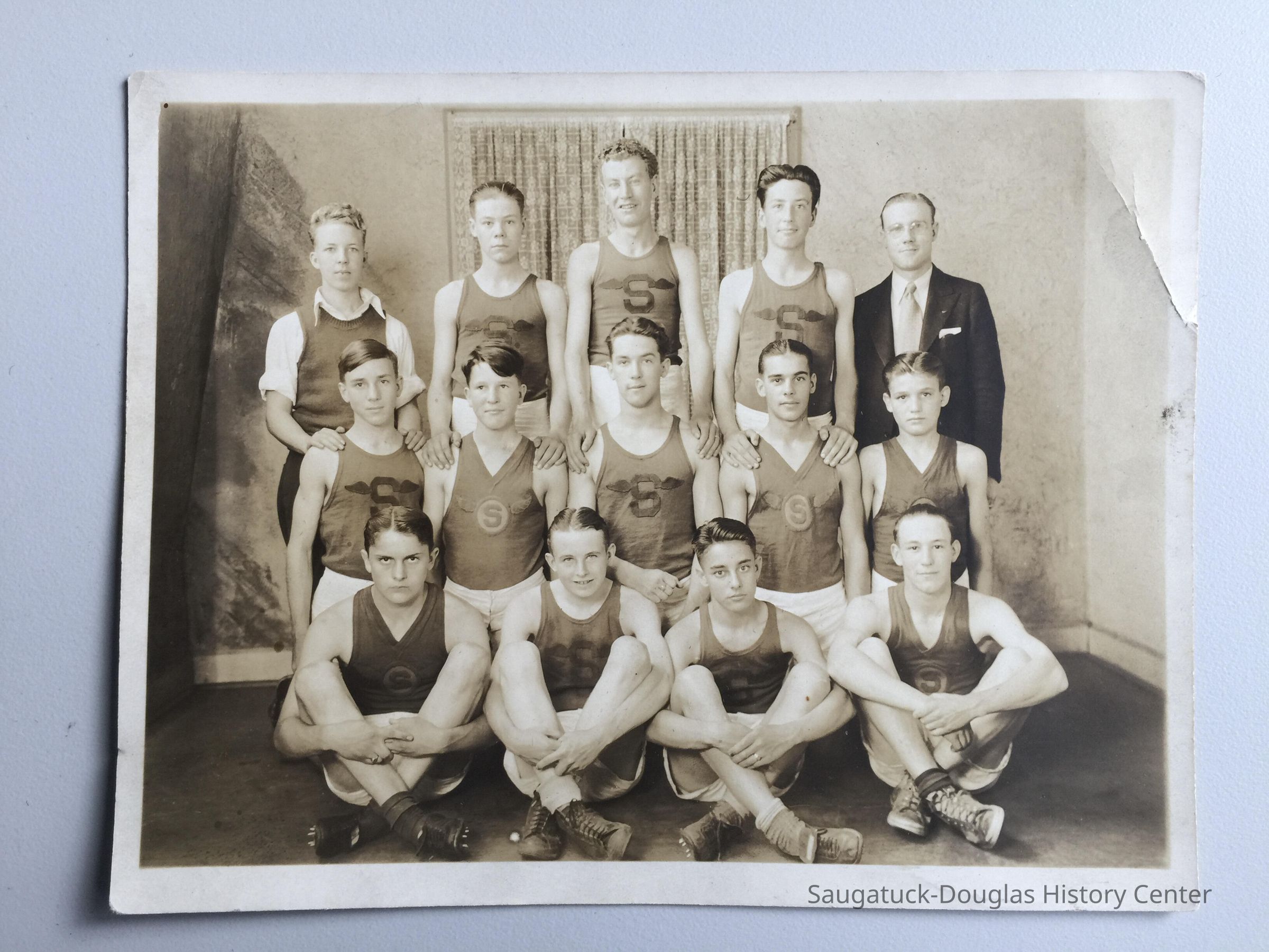 Photo of a team of 12 sitting, kneeling or standing male athletes wearing shorts and tank tops with a winged "S" on their chests. The athletes are accompanied by a similar-age boy in street clothes and an adult man wearing a suit. Two boys sitting in the front row have spikes on their shoes. Circa 1945.