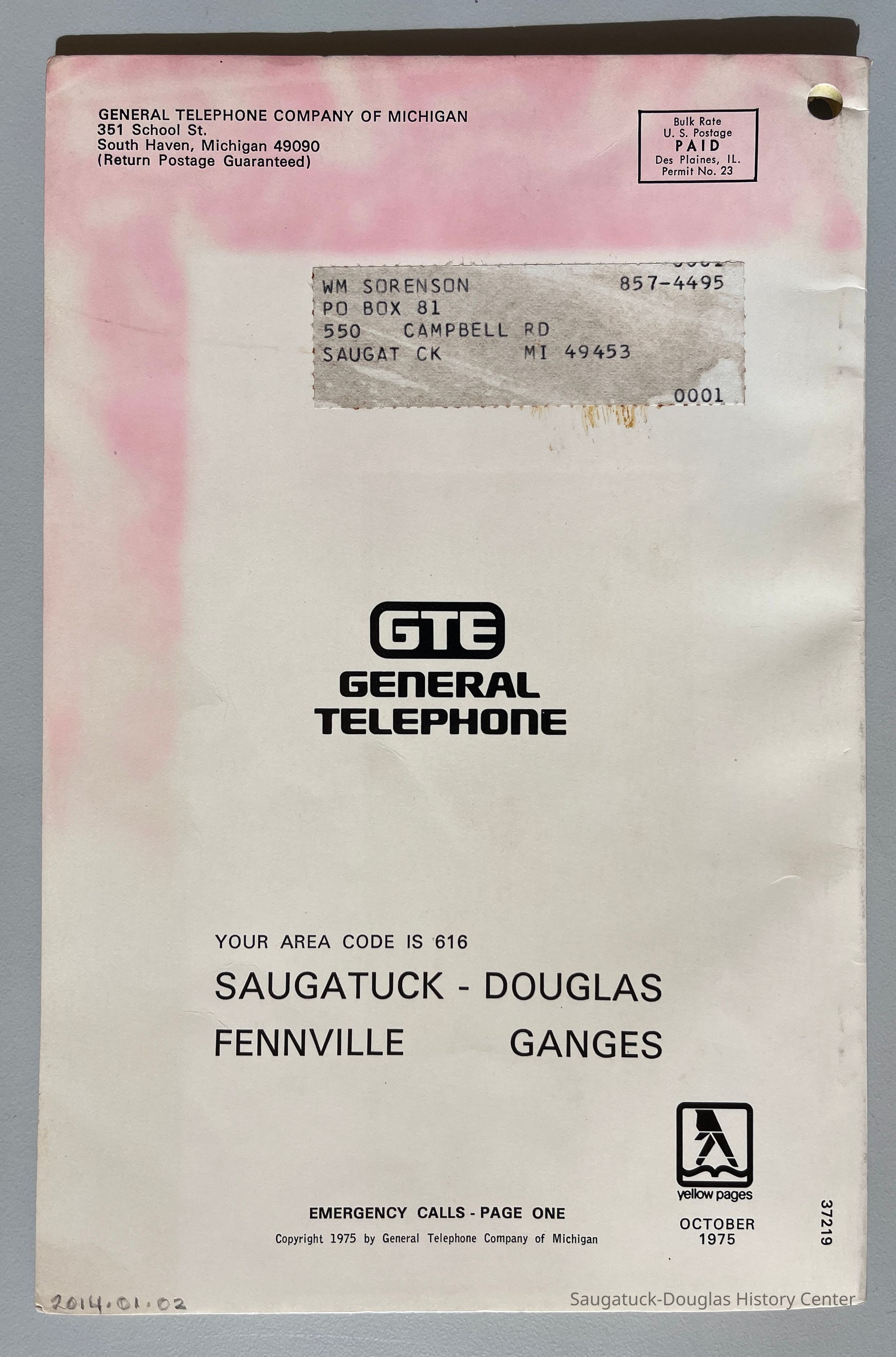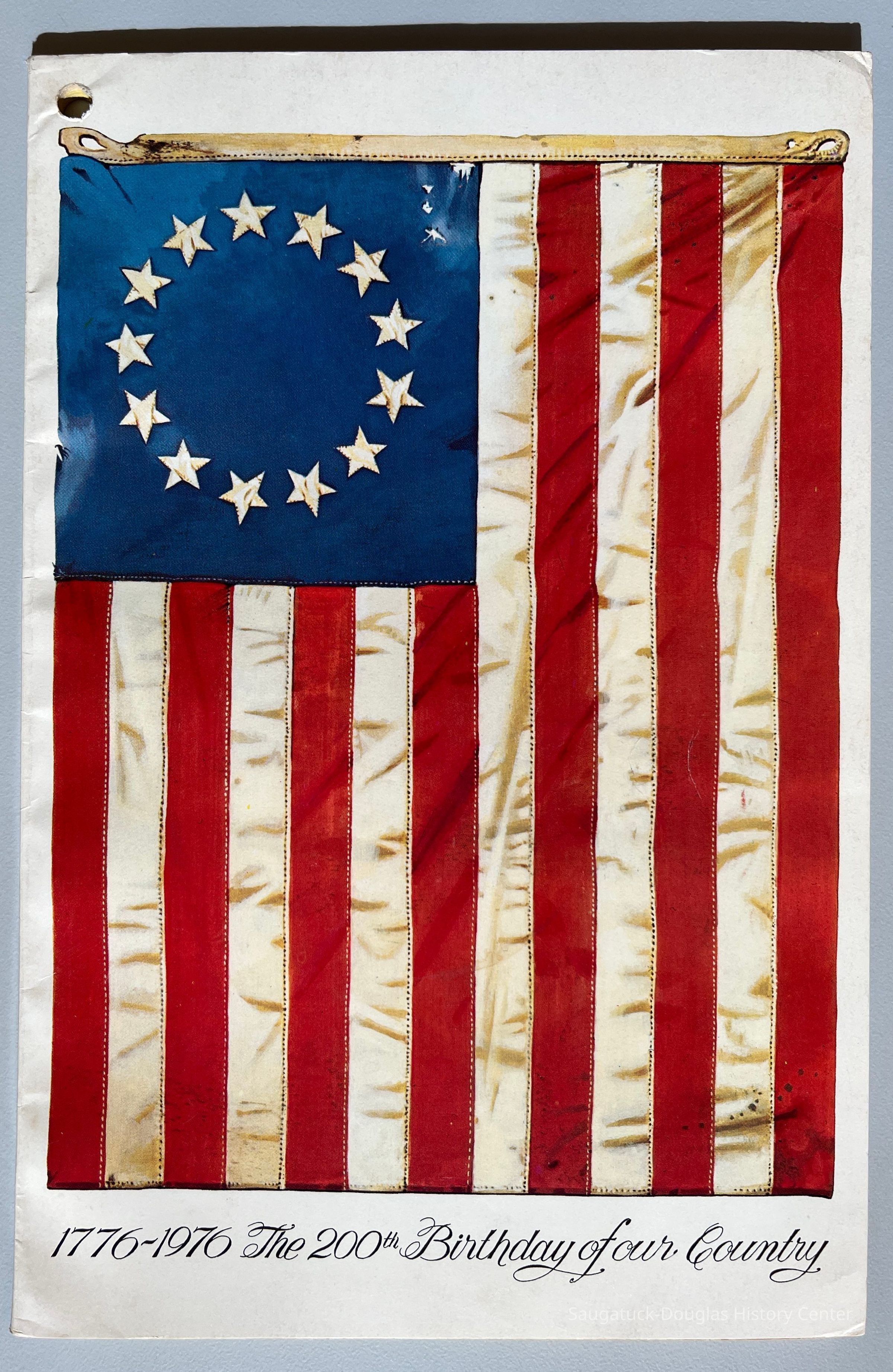 This telephone directory features numbers and addresses for the Saugatuck-Douglas area. It also includes business adds. The front cover contains a picture of the original American flag with thirteen stars to commemorate the 1976 BicentennialCollection