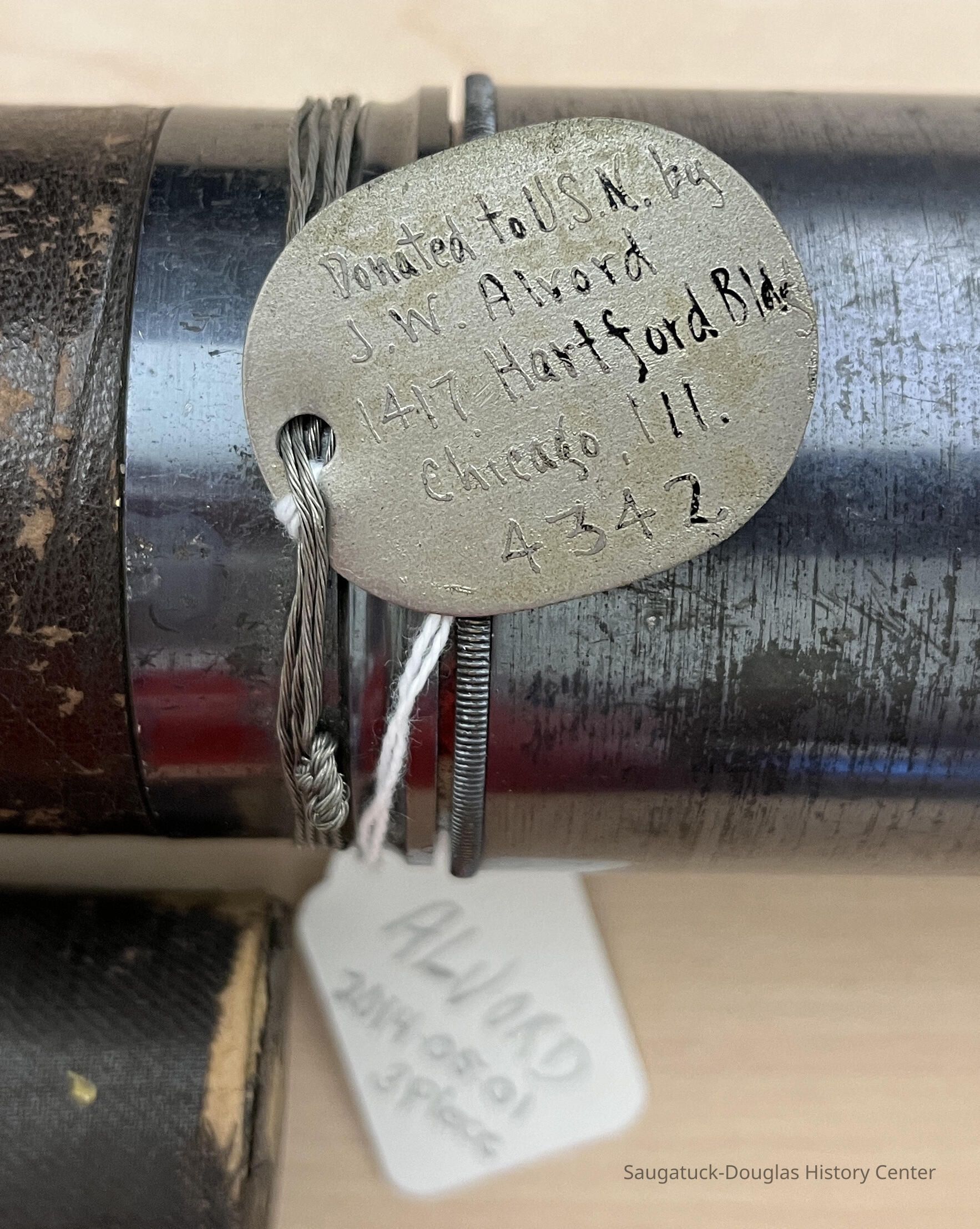 Metal tag with hand engraving on artifact states "Donated to U.S.N. by J.W. Alvord 1417 Hartford Blvd Chicago Ill. 4342"Collection