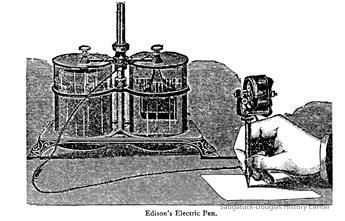 The electric pen, used a battery for power and punched tiny holes in the paper along the path of the written words. This paper was then used as a matrix to make duplicates of the letter. When ink was spread on the back it oozed through the holes forming a continuous line. The number of letters that could be duplicated from a single paper matrix was limited, in the early versions to less than a dozen, but it was still an improvement over writing out all of the letters by hand.Collection