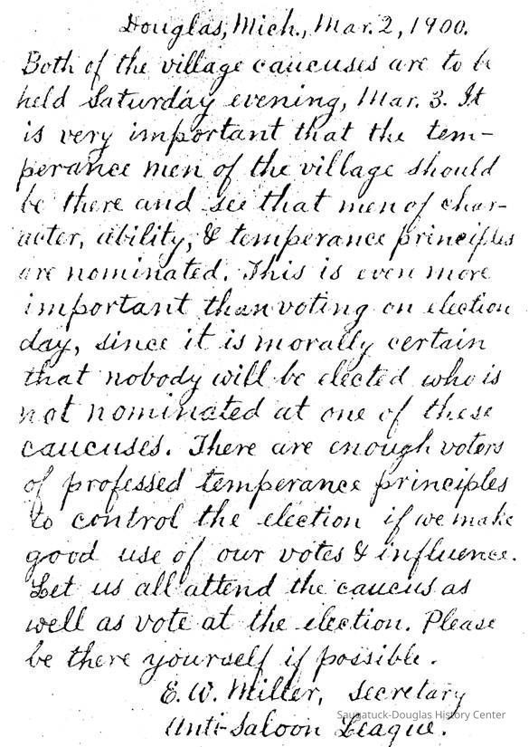 The cause of prohibition was an active one in West Michigan. Several Red Ribbon clubs were organized in the wake of a visit by Susan B. Anthony in 1879. (Those who pledged to give up liquor wore a red ribbon in their lapel.) In 1894 a county-wide vote passed local option, making it possible for each local township or incorporated settlement to decide for themselves the advisability of selling spirituous beverages. At a second vote held in 1896 local option was roundly defeated in Saugatuck, 311 to 140. The local newspaper explained: