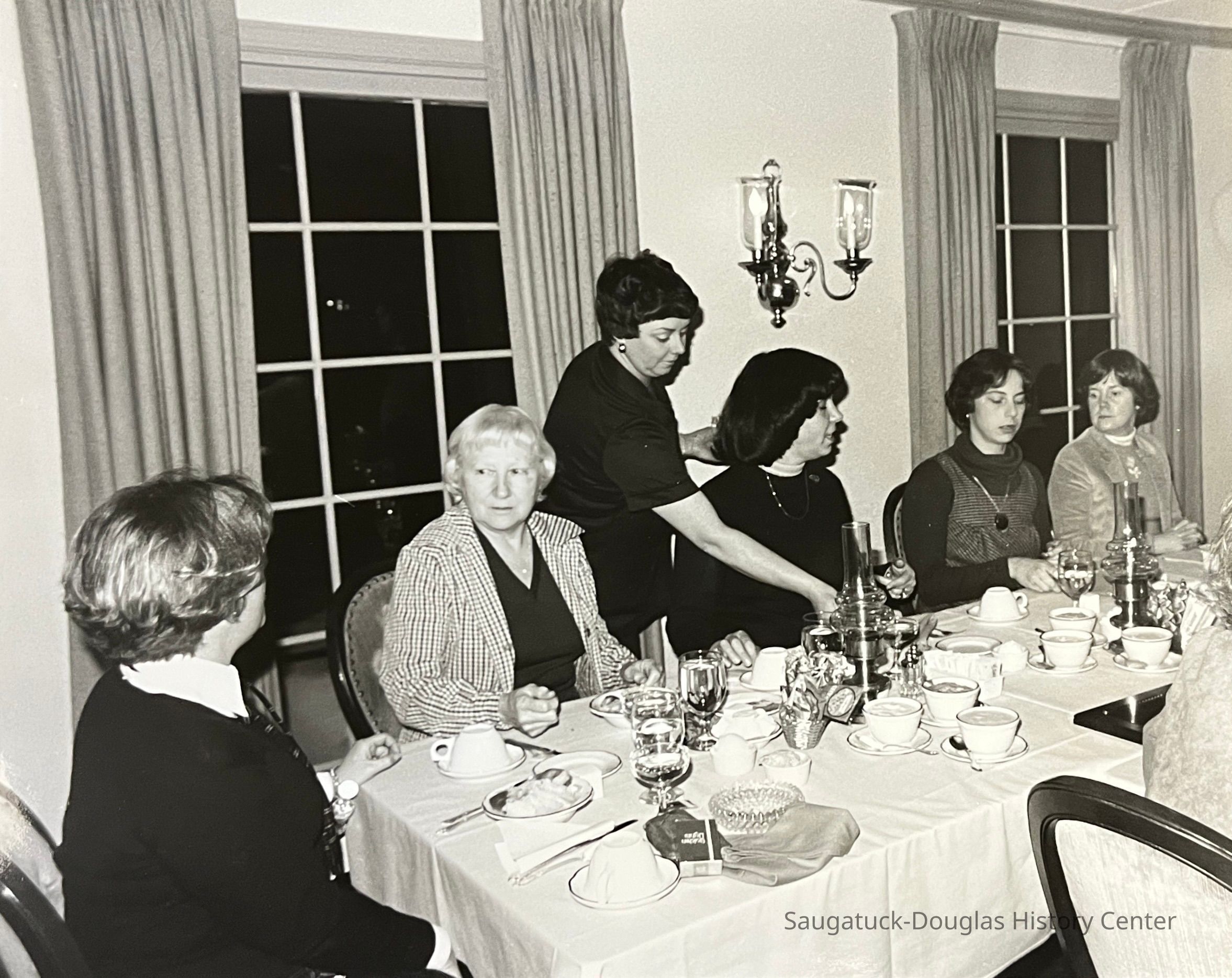 Photographs and one newspaper clipping from the Thank You Dinner hosted by the K.C Miller Guild on January 12, 1981. There is one large photograph and 8 smaller photographs. These images depict scenes from the dinner:people eating, awards being given, and an afghan knitted by a member being shown off. Several of the photos have names written on the back, identifying several of the participants. These people include Tanya Sheridan, R.J Peterson, Sue Schlacks, Lil Dalman, Jean Hatigan [Haitigan], Carolyn Raebel,and Phyllis Sorenson. There is also a newspaper clipping from the Fennville Herald, January 29,1981 issue, which displays a photo of Tanya Sheridan, Phyllis Sorenson, and Dick Nagy. The title reads, "Thanks to Pig Roast Supporters." These people appear in several of the other photos and were most likely honored at the dinner for their contributions to the Pig Roast that the guild hosted the previous year.