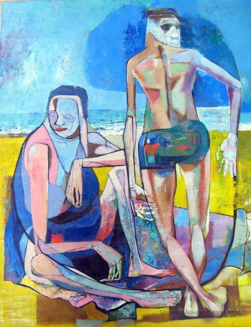 In 1947, Richard Wilt and his wife, Ellen arrived at Ox-Bow for the summer. Ellen took in the wonder of the campus while Dick, as he was called, taught painting. Wilt worked tirelessly with his students, but did manage to take in all the wonders Saugatuck offered. That summer he captured the heat and brilliance of Lake Michigan in a painting, The Bathers. Wilt would go on that fall to become a professor of painting at the University of Michigan. “The Bathers” remained in the personal collection of the artist.
