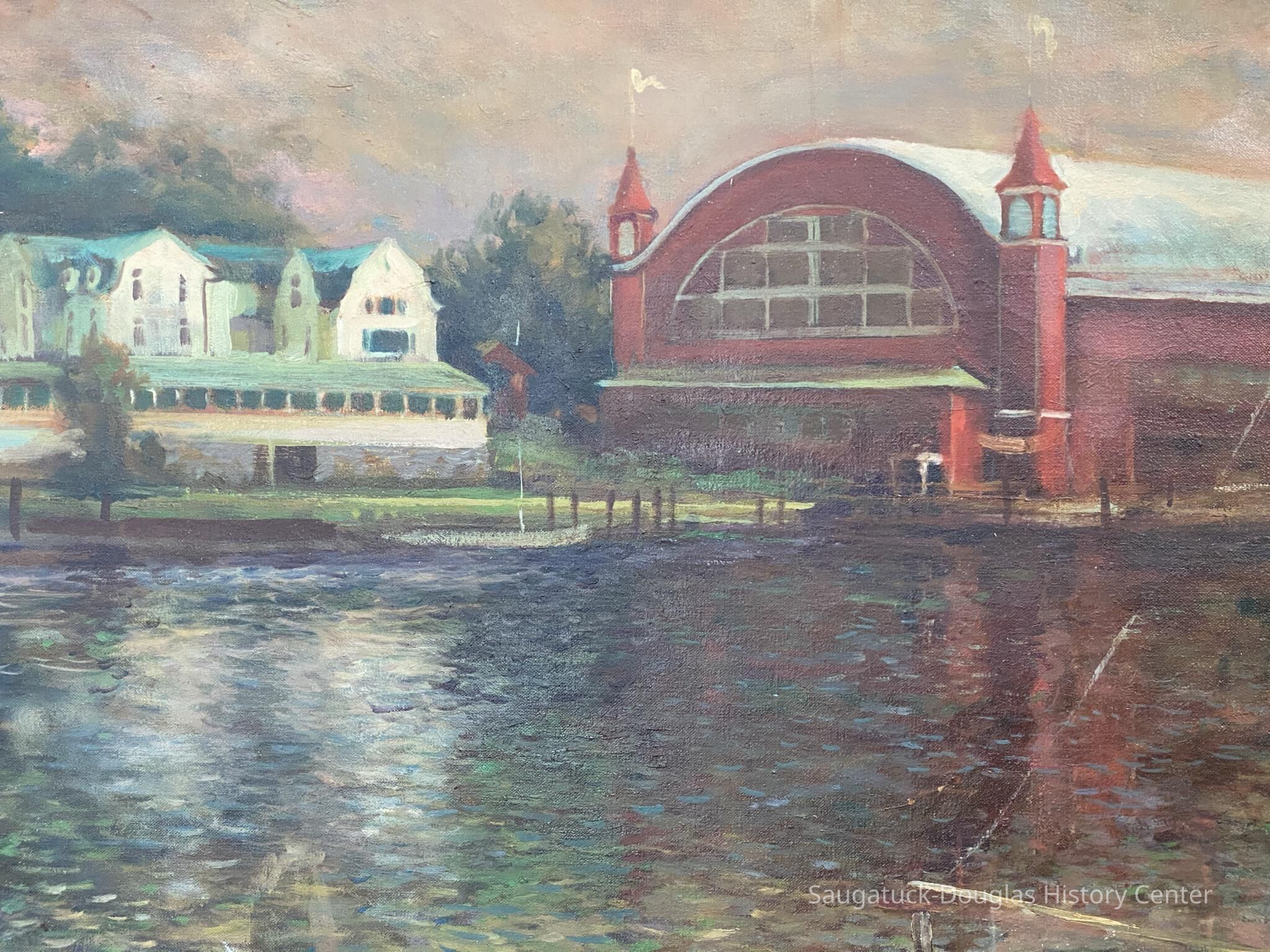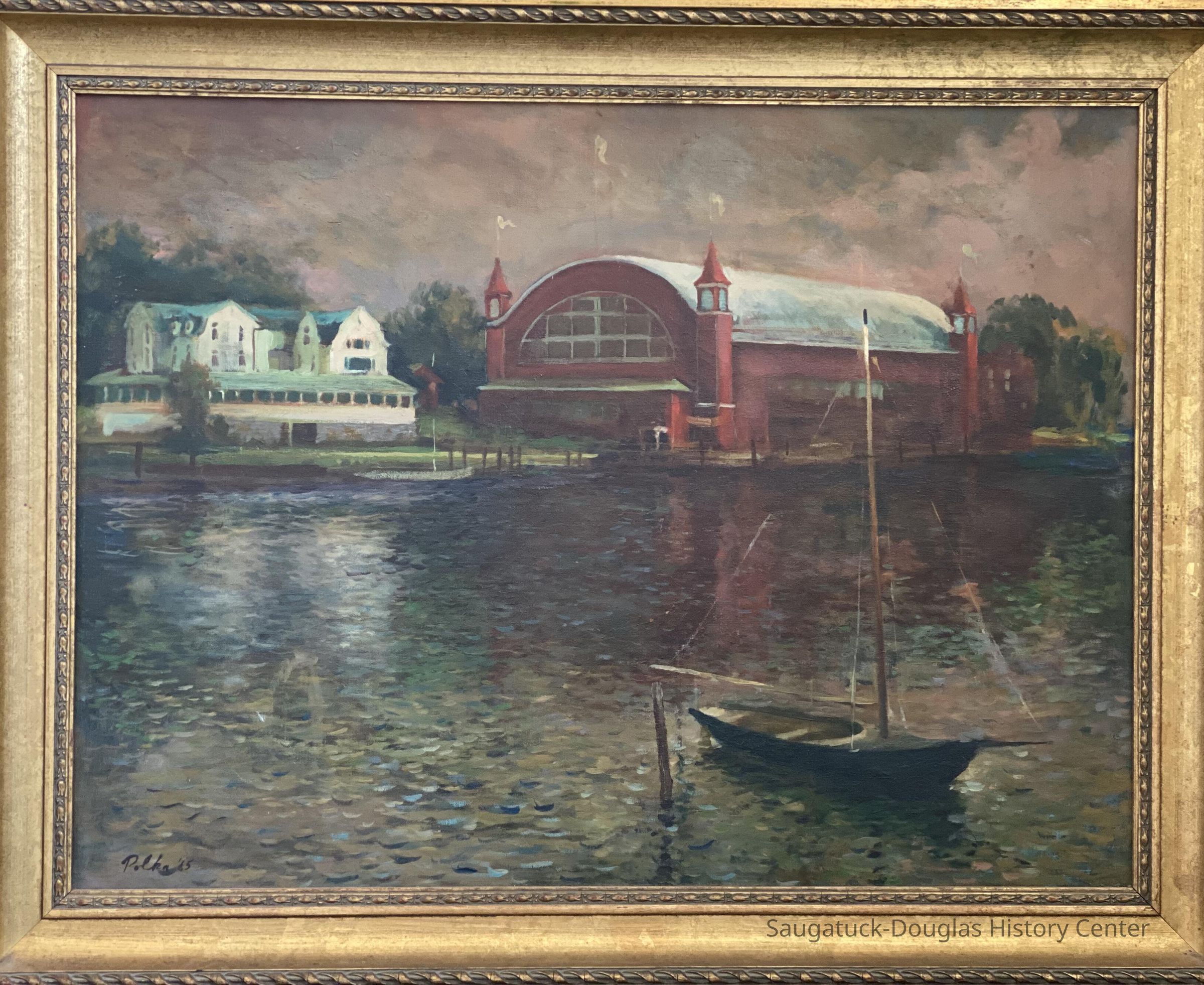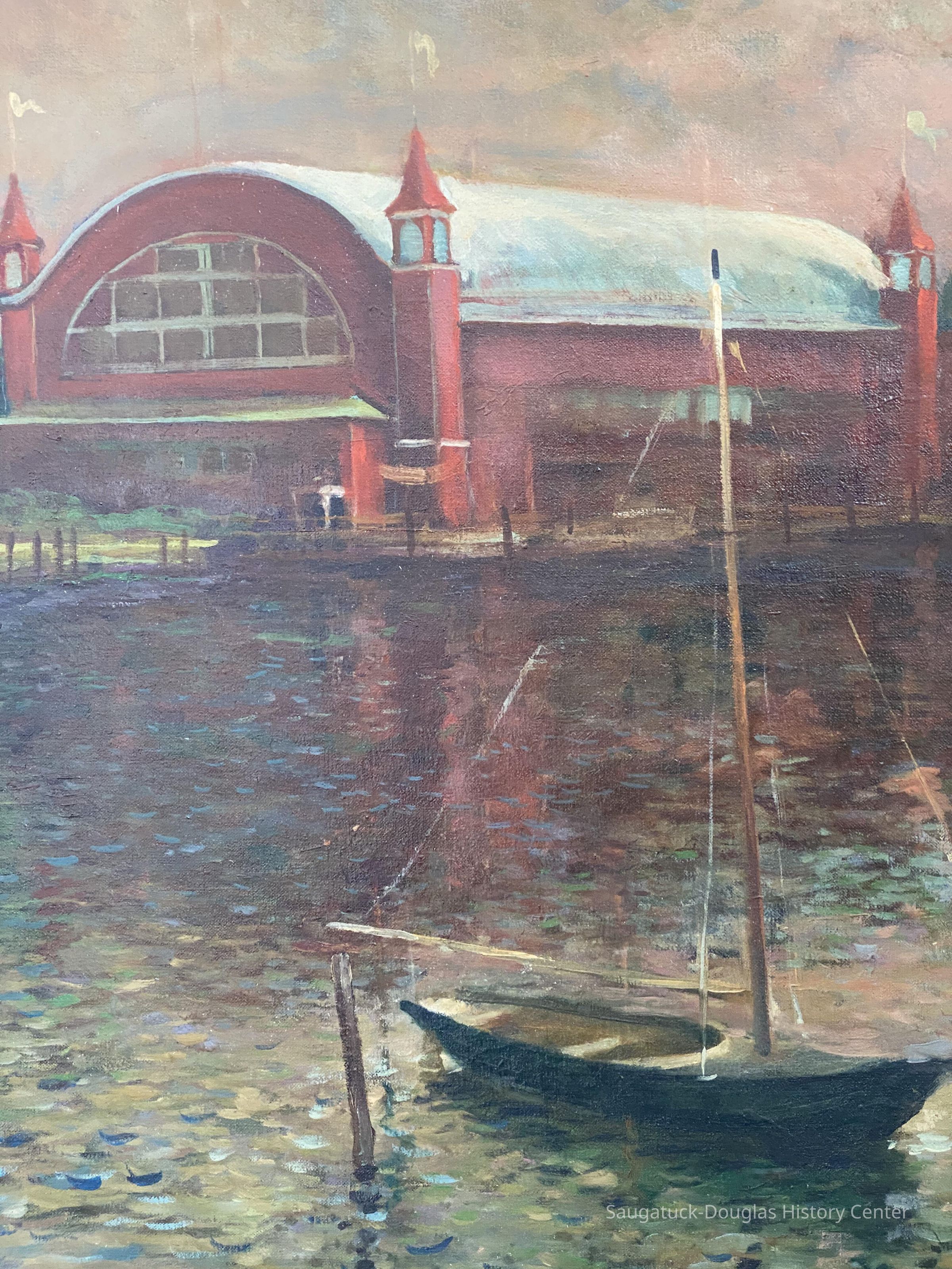 An oil on canvas painting by John Polka, ca. 1965 depicting The Big Pavilion and Coral Gables in the background as viewed from the west side of the Kalamazoo River bank. A small sail boat is moored in the foreground. The overall tone is dark with the waters looking cold and deep as if an impending storm is on the horizon. The bright red reflection of the big pavilion in the waters of the river could possibly be a foreshadowing of events to come. The Big Pavilion was destroyed by fire on May 6, 1960.