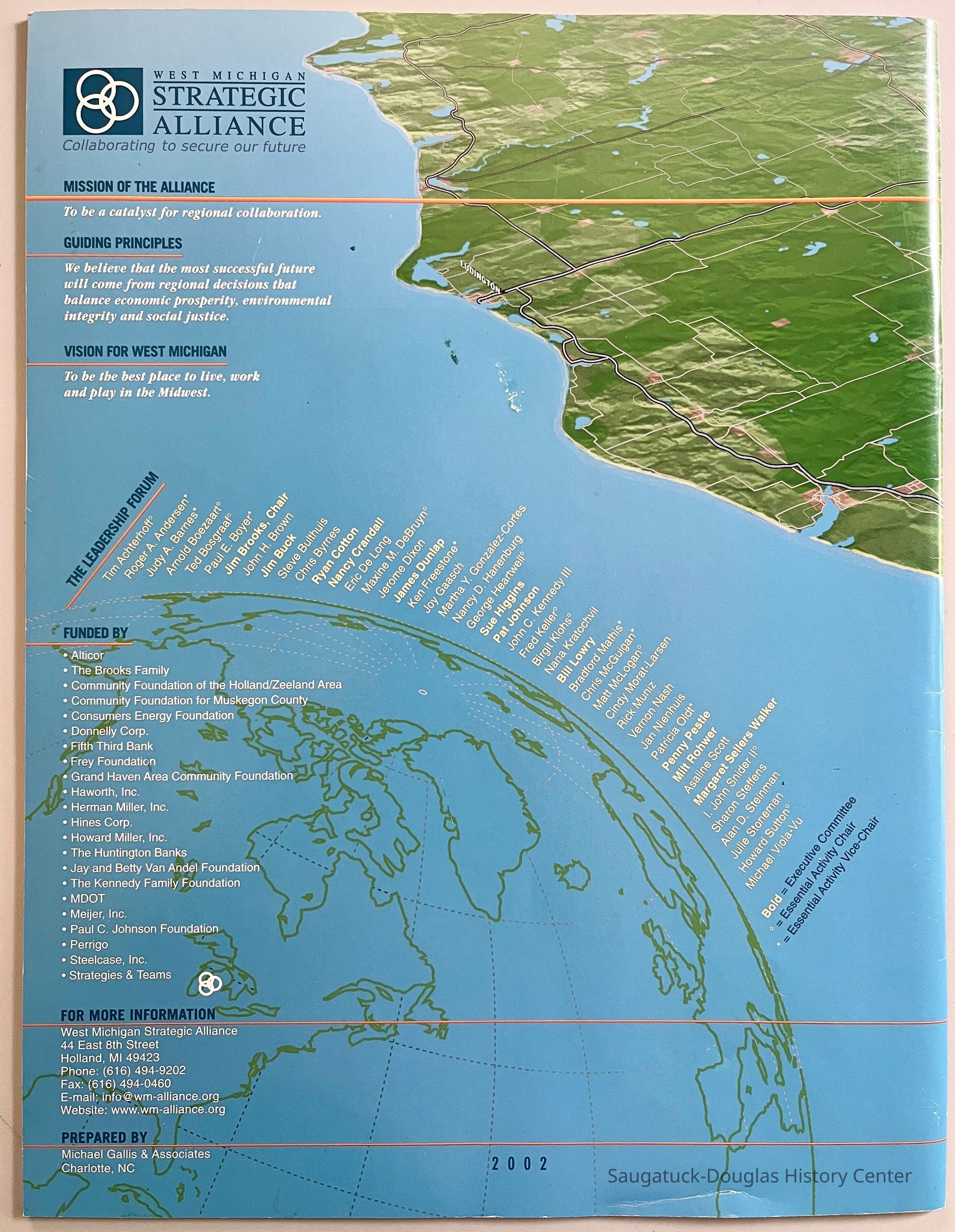 The back cover lists the funding manufactures and businesses as Alticor, The Brooks Family Community Foundation of the Holland/Zeeland Area, Community Foundation for Muskegon County, Consumers Energy Foundation, Donnelly Corp., Fifth Third Bank, Frey Foundation, Grand Haven Area Community Foundation, Haworth, Inc., Herman Miller, Inc., Hines Corp., Perrigo, Howard Miller, Inc., The Huntington Banks, Jay and Betty Van Andel Foundation, The Kennedy Family Foundation, MDOT [Michigan Department of Transportation], Meijer, Inc., Paul C. Johnson Foundation, Steelcase, Inc. and Strategies & Teams.Context