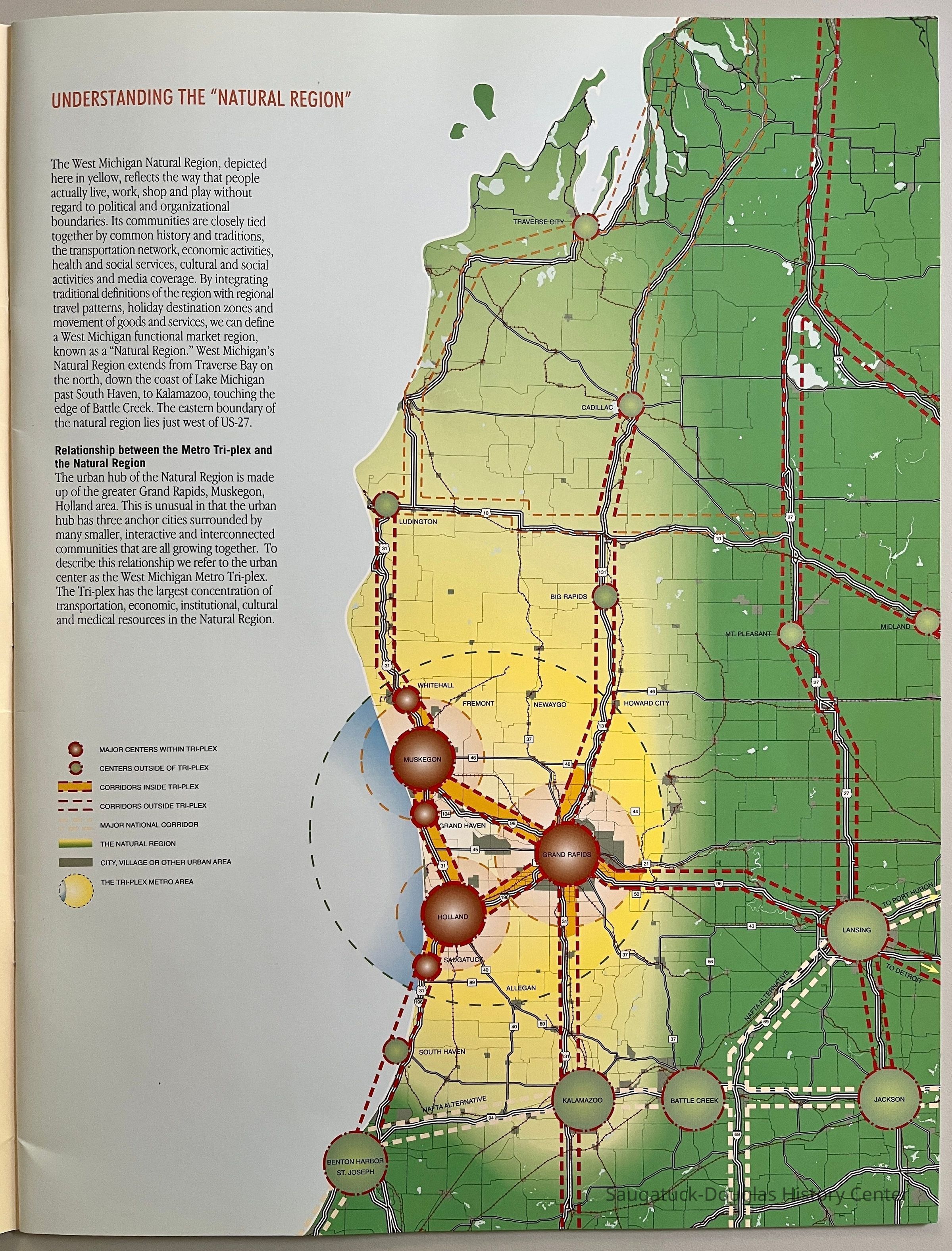 The data-heavy book describes the 2002 economic context of the West Michigan Metro Tri-plex on the global, continental, super-regional, West Michigan regional and Metro Tri-plex scale, describes Tri-plex "essential activities" (environment, economic development, tourism, arts/history, education/research, health/human services, land use/urbanization/demographics, transportation/logistics, infrastructure, governance) and concludes with priorities for regional collaboration.Collection