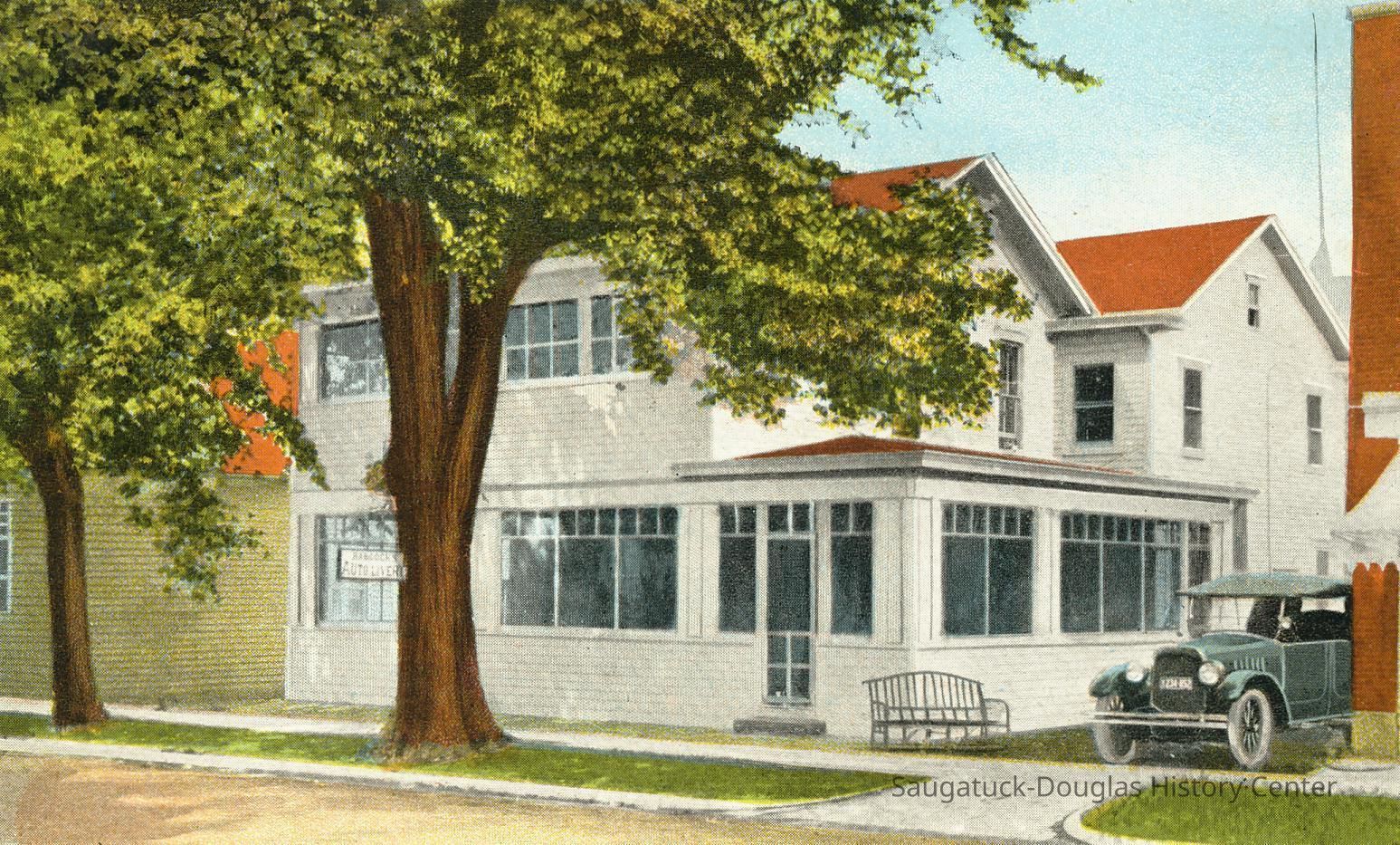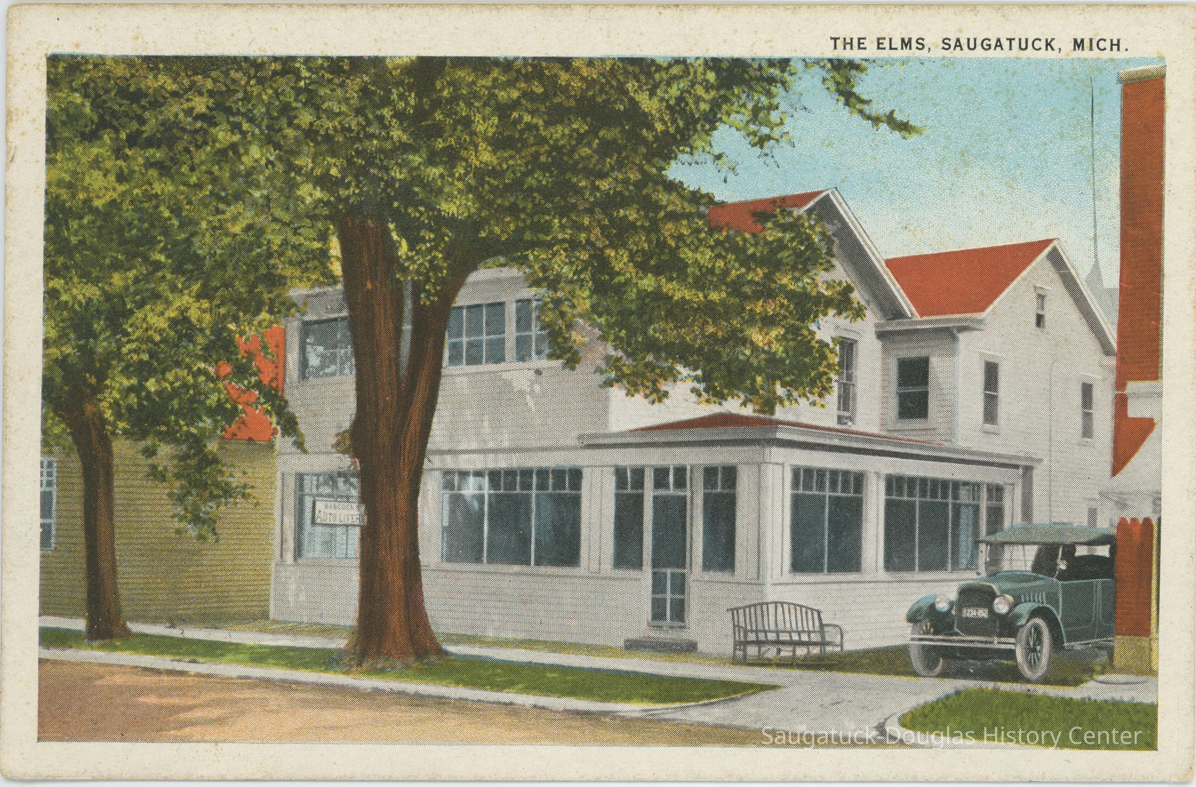 A color postcard showing the Elms hotel from the road. The white building with many windows has a vibrant red-orange roof. Parked in the driveway is a car.Subject