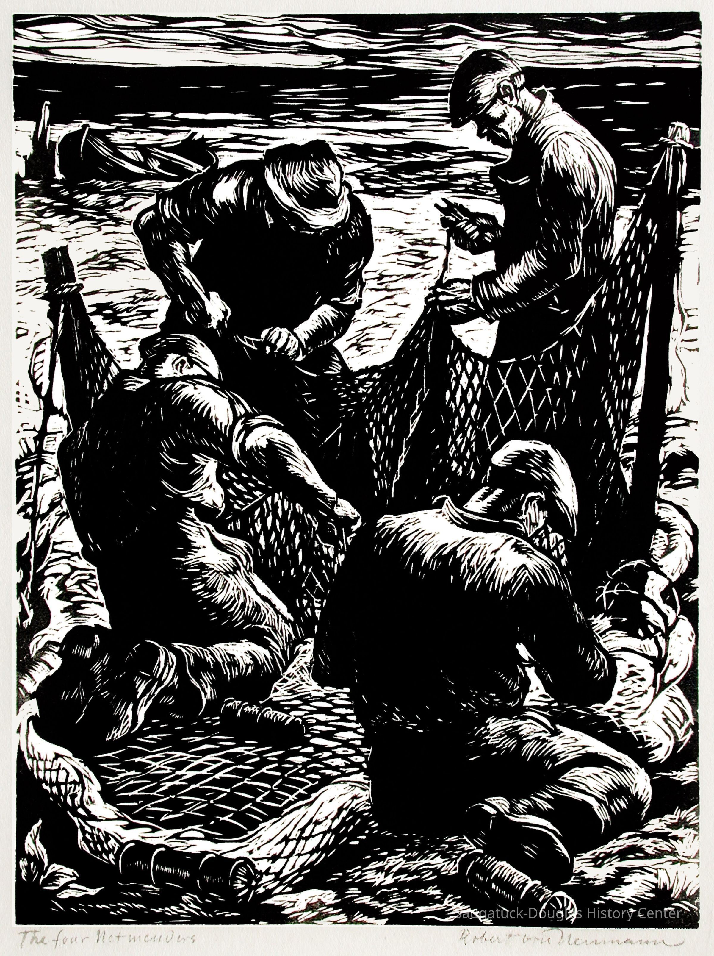 This is a woodcut of four figures mending a fishing net on shore by Robert Von Neumann. There is a small boat in the background. Note on back of frame identifying menders as Buster Purchase (top left), John Diepenhorst (top right), John Hacklander (lower right), and George Sewers (lower left).Type of Print