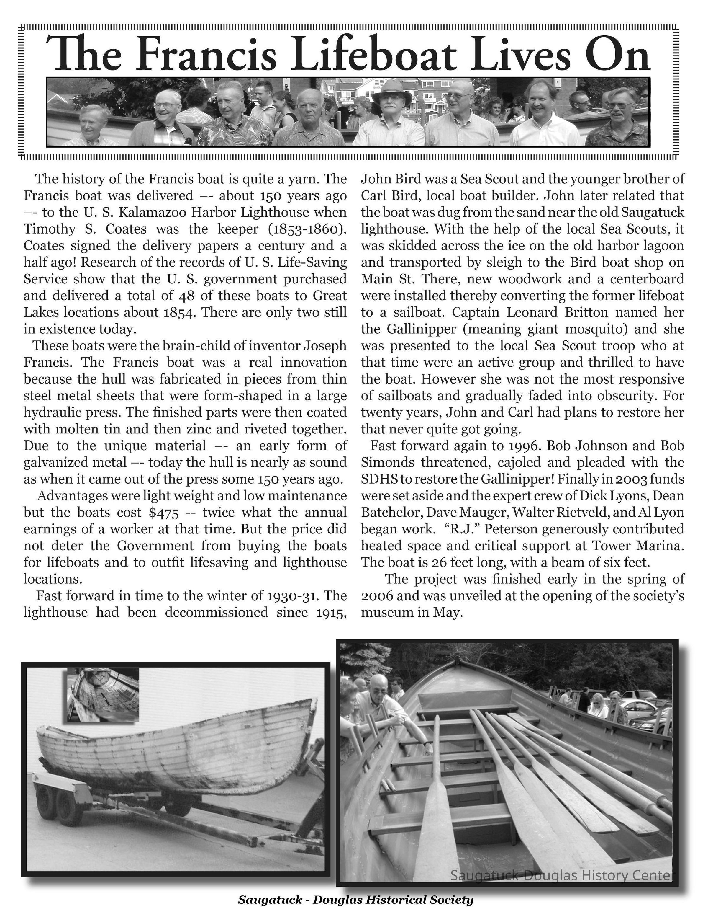 Francis Lifeboat/Gallinipper (boat), Batchelor, Dean R. 1929-2025, Johnson, Robert "Bob" Dexter 1929-2008, Simonds, Bob 1930-2021, Lyons, Thomas R. "Dick" 1956-2023, Mauger, David W. 1932-2019, Lyon, Alan, Francis, Joseph, Bird, John Moffat 1899-1973, Bird, Charles Edmund “Carl” Jr. 1879-1968, Saugatuck Sea Scouts, Brittain, Leonard Spaulding "Cappy" 1880-1964, Rietveld, Walter Scott 1963-