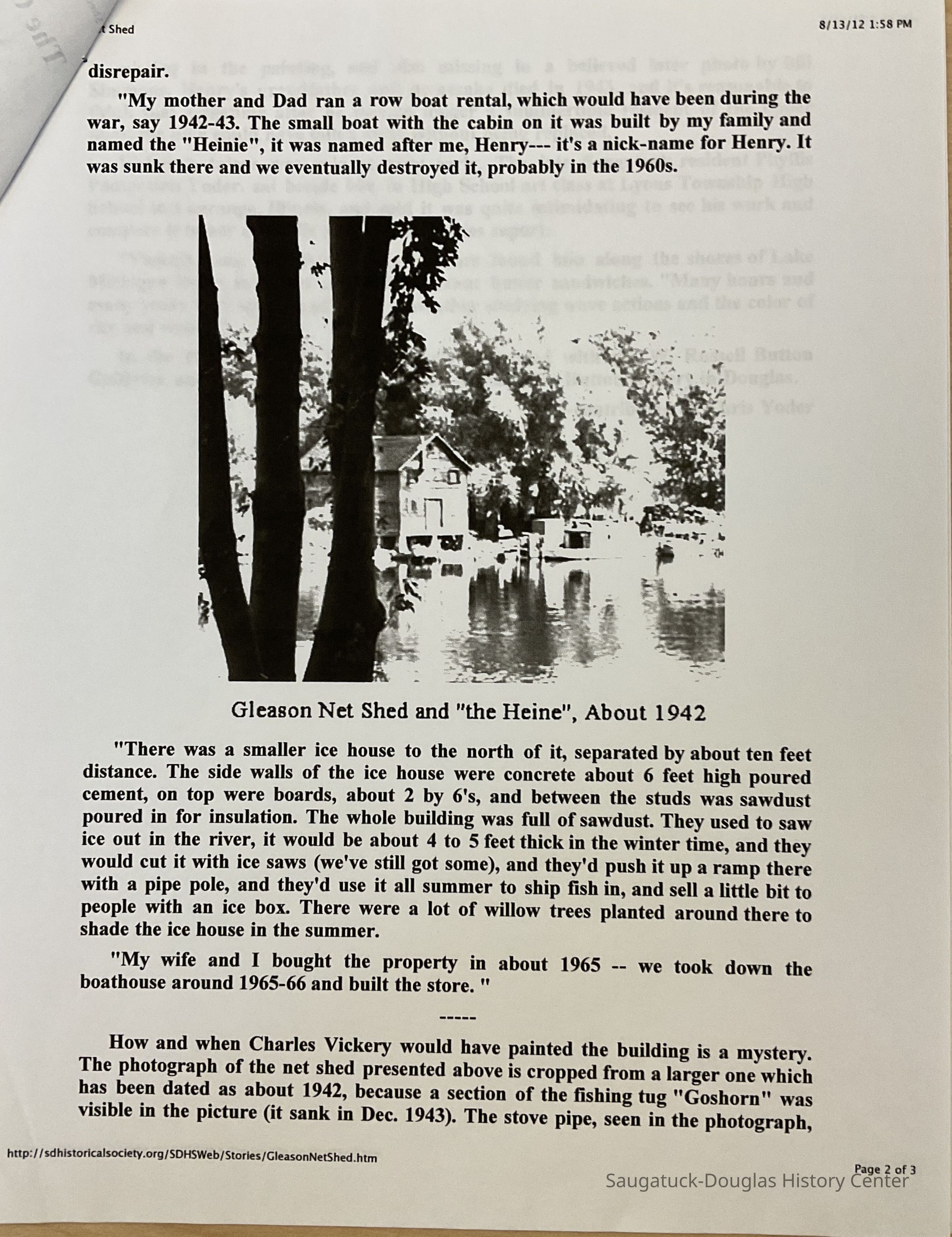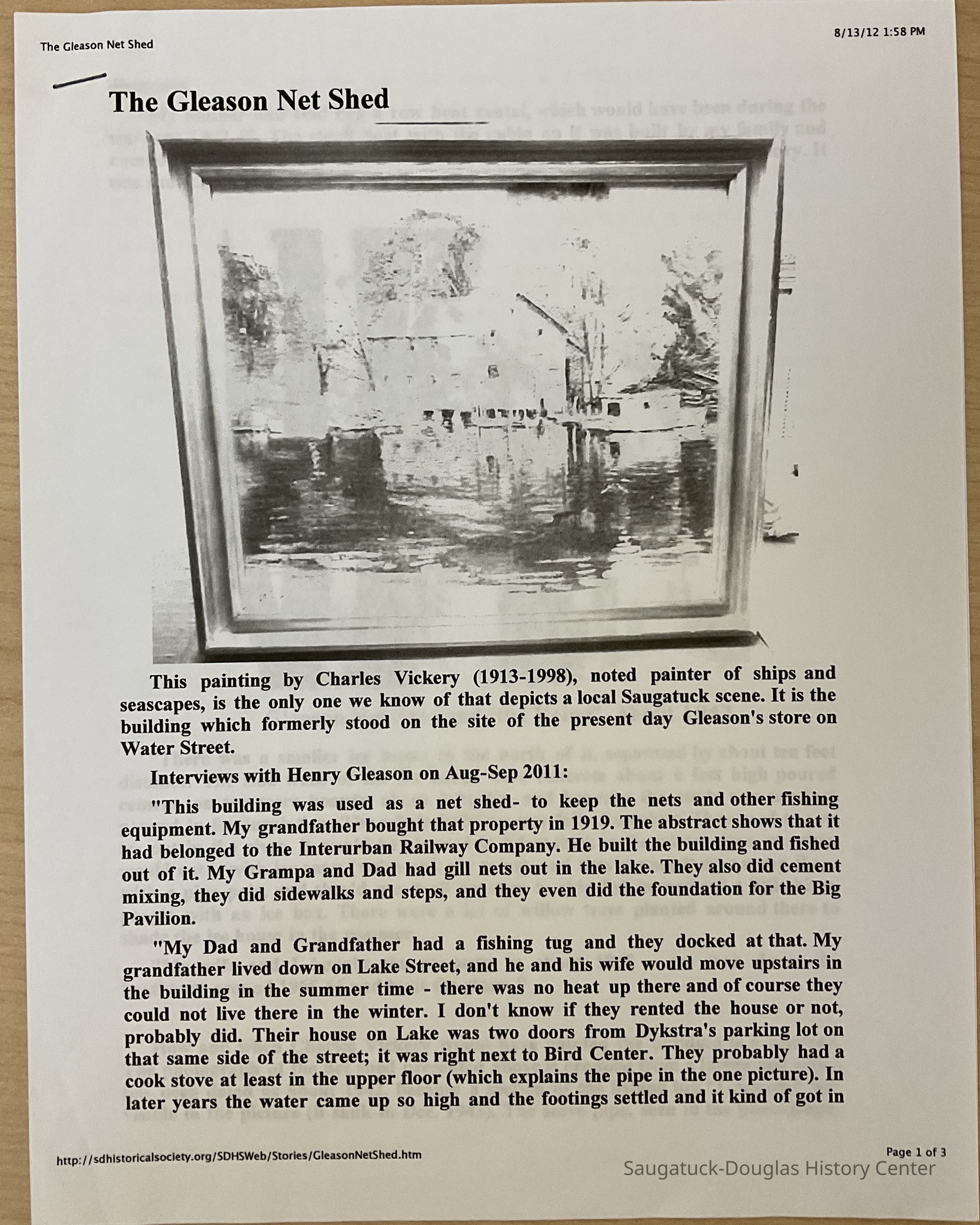 A manuscript of a report written by Chris Yoder of an interview with Henry Gleason, conducted in August and September of 2011. It includes a reproduction of a painting of an old building on Water Street of the Gleason Net Shed/Collection