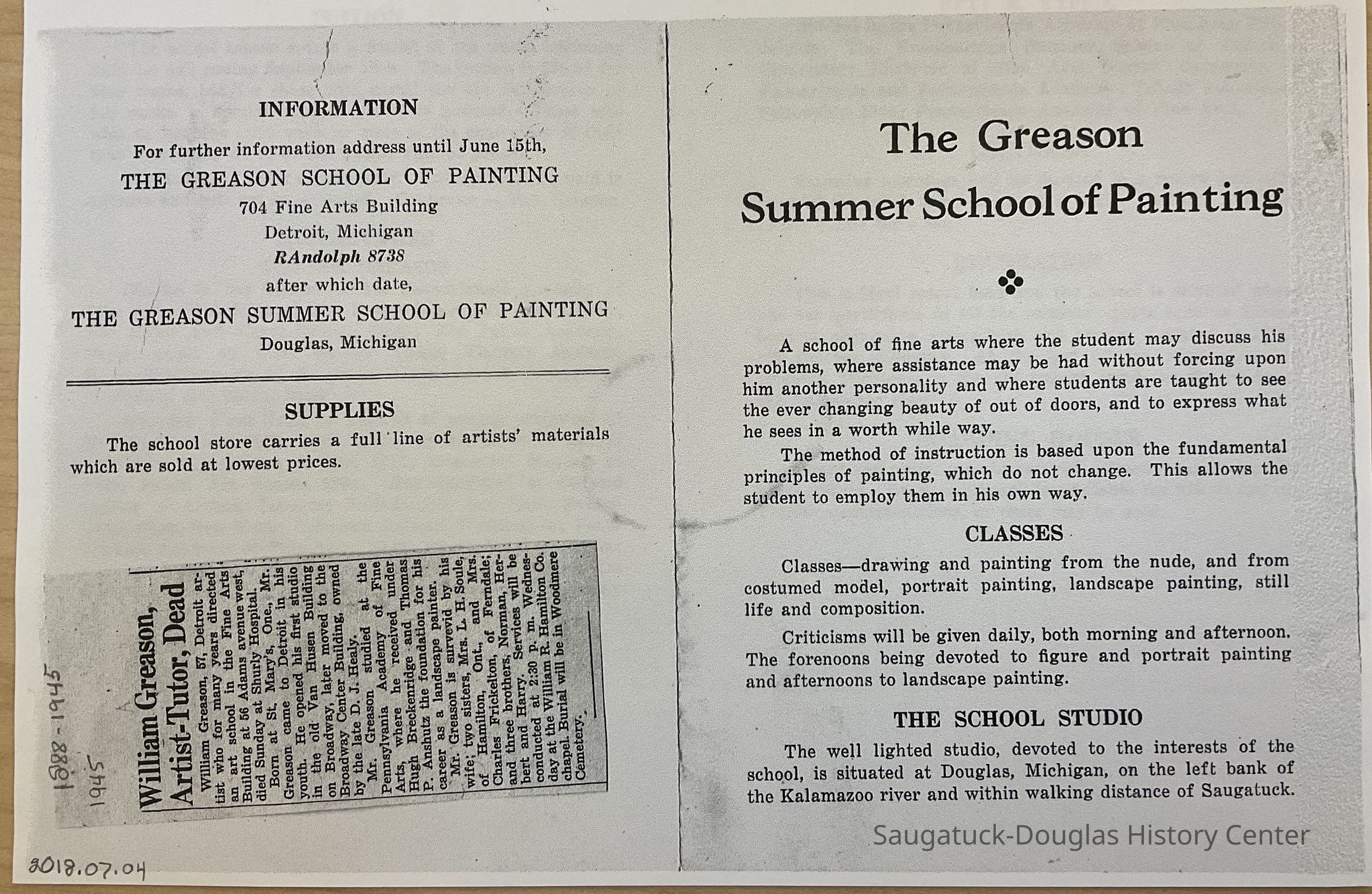Photo copy of a brochure about the Greason Summer School of painting with a clipping of the obituary of artist William Greason.