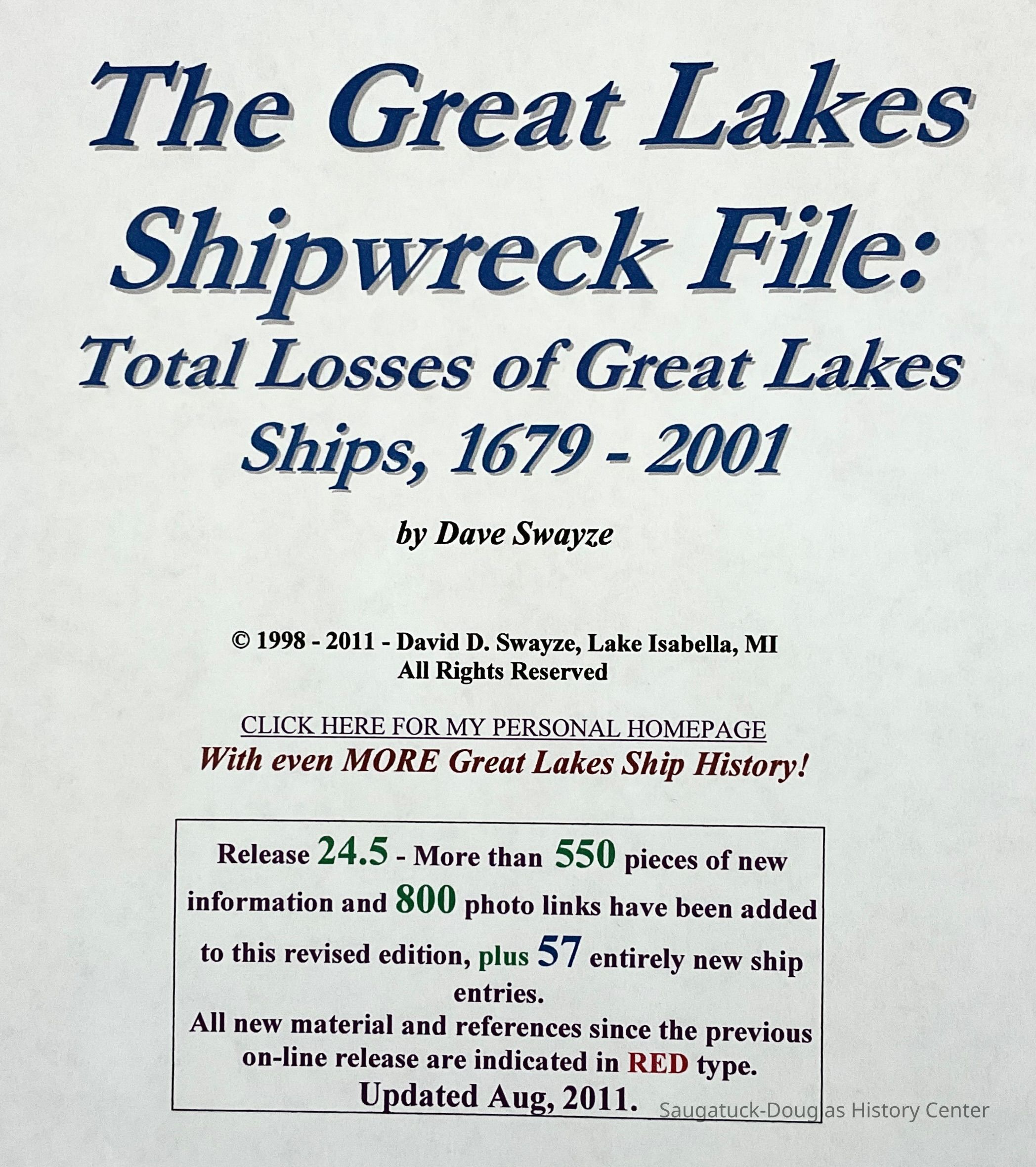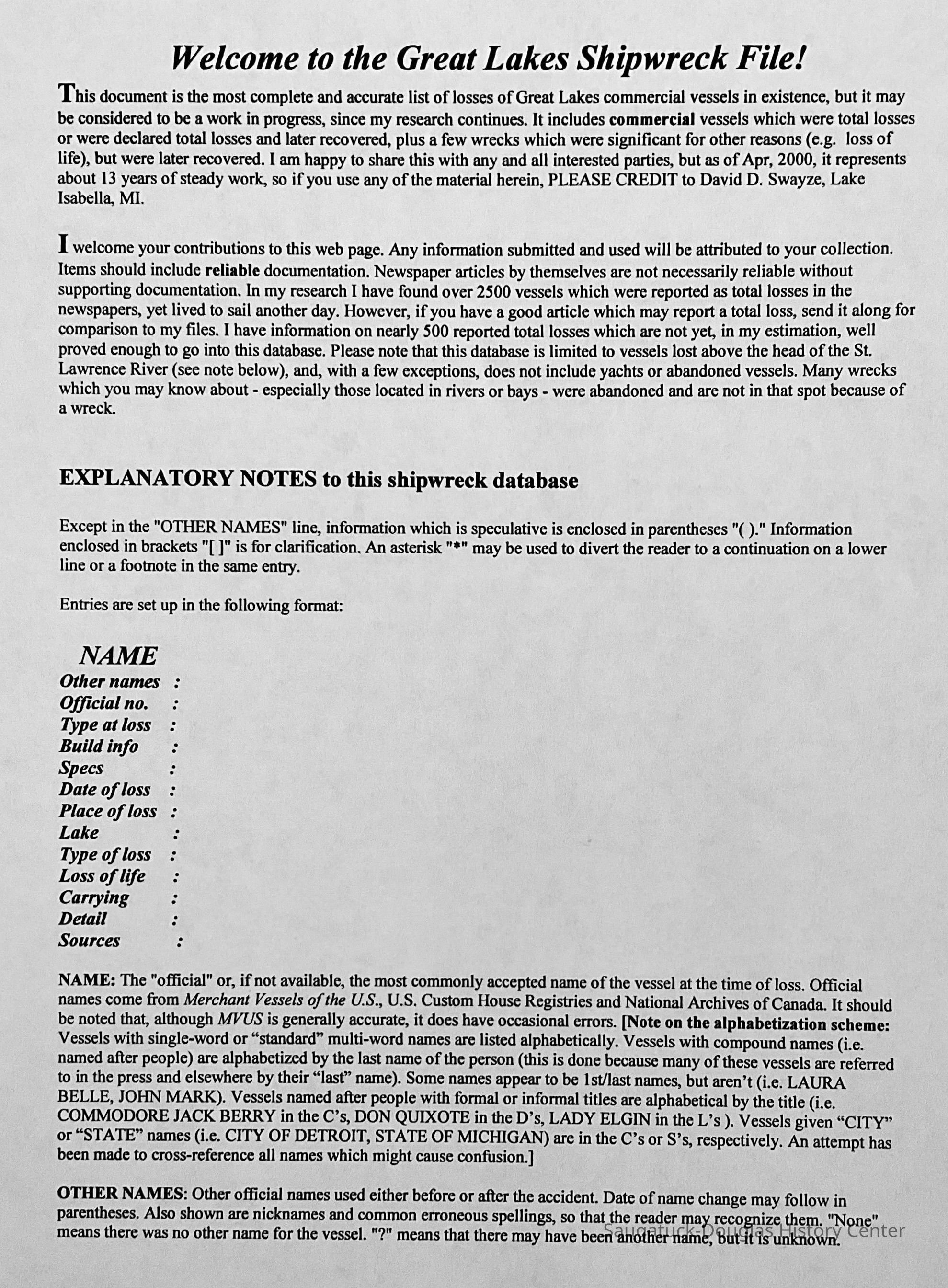 “This document is the most complete and accurate list of losses of Great Lakes commercial vessels in existence, but it may be considered to be a work in progress, since my research continues. It includes commercial vessels which were total losses or were declared total losses and oater recovered, plus a few wrecks which were significant for other reasons (e.g. loss of life), but were later recovered. I am happy to share this with any and all interested parties, but as of Apr, 2000, it represents about 13 years of steady work, so if you use any of the materials herein, PLEASE CREDIT to David D. Swayze, Lake Isabella, MI.”Collection