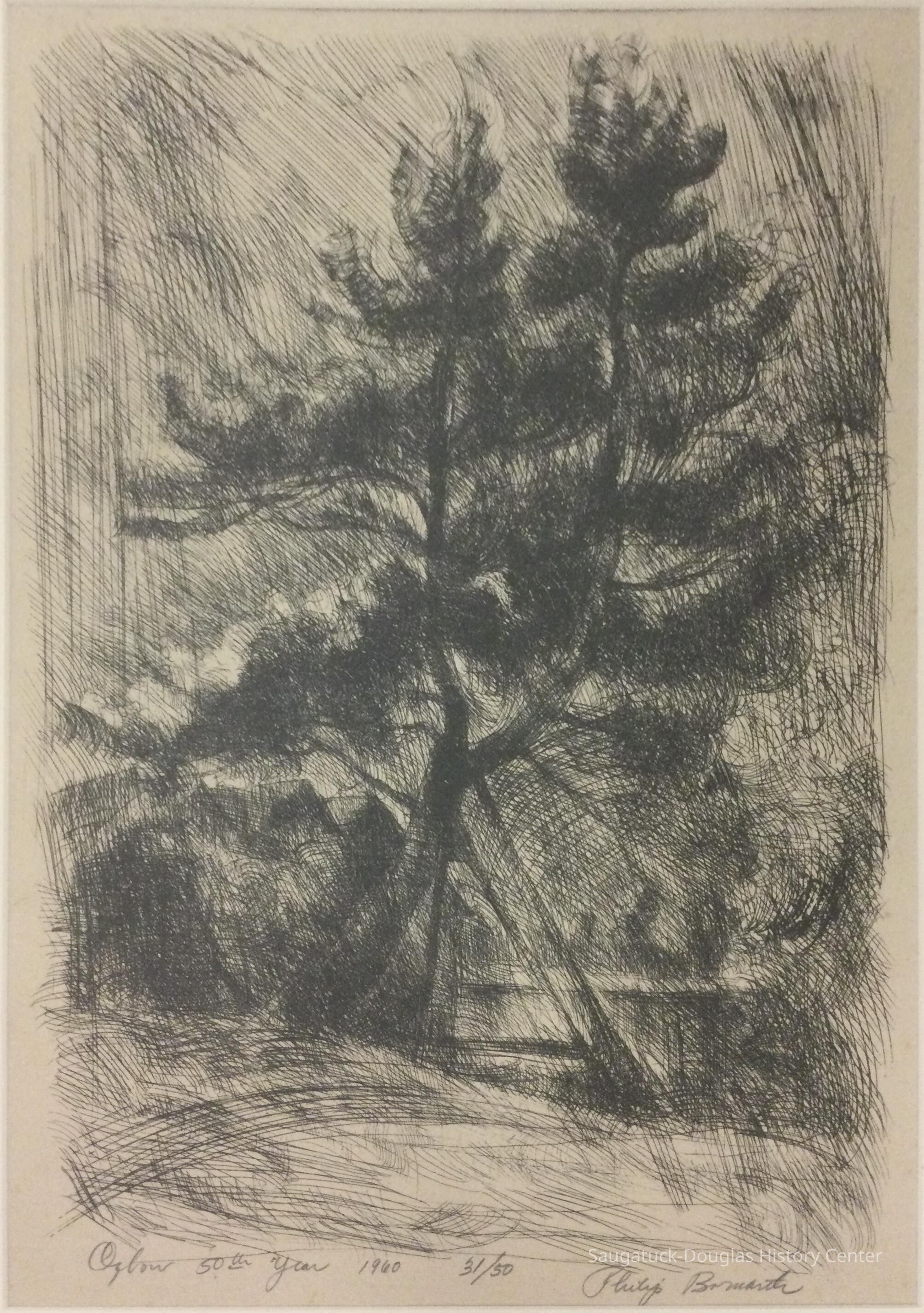 Philip Bornarth, "The Leaning Tree" 1960. Etching made for Ox Bow's 50th Anniversary 1960. Bornarth taught printmaking at Ox-Bow in 1960. This image was done for the poster celebrating Ox-Bow's 50th birthday that year.
