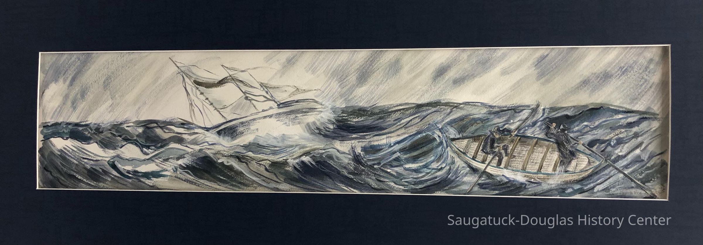 Watercolor on white gouache painting depicts two people in a lifeboat fighting the rough waves. The lifesavers are trying to approach a stranded sailing vessel in very rough seas.Type of Painting