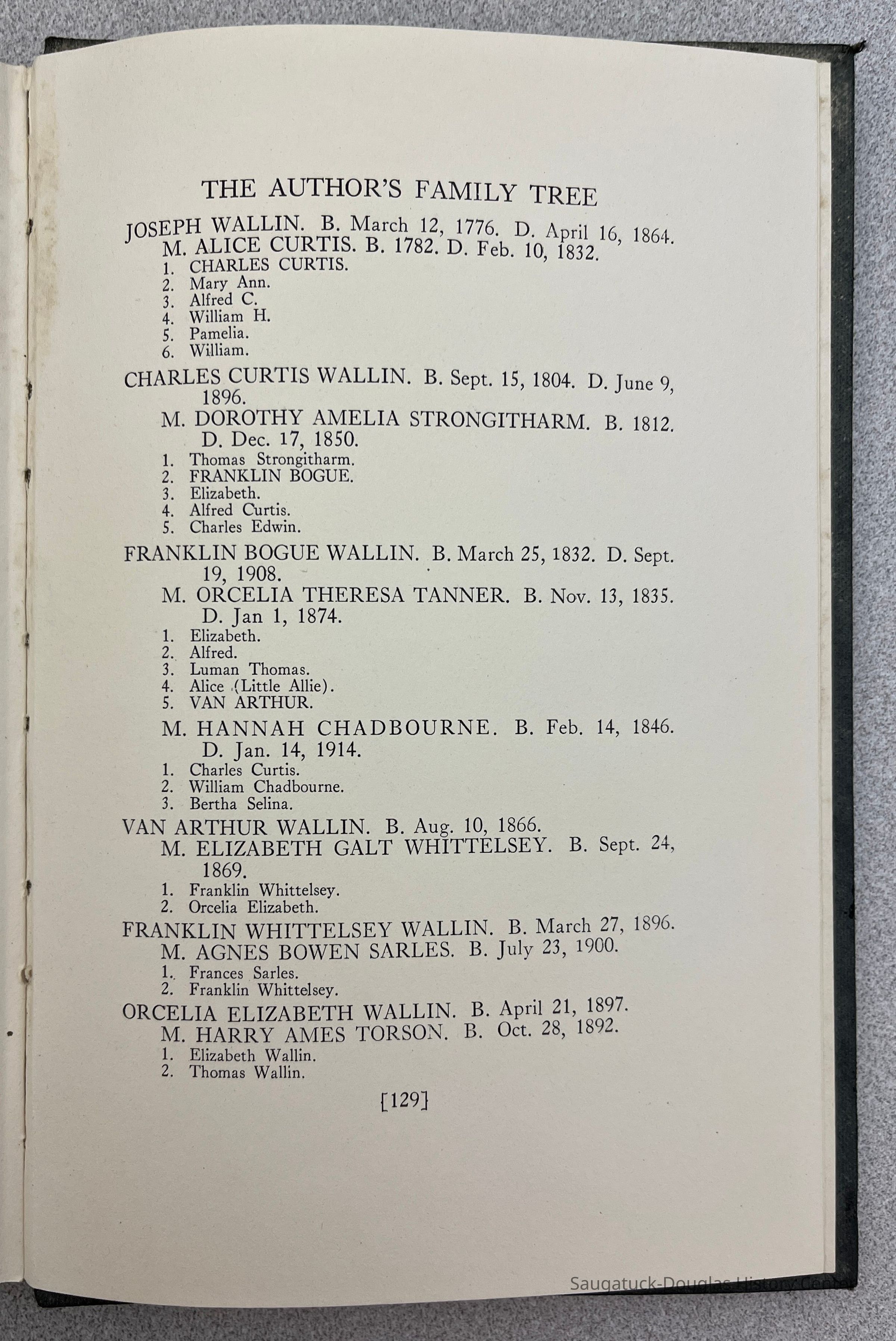 It is one of the most interesting chapters in the book because most of what happened in the Kalamazoo Valley was personally experienced by the author, a son of Franklin B. Wallin. The family was active in the founding of the Saugatuck Congregational Church and Van's description of school days at the old Union school and later at Saugatuck High School is vivid and detailed.