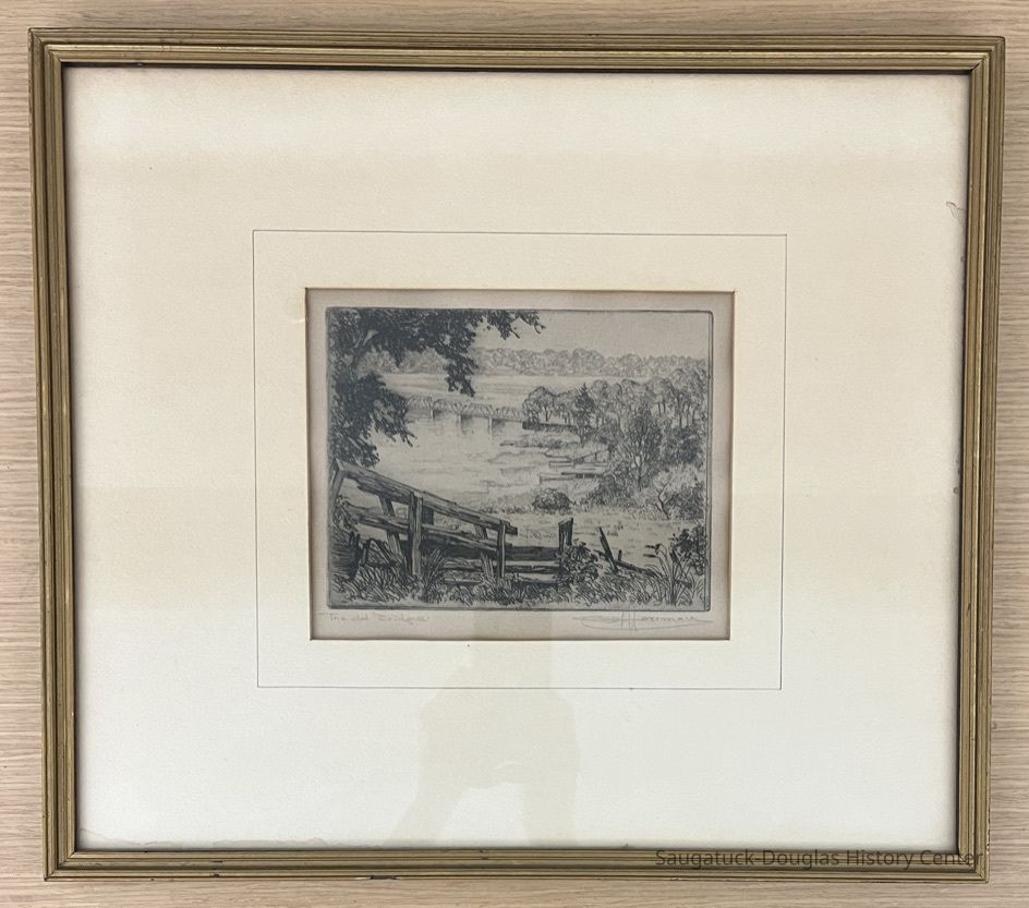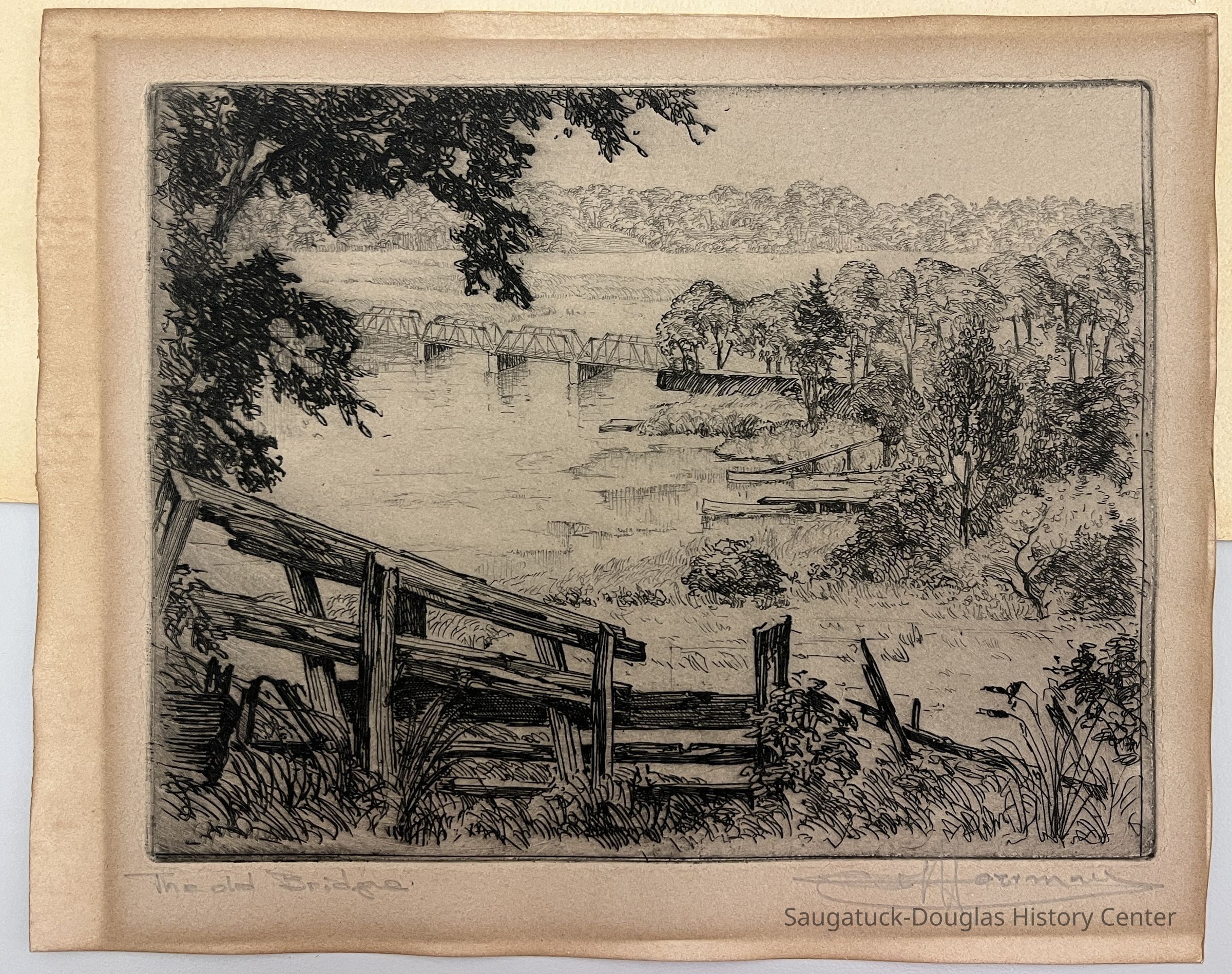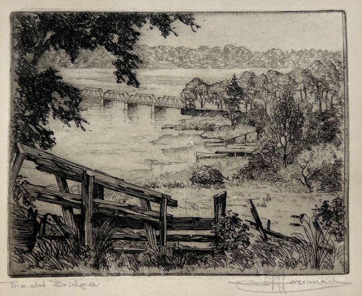 In the foreground, dilapidated timbers. In the distance a wide lake crossed by a truss bridge. The scene may be the causeway and truss bridge, that along with an island and a swing bridge, crossed the Kalamazoo between Saugatuck and Douglas.Type of Print