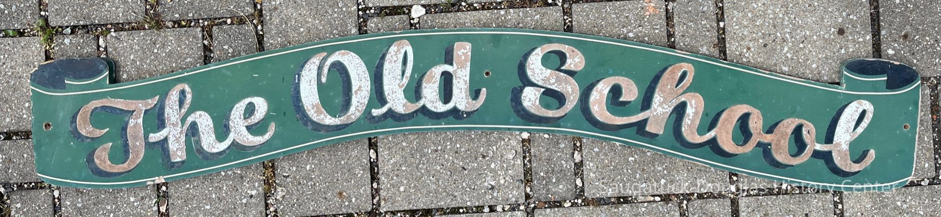 Banner or scroll-shaped sign with green background and white script letters reading "The Old School." The white paint is flaking off.Context