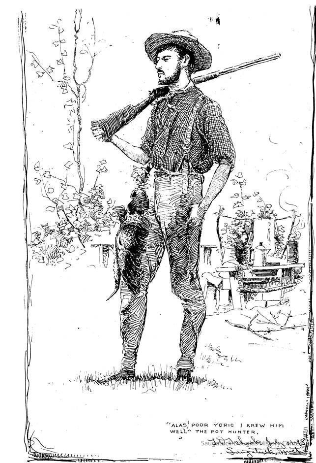 The verse "Alas! Poor Yoric I Knew Him Well" references Shakespeare's Hamlet in a humorous light. "The Pot Hunter" in the title is probably a reference to the pheasant attached to his belt which was destined for the dinner pot.