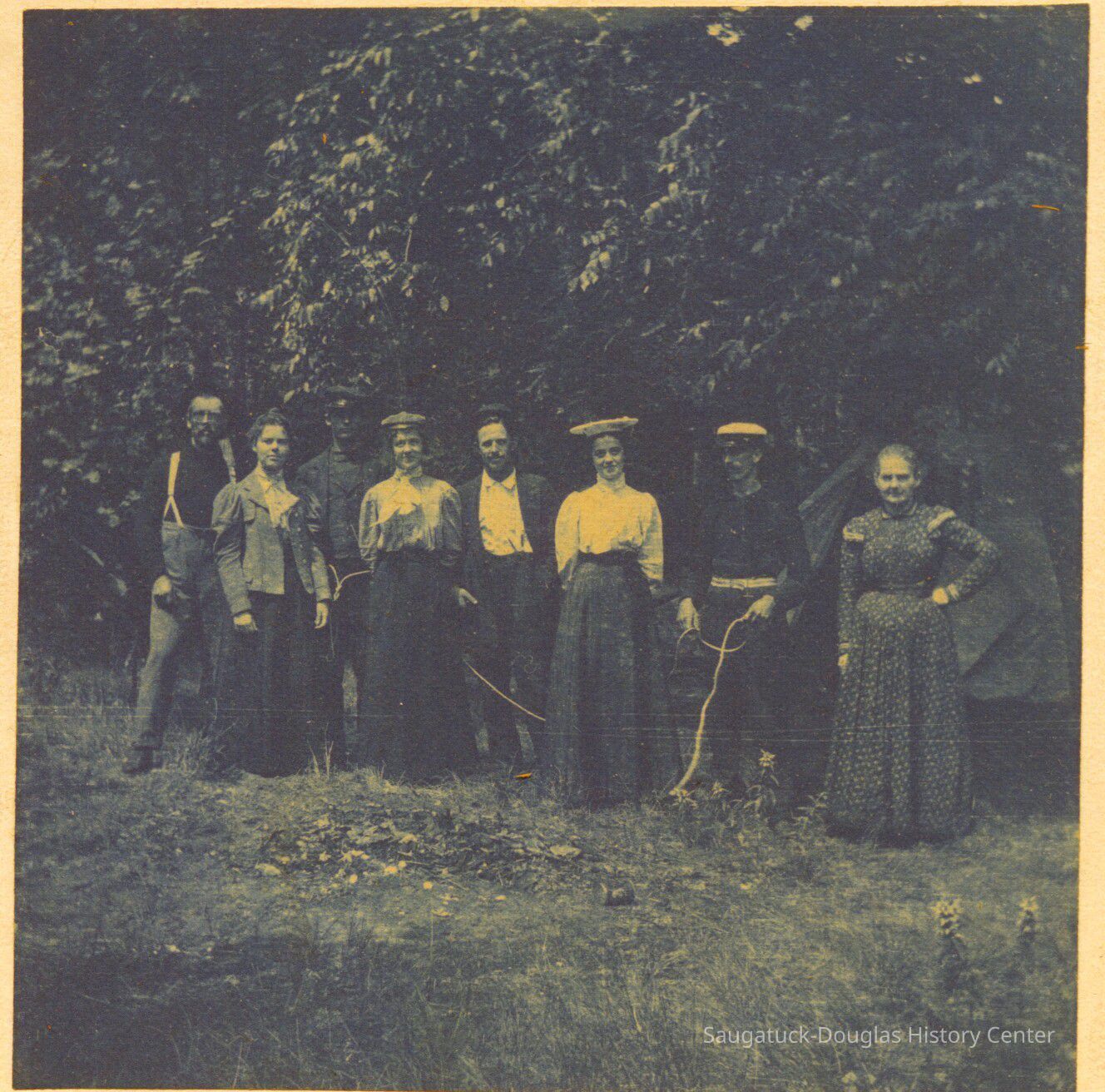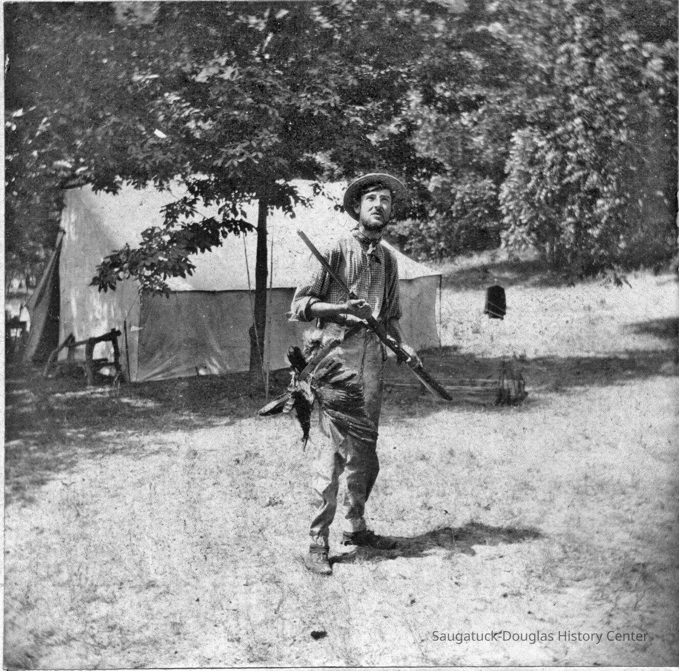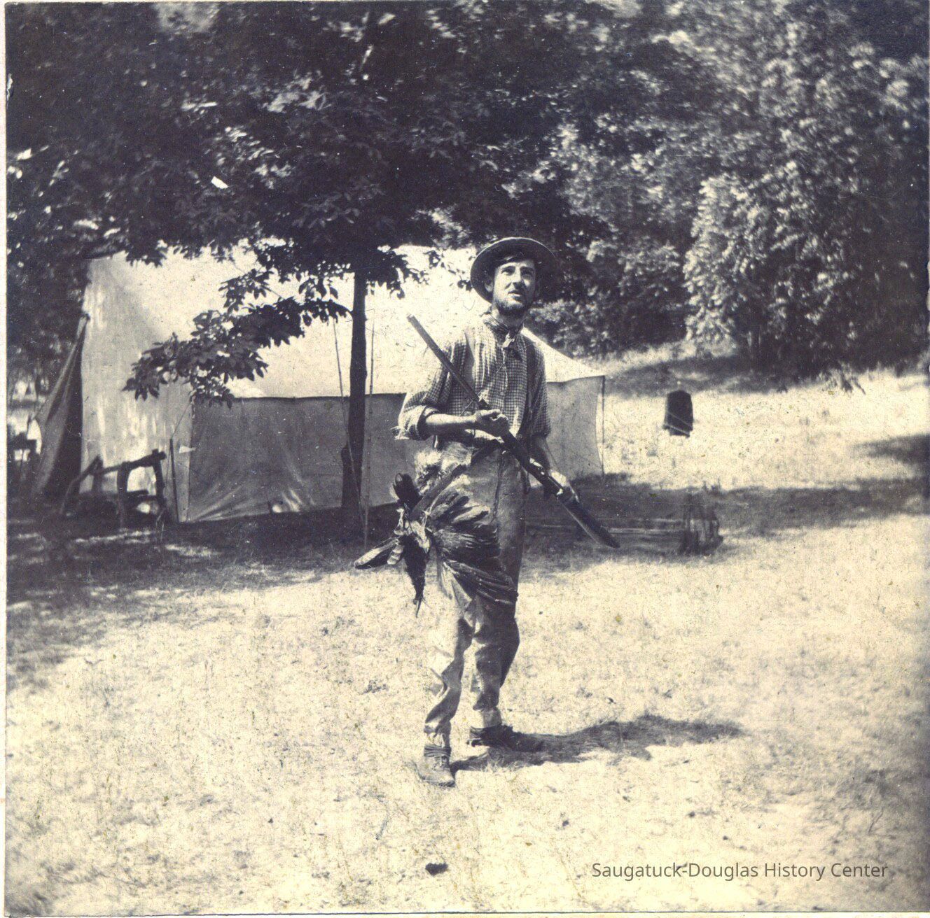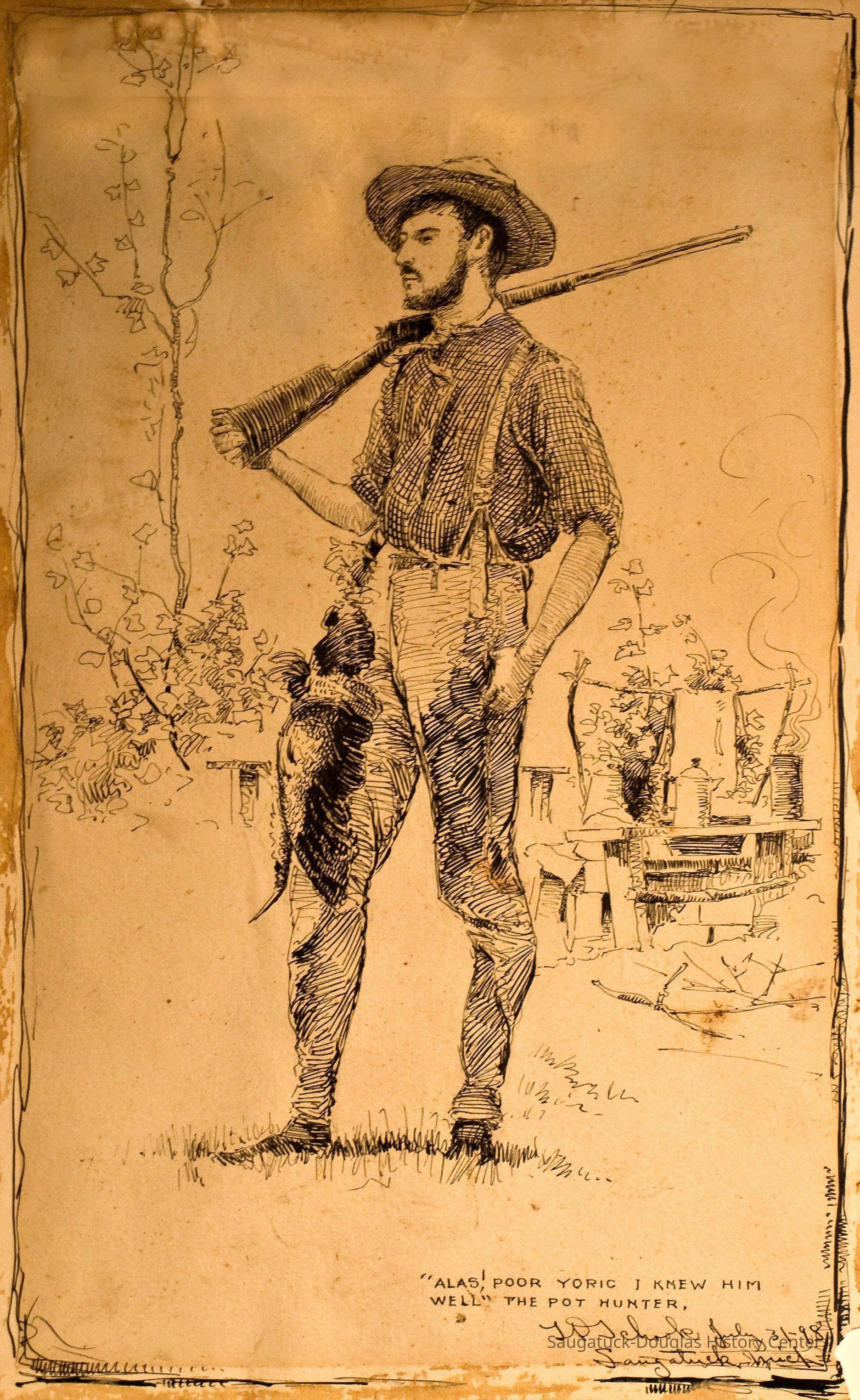 In 1898 a group of artists visited Saugatuck and camped out in the dunes in their own back-to-nature movement. They spent their days painting landscapes and modeling for each other. Here their coffee pot boils in the background as one of their number takes his turn at modeling. "The Pot Hunter" in the title is probably a reference to the bounty attached to his belt which was destined for the dinner pot. They also left many pictures showing the details of their camp and some of the good times they had interacting with the local people.