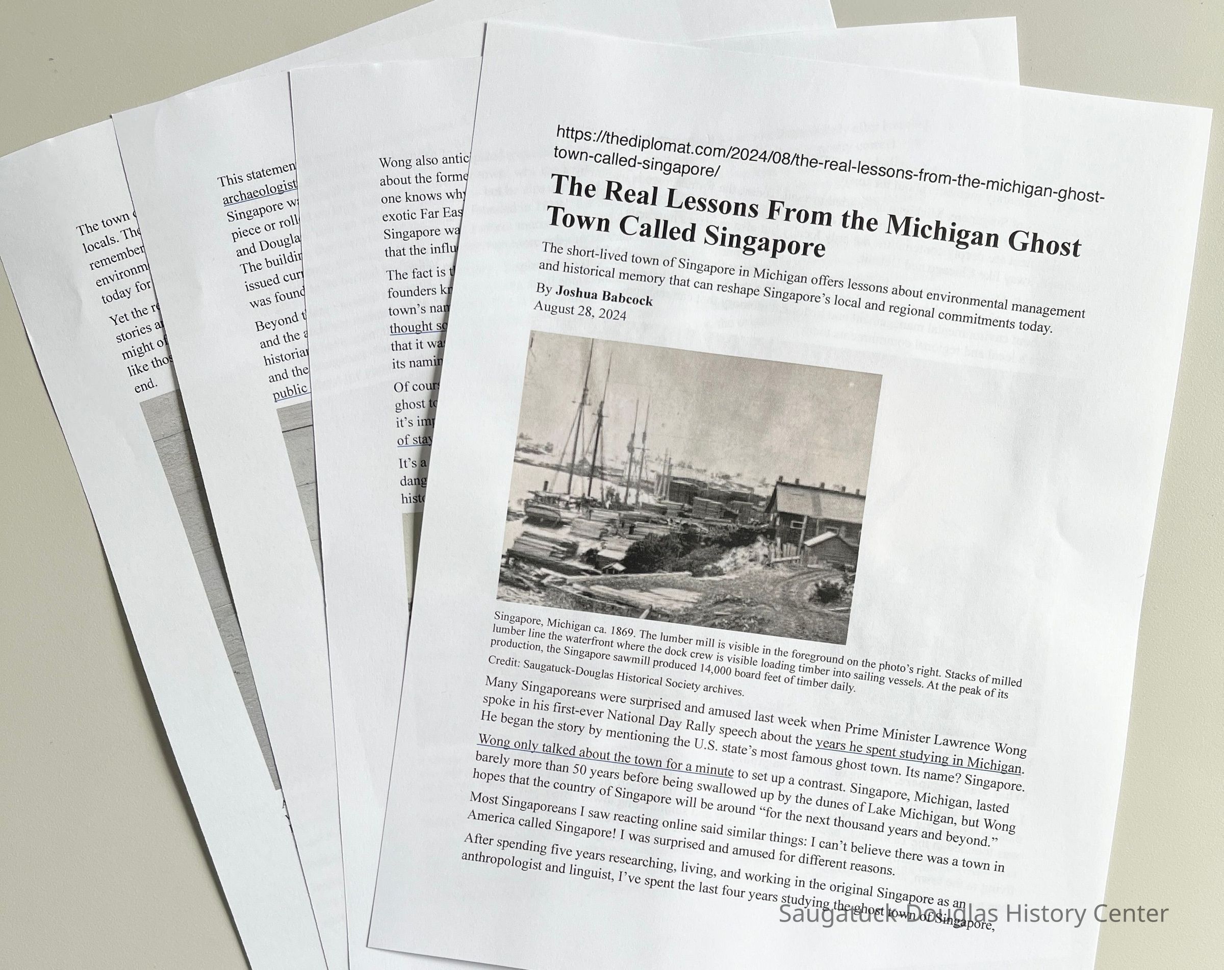 Eight-page color laser-print of an opinion piece posted on the "The Diplomat" website on 28 August, 2024. The essay explores how the fate and meaning of Michigan's Singapore is relevant, or not, to the Republic of Singapore in Asia.Context