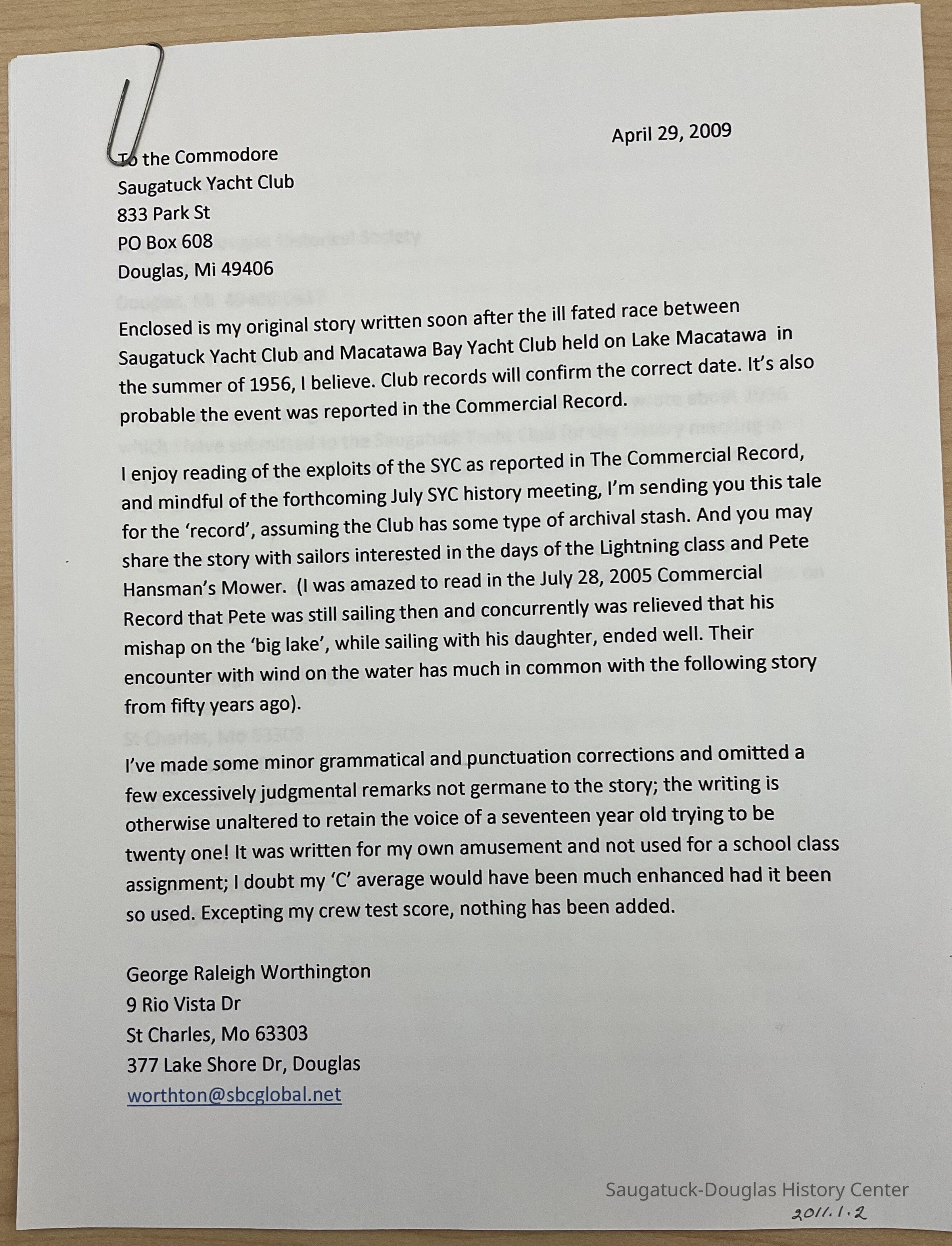 Original story written by George Raleigh Worthington of his ill fated yacht race in 1956. (This contains two cover letters plus the story. It can be downloaded as a MS Word document in 2011.01.01.)Collection