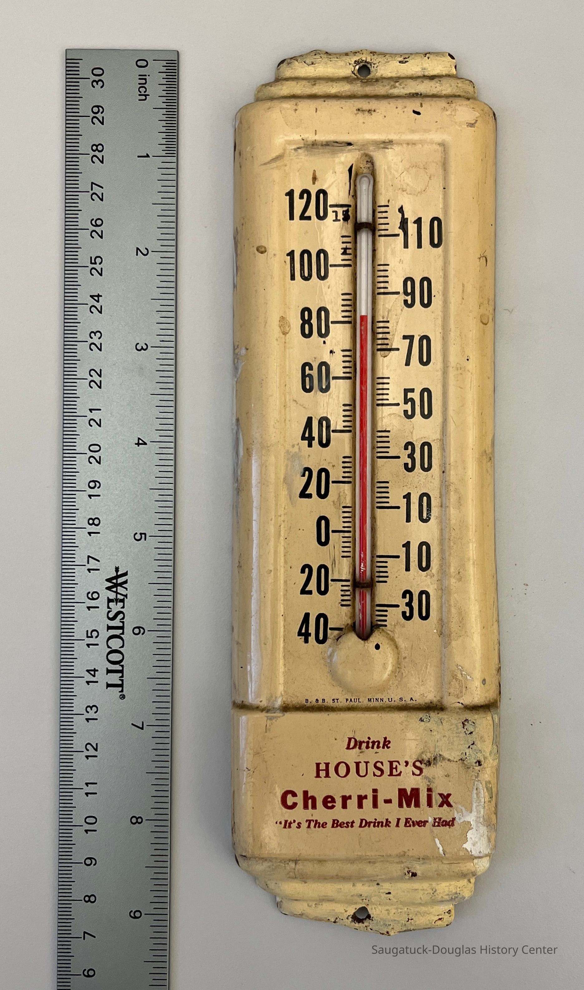 Stamped metal thermometer printed with the slogan "Drink House's Cherri-Mix / It's the best drink I ever had"