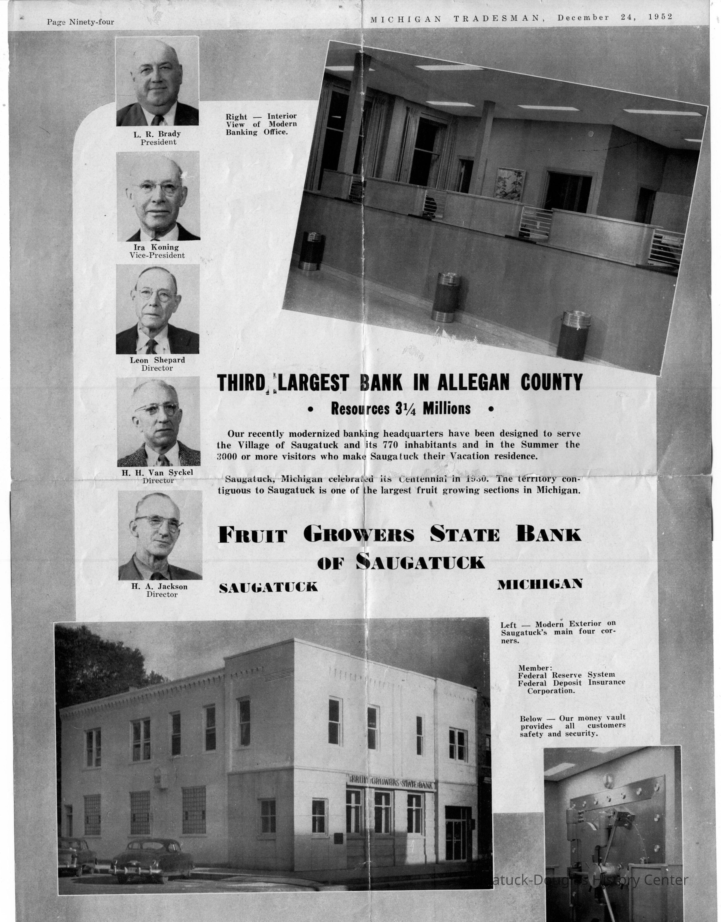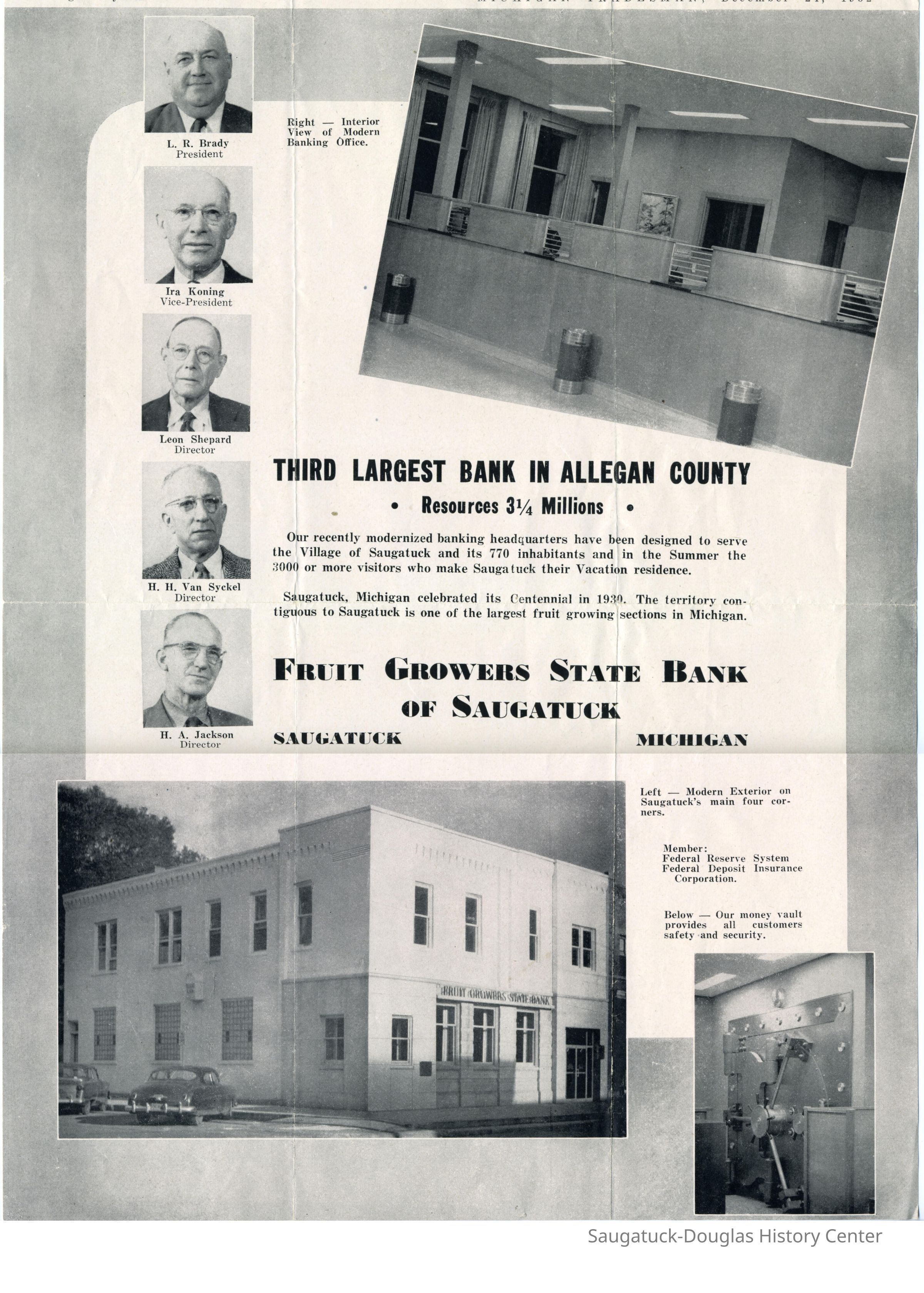 One page flyer advertisement of the Fruit Growers Bank of Saugatuck. People mentioned are officers, L.R. Brady, president; Ira Koning, Vice President; Lean Shepard, Director; H.H. Van Syckel, Director; H.A. Jackson Director 1952Collection
