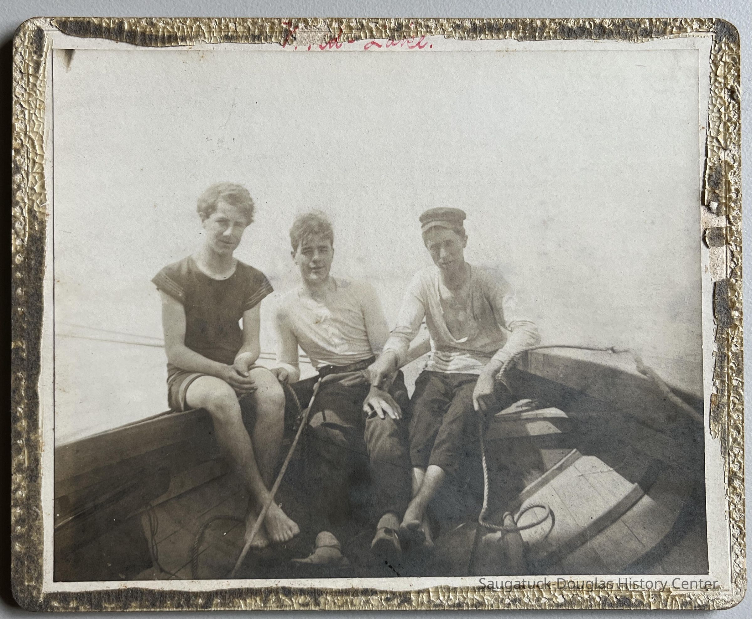 Photographic print of three young men in a wooden boat. Boy at left is barefoot and wearing dark shorts and short sleeve top as if for swimming. Boy at right is wearing a cap and holds the boat's tiller and a rope. Glue residue around the edge of the image suggest it was once glued in a mat.