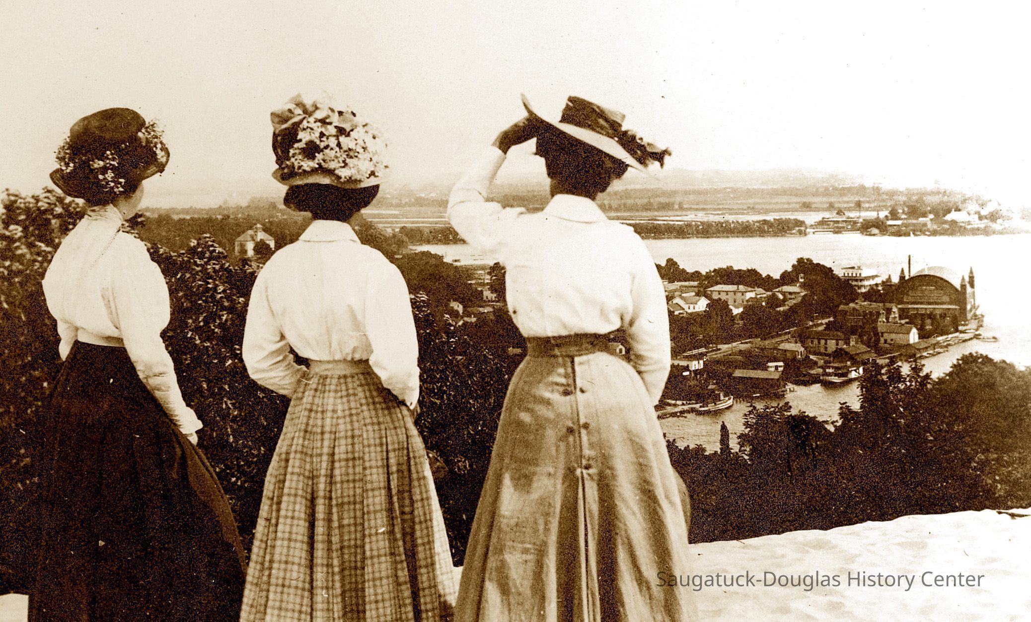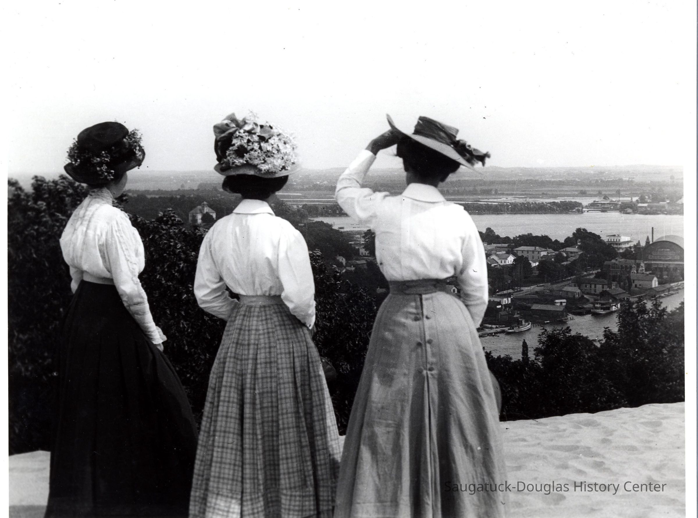 Three woman with up-swept hair, hats and corseted waists gaze at Saugatuck from the top of Mound Baldhead. The Big Pavilion and Hotel Butler are visible in the distance.Photograph Details