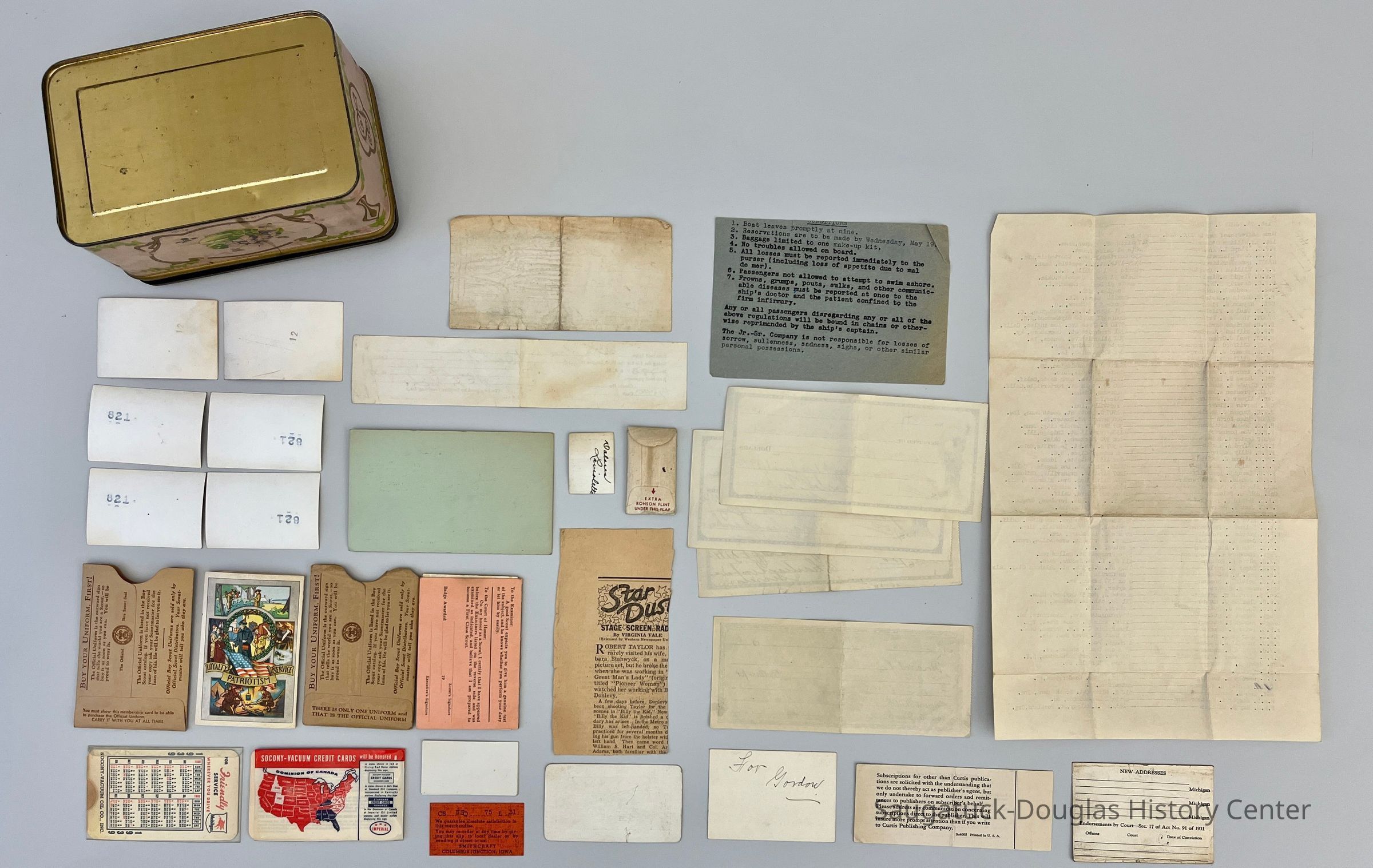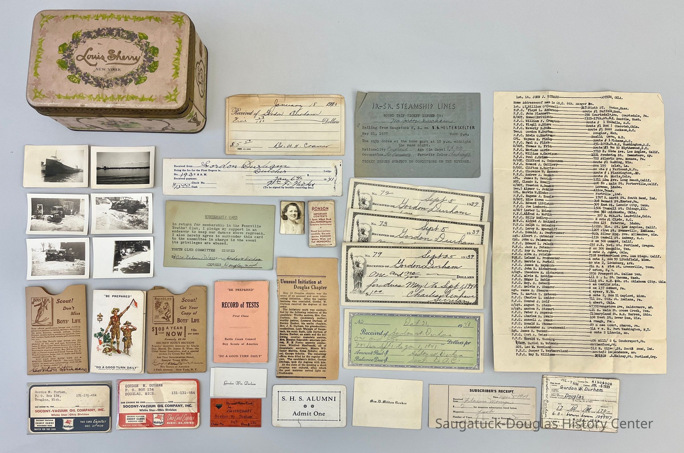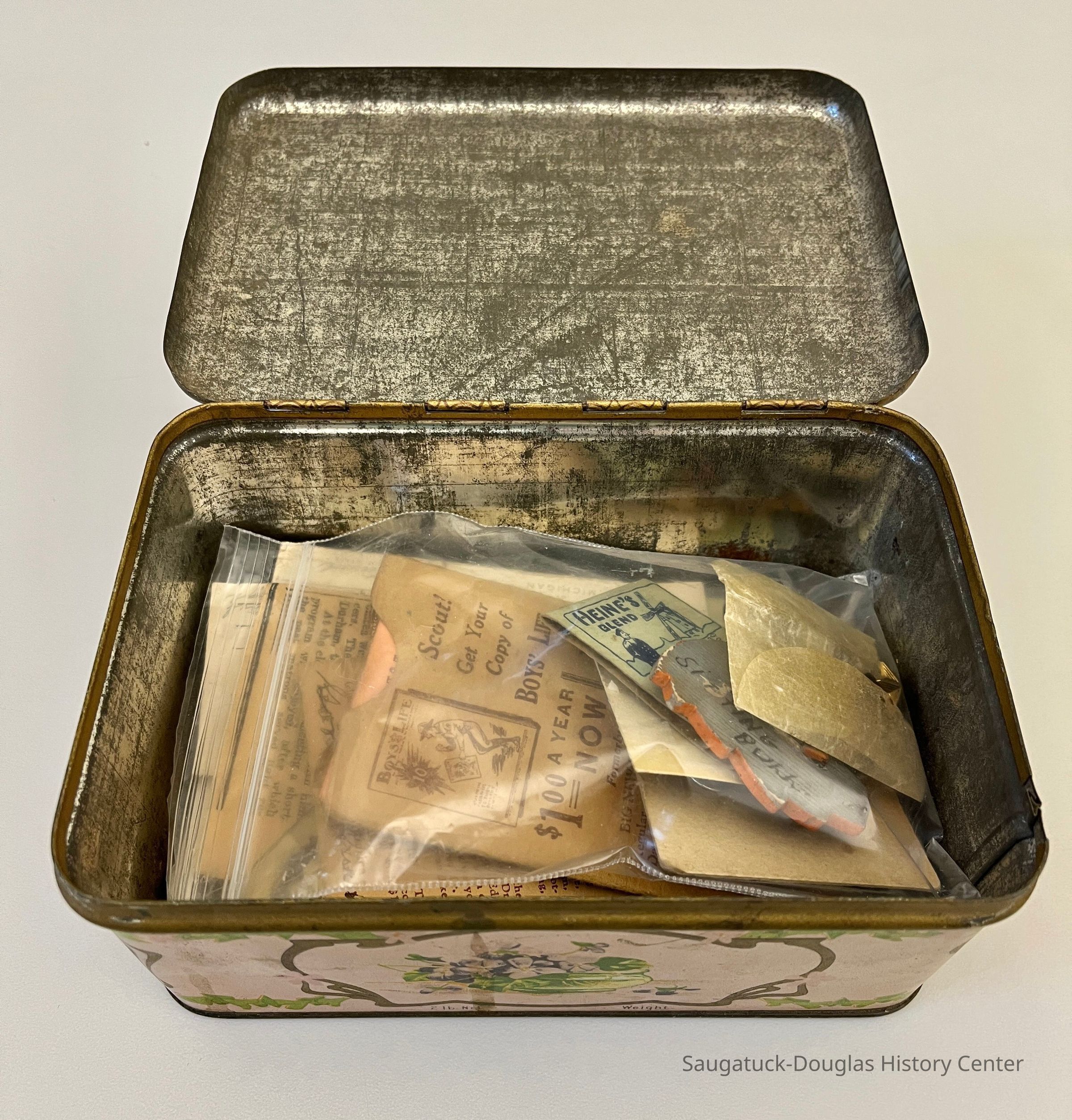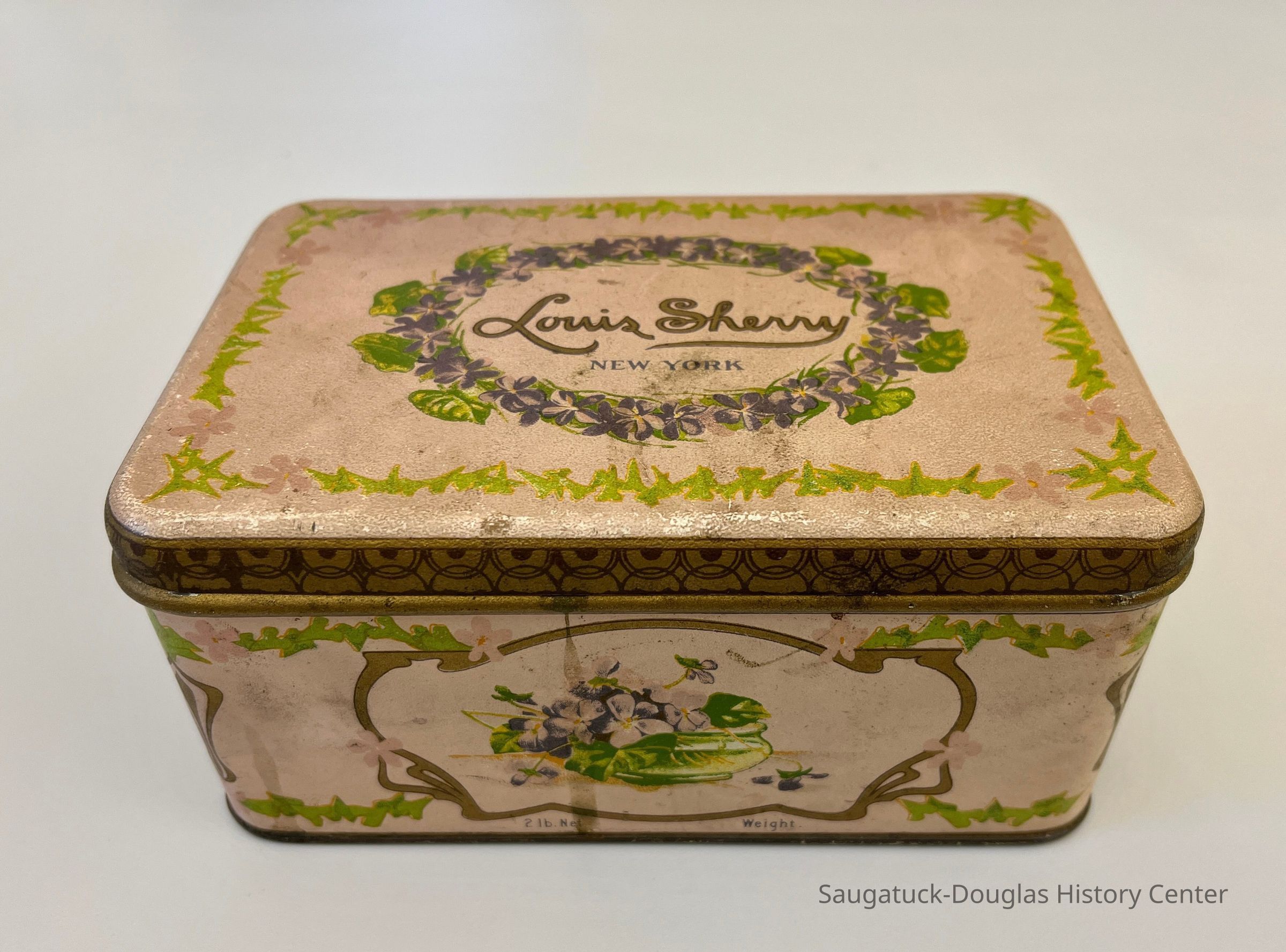 Pink-painted, metal Louis Sherry chocolates tin adorned with violets. The tin contains a variety of small mementos belonging to Gordon Durham of Douglas.