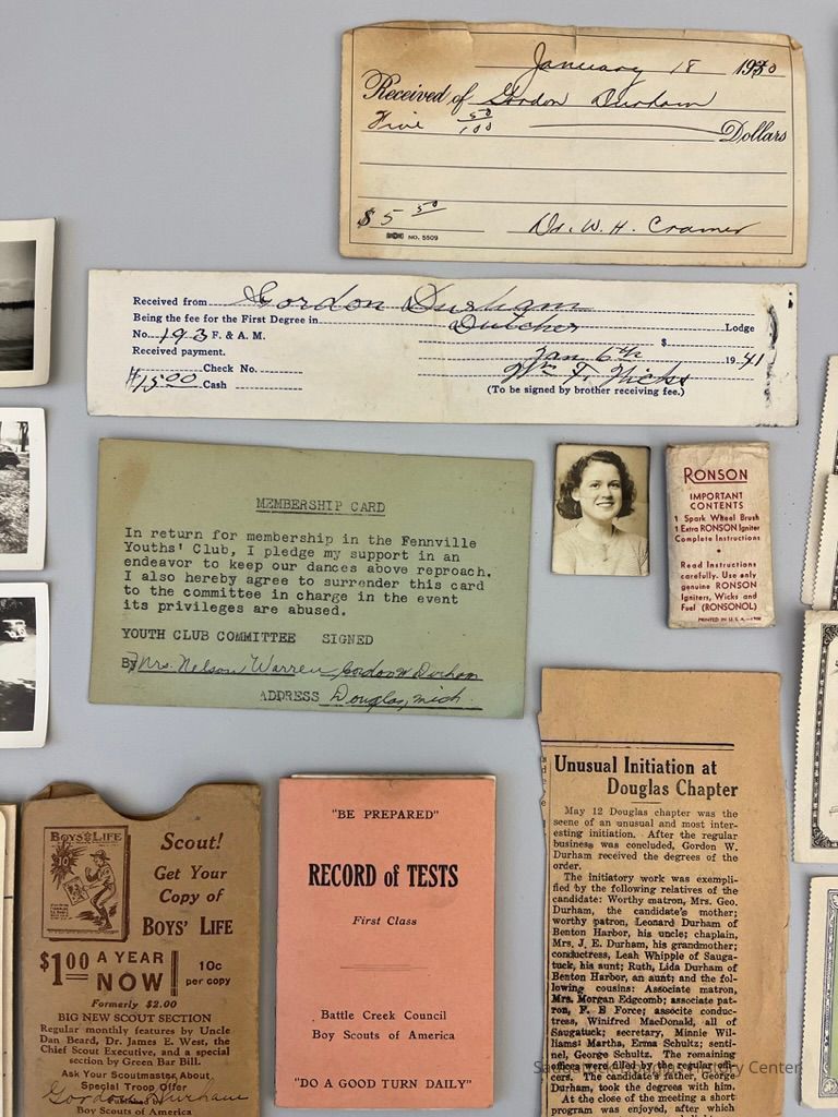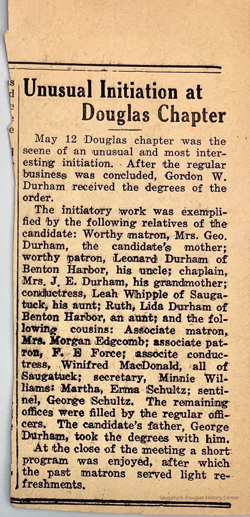 Newspaper Clipping "Unusual Initiation at Douglas Chapter" that lists Mrs. George Durham, Leonard Durham, Mrs. J.E. Durham, Leah Whipple, Ruth?, Lida Durham, Mrs. Morgan Edgcomb, R.B. Force, Winifred MacDonald, Minne Williams, Erma Schultz, George Schultz and George Durham. No date.