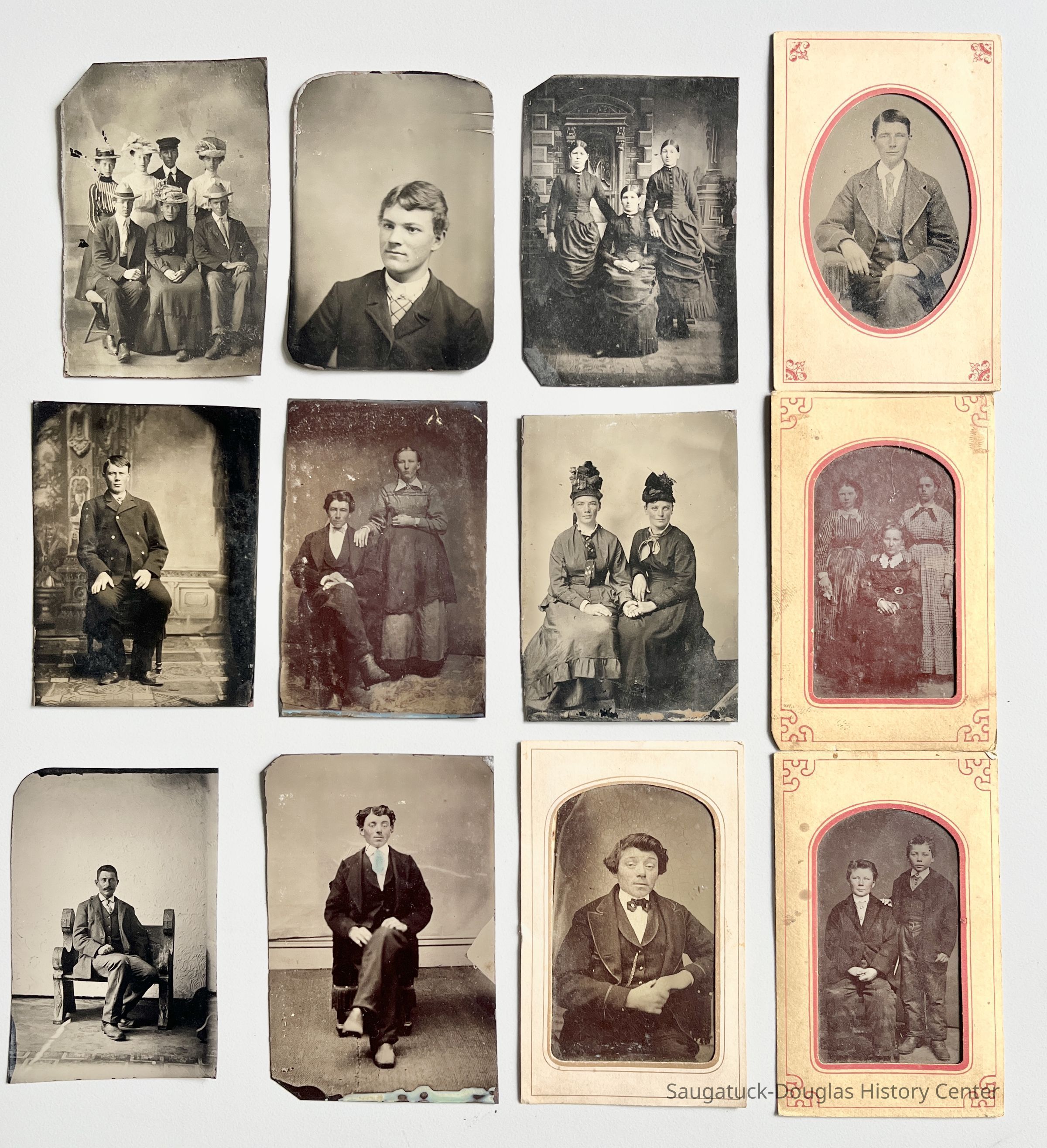 12 tintype photos of individual sitters, couples and groups. Four of the photos have decorative paper mats. The backs of the images are blank or completely black. Two photos are of the same man. Two photos have matching mats.Photograph Details