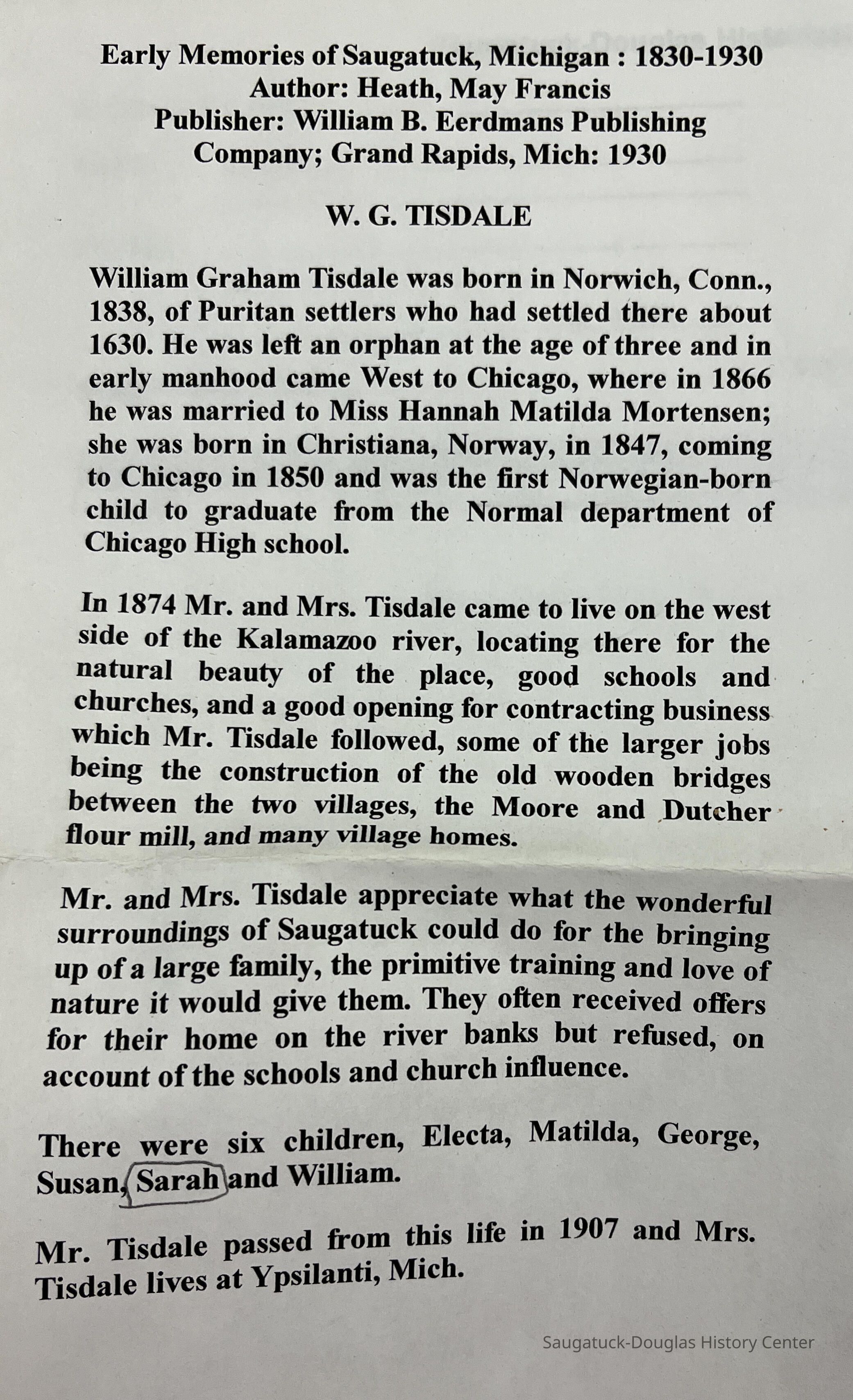 Included with book is copy of Tisdale-family information from May Heath's "Early Memories of Saugatuck" that recounts that William Graham Tisdale and Hannah Matilda (Mortensen) Tisdale who came to the Saugatuck area in 1874. The couple had six children: Electa, Matilda, George, Susan, Sarah and William. The album contains entries that being "Dear Susie."
