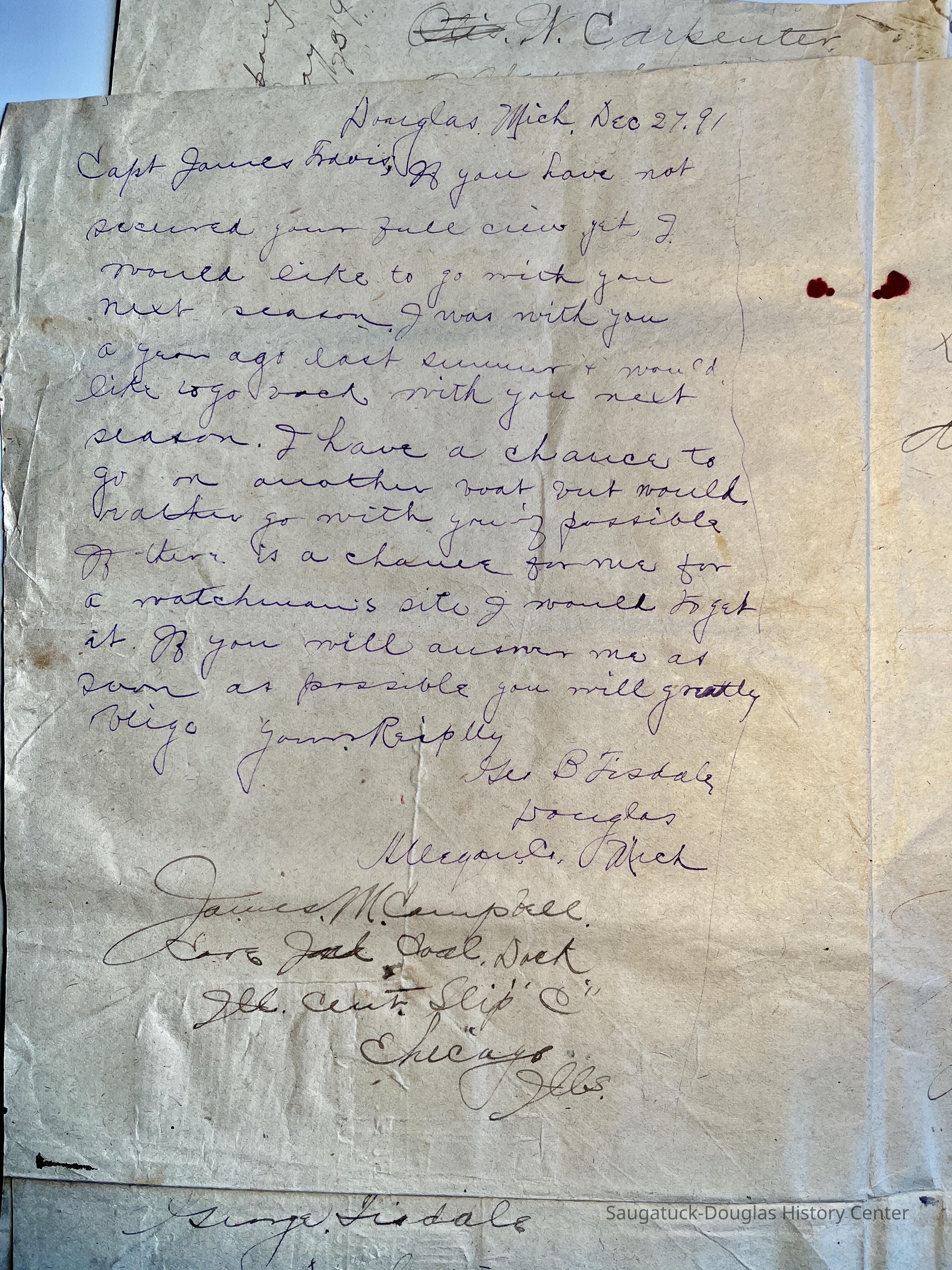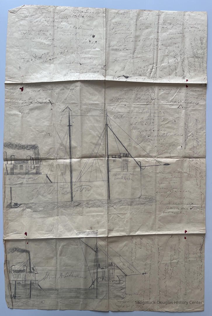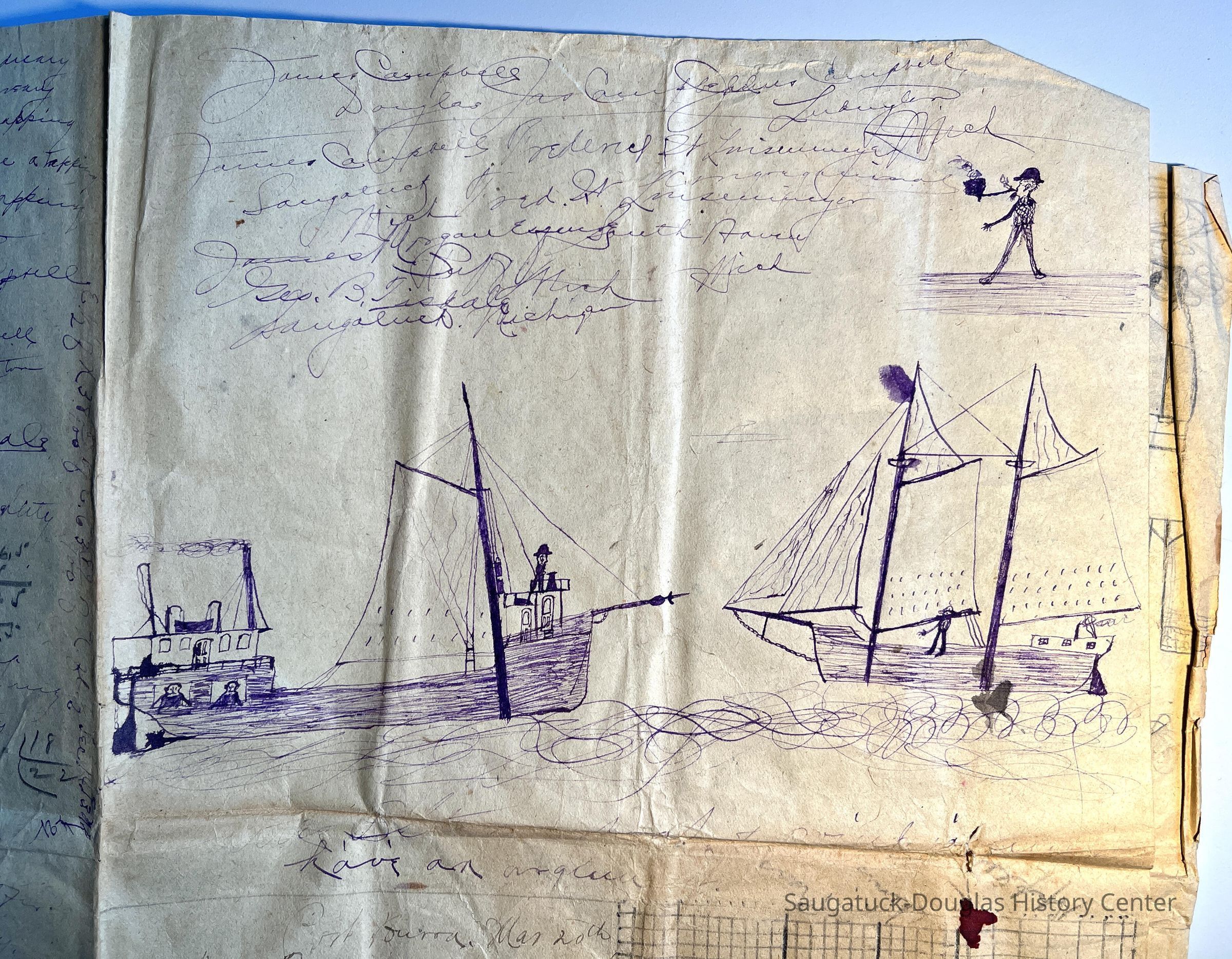 Large sheet of paper, folded in quarters, covered with drawings of ships, signature practice, draft employment letter dated 1891, a grid, transcriptions of The Raven by Edgar Allen Poe and doodles attributed to Captain George B. Tisdale.