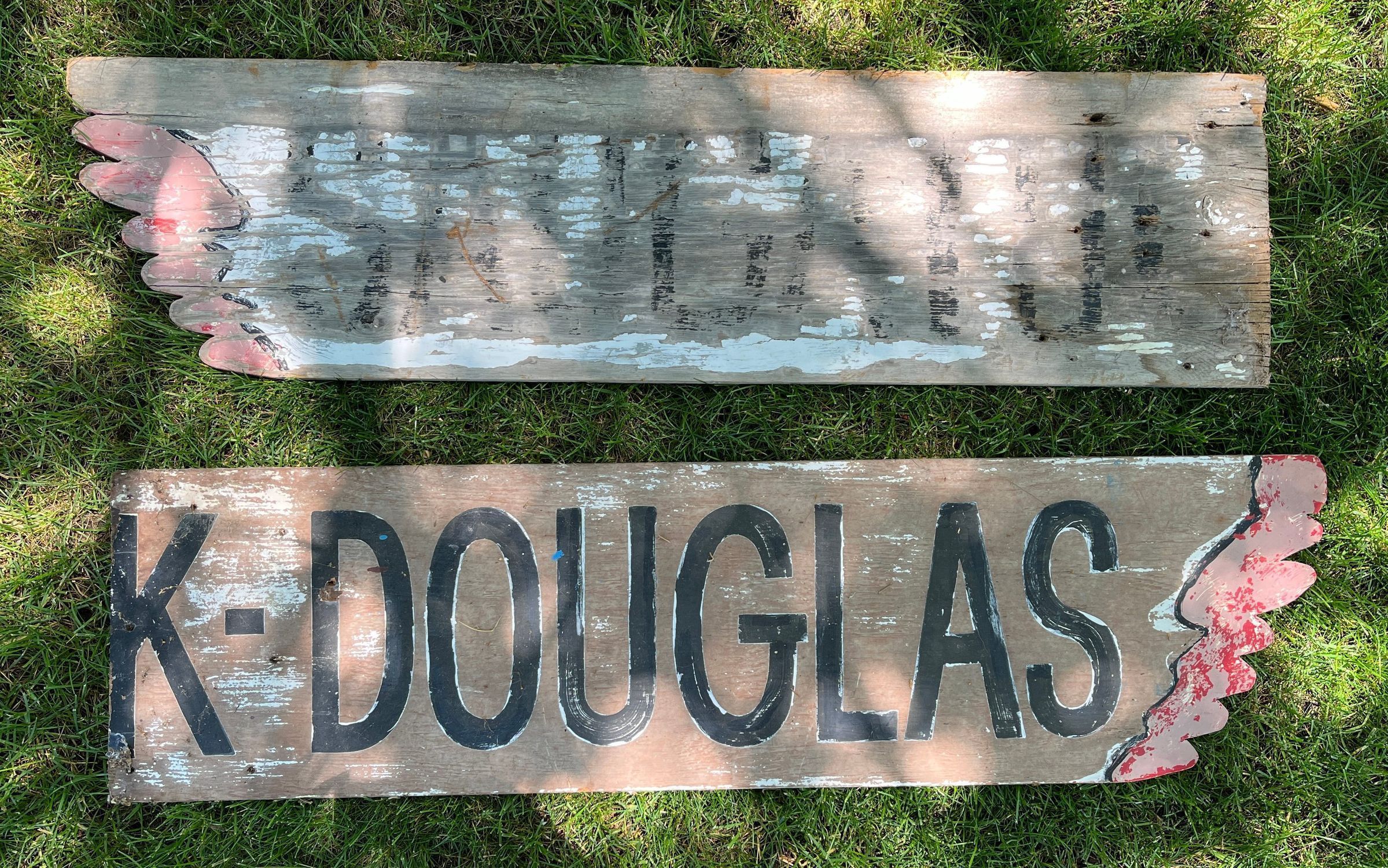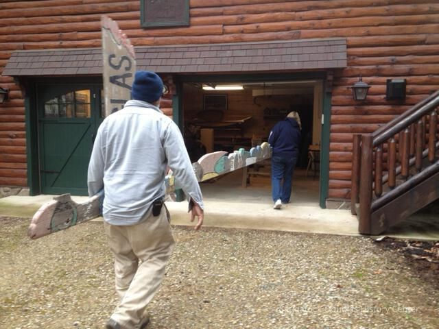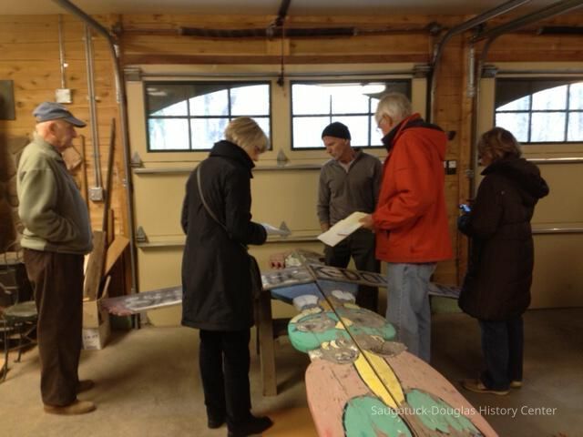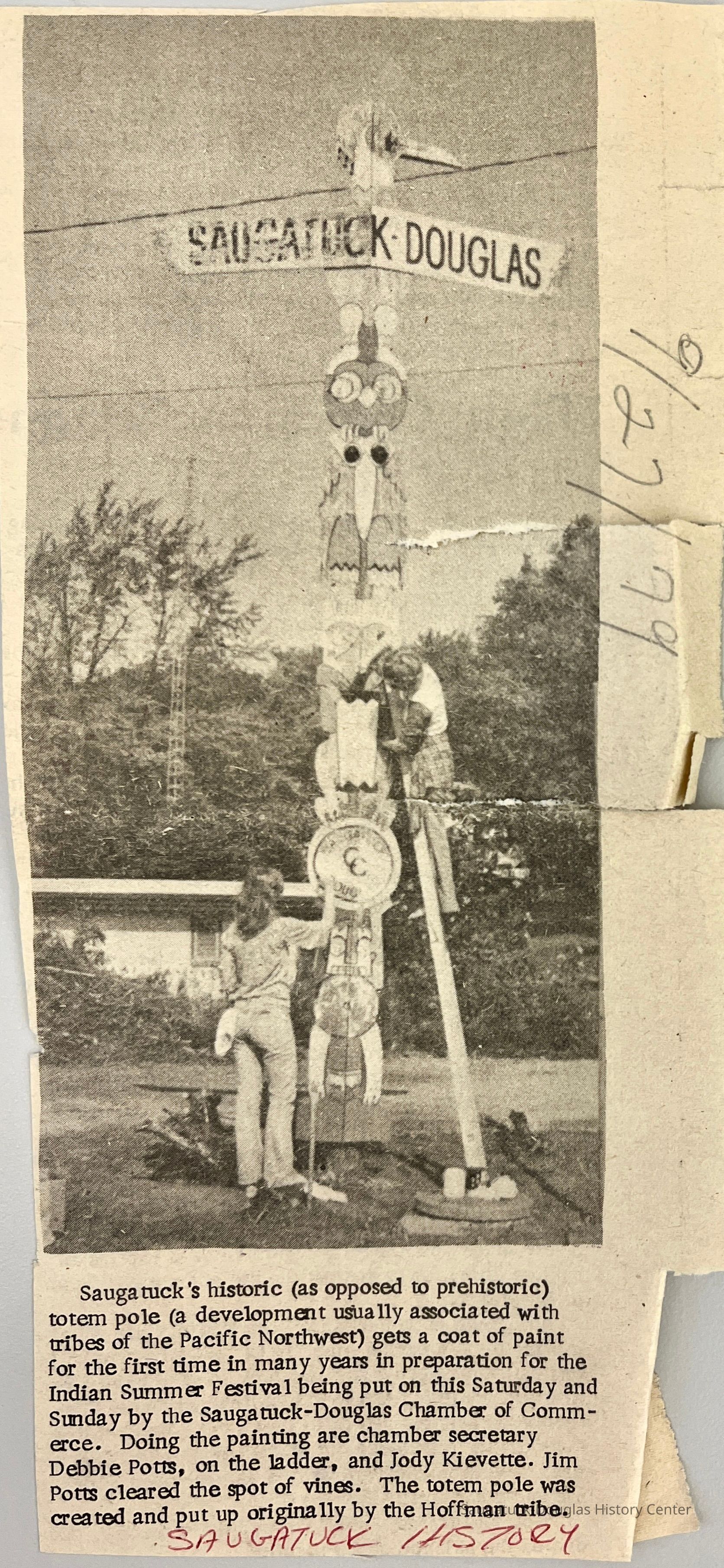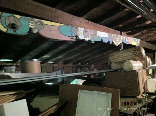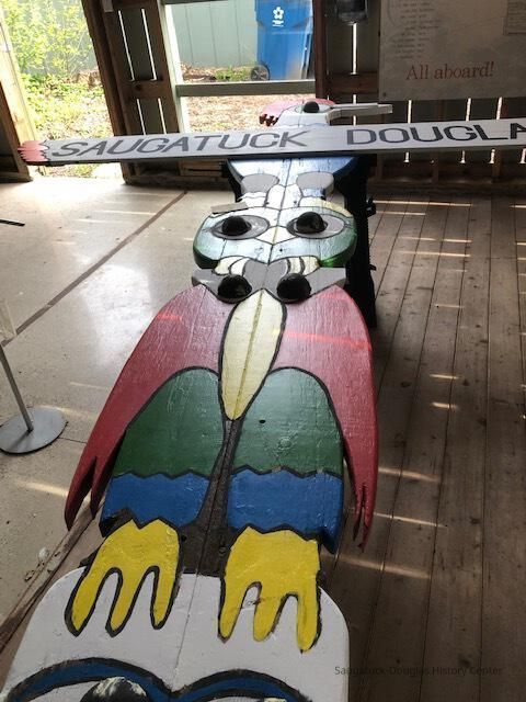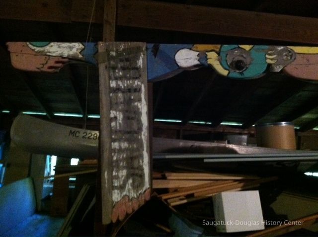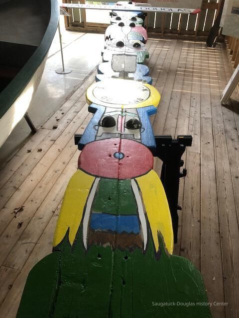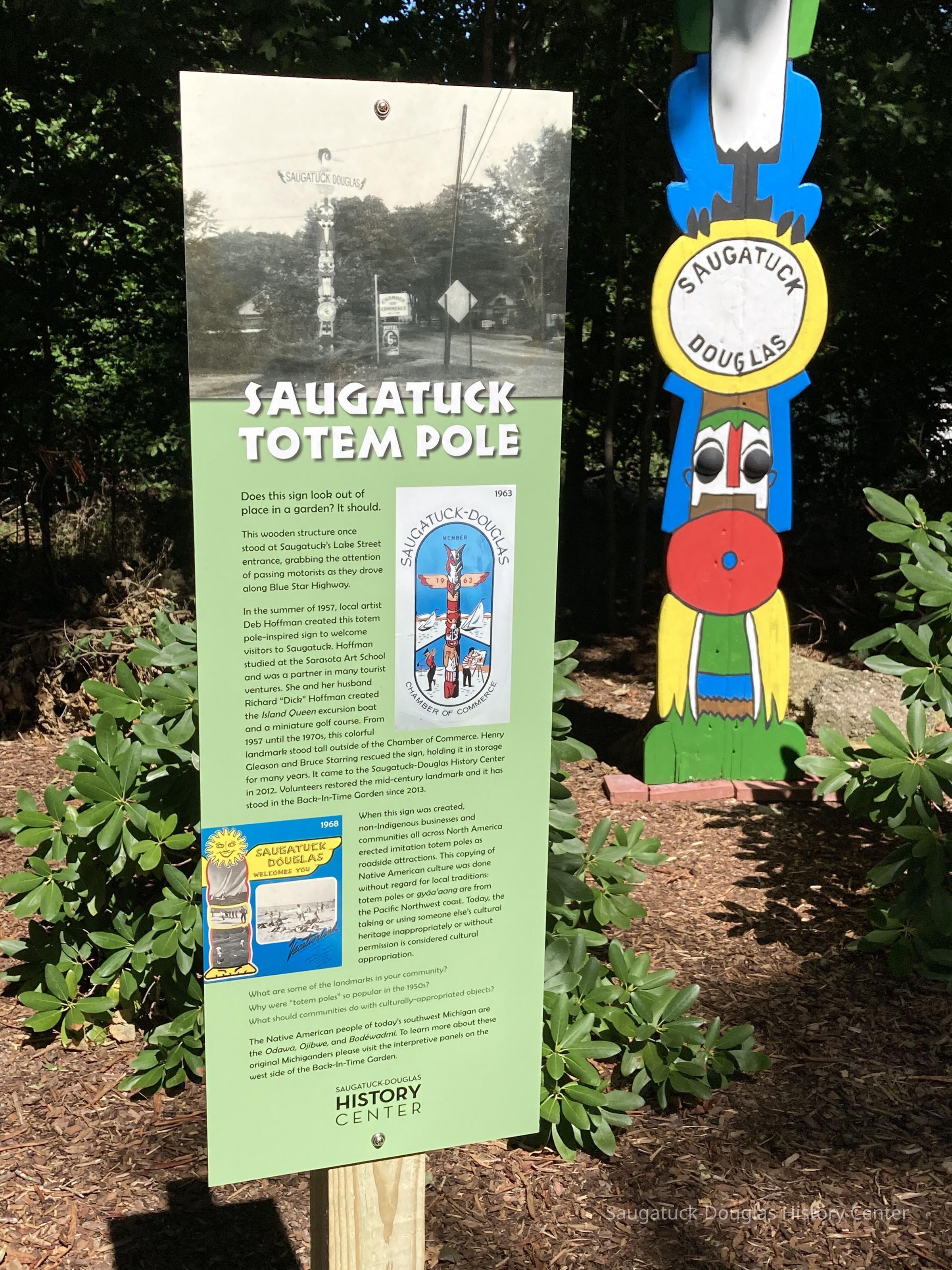 In the summer of 1957, local artist Deb Hoffman created this totem pole-inspired sign to welcome visitors to Saugatuck. Hoffman studied at the Sarasota Art School and was a partner in many tourist ventures. She and her husband Richard “Dick” Hoffman created the Island Queen excursion boat and a miniature golf course. From 1957 until the 1970s, this colorful landmark stood tall outside of the Chamber of Commerce. Henry Gleason and Bruce Starring rescued the sign, holding it in storage for many years. It came to the Saugatuck-Douglas History Center in 2012. Volunteers restored the mid-century landmark and it has stood in the Back-In-Time Garden since 2013.