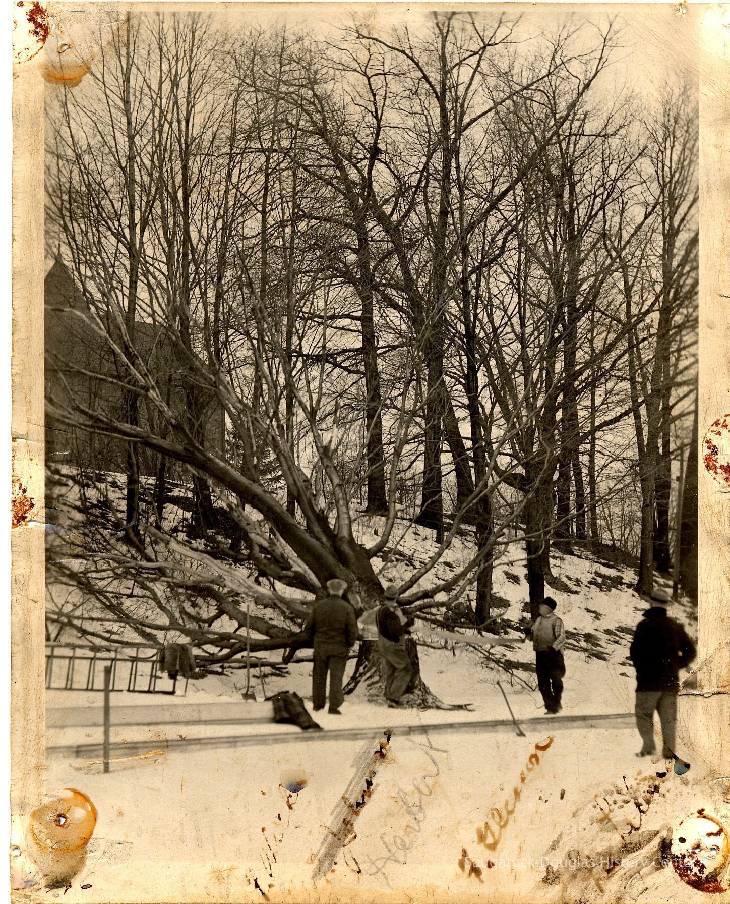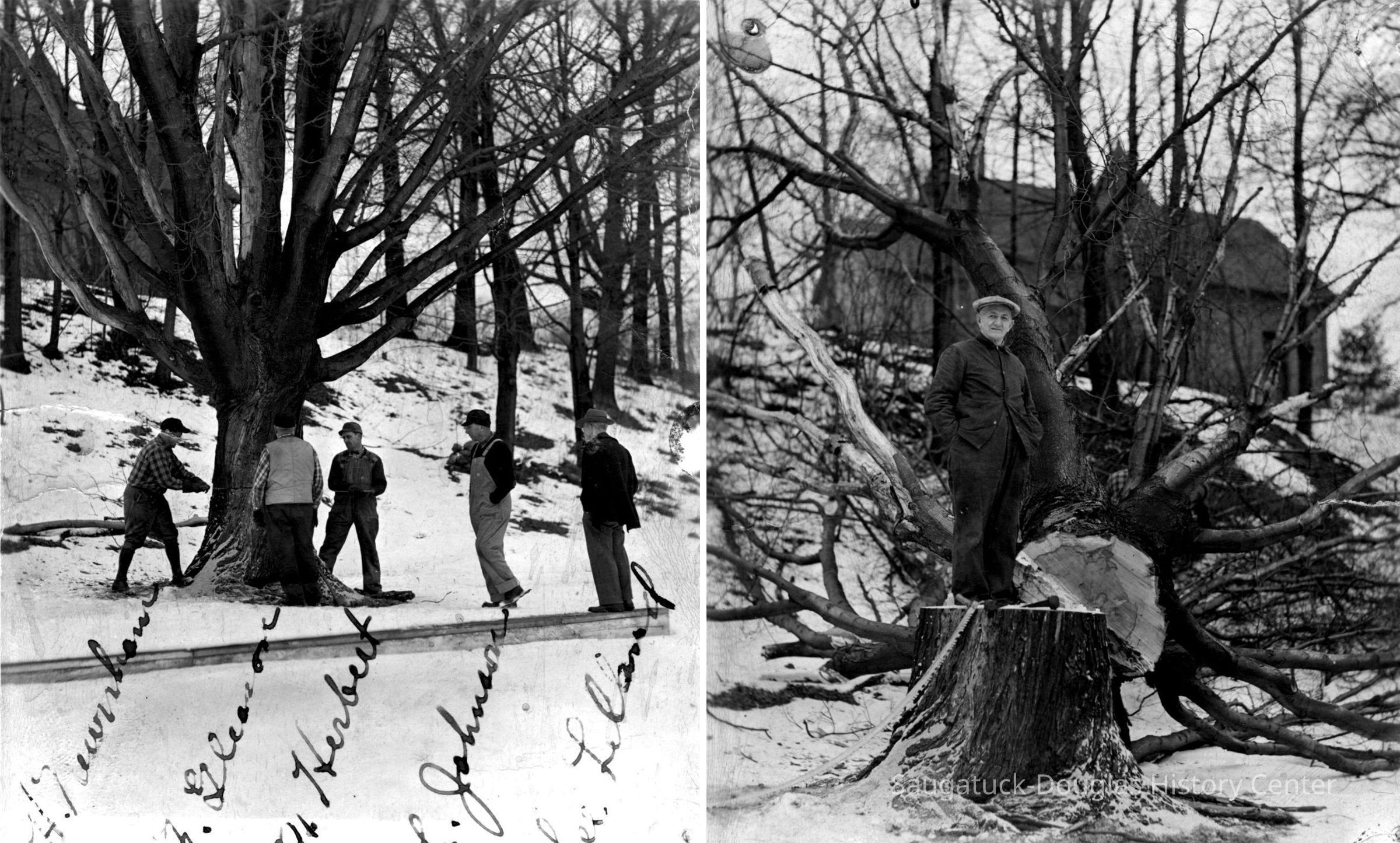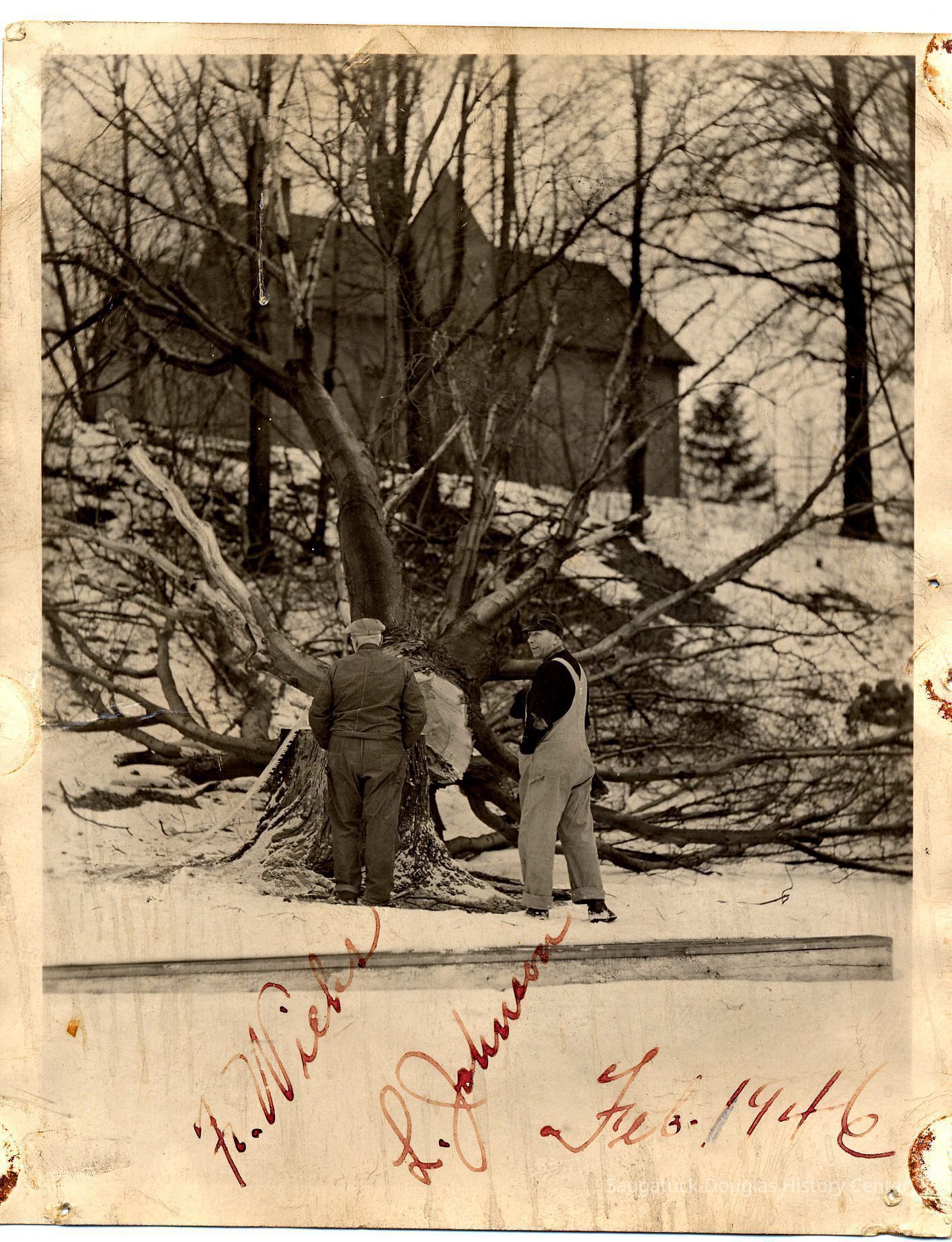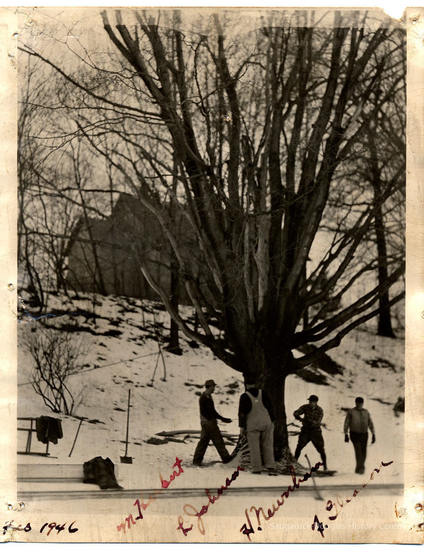 Frank Wicks, L. Johnson, F. Gleason, M. Herbert and H. Newnham break out the old lumbering tools to cut down a large tree, Feb. 1946Photograph Details