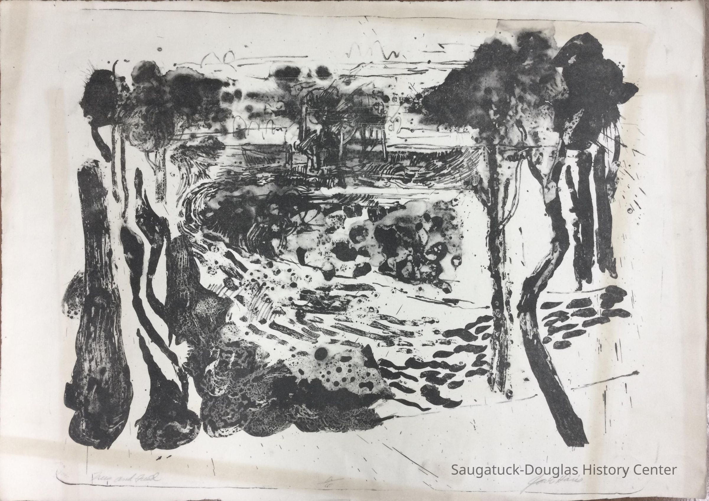 This large 25x20 lithograph by Ox-Bow student Jack Harris. The scene it depicts is one in the countryside, where a rough road stretches to the left side of the print. Therefore it could be a local scene, as it shows agriculture of this area. The artist's style is abstracted and emphasizes heavy mark making, especially in the trees that frame the outside of the print.Type of Print