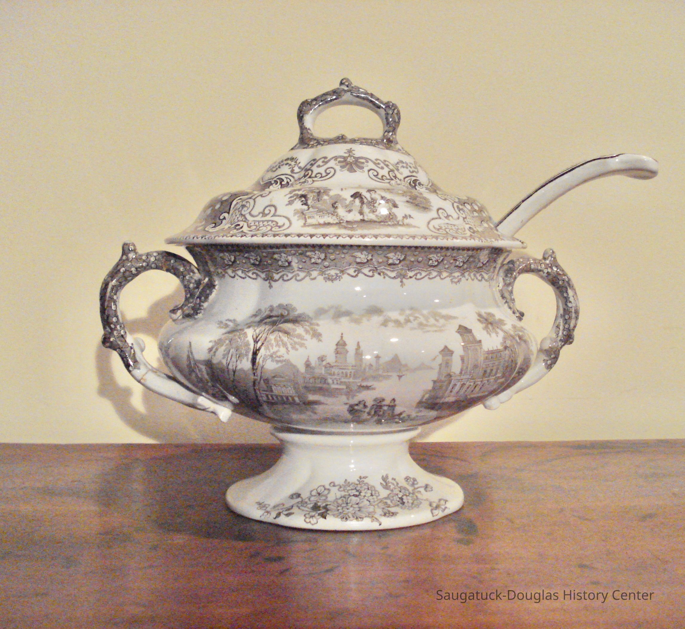 White ceramic soup tureen with lid and ladle. The tureen is decorated with brown transfer designs in floral and exotic city scape motifs.Context