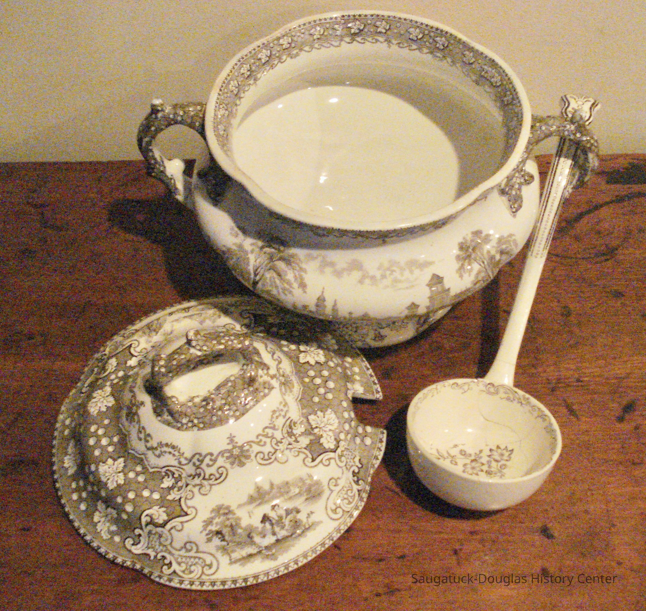 The tureen's ladle was broken when the object was donated to the SDHS. Vic Bella repaired the ladle for use in the museum exhibit.Relationships