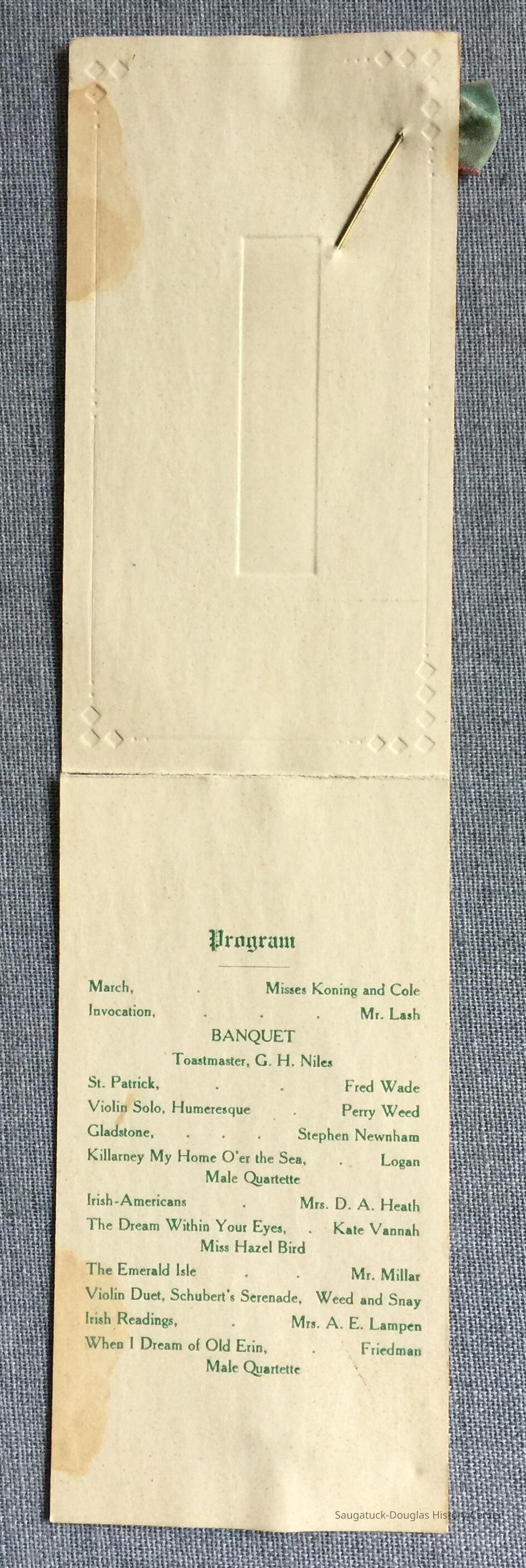 The inside of the card lists the musical selections and performers for the banquets entertainment which had an Irish and/or St. Patrick's Day theme.